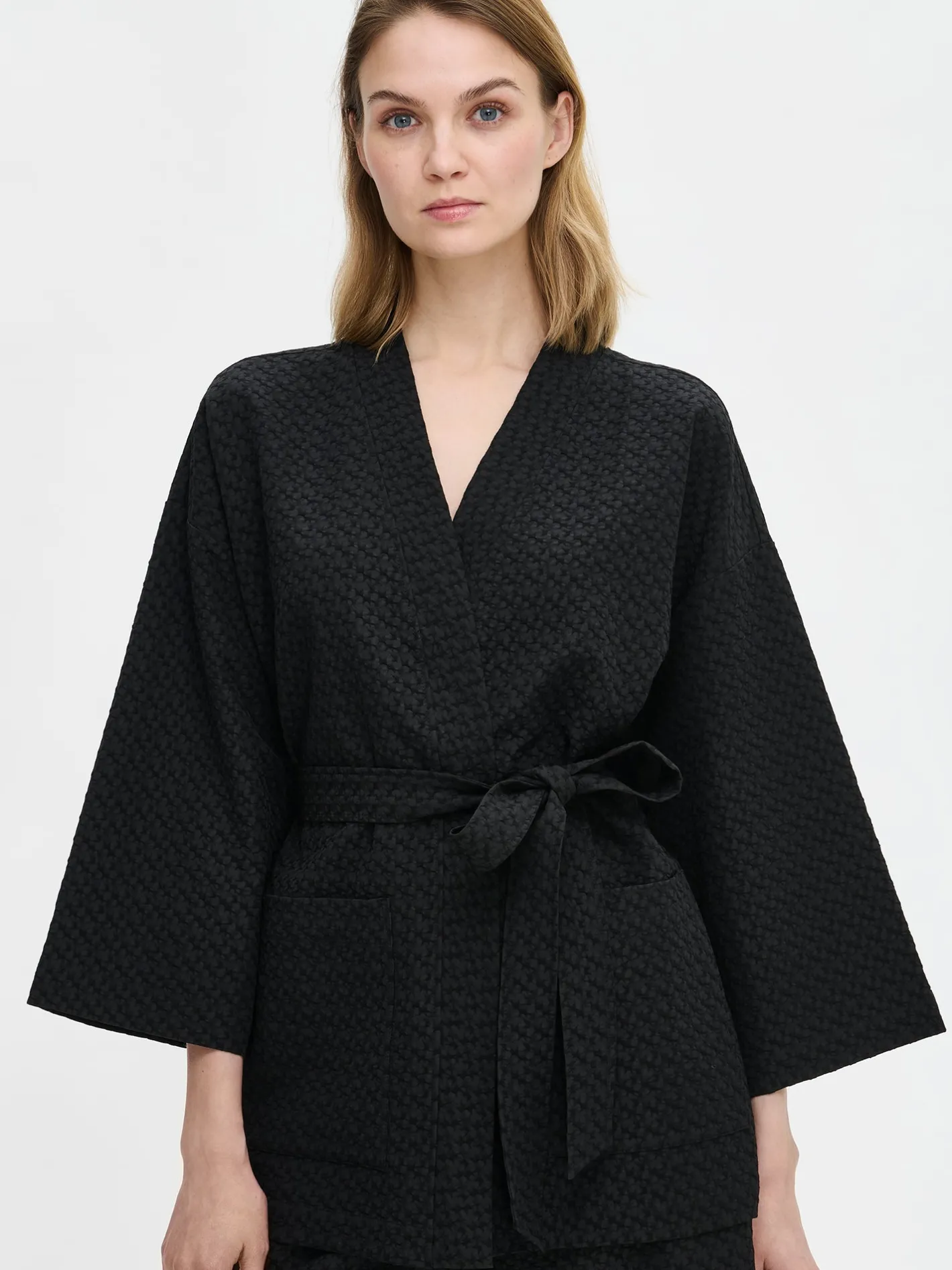 Naisten musta Reliefi-takki kauniilla struktuuripinnalla ja vyöllä. Ihana kimonotakki sopii niin juhlaan kuin arkeen – yhdistä se vaikkapa samanvärisen Reliefi-hameeseen tai mekkoon. Kimonomallisen takin pääntie ja miehustan reunat on viimeistelty leveällä listalla. Takissa on pudotettu olkalinja ja suoralinjaiset hihat. Edessä on päälle ommellut taskut ja vyötäröllä vyölenkeillä kiinnitetty vyö. Takin pituus koossa M on noin 77 cm. Materiaali on miellyttävän tuntuista kudottua polyesteri-viskoosi-elastaani-kangasta, jossa on kaunis pintastruktuuri. Materiaalille on ominaista 3-5 % kutistuminen ensimmäisessä pesussa. Suosittelemme tuotteen pesua ennen käyttöä, koska tuotteesta saattaa irrota väriä ennen ensimmäistä pesua.