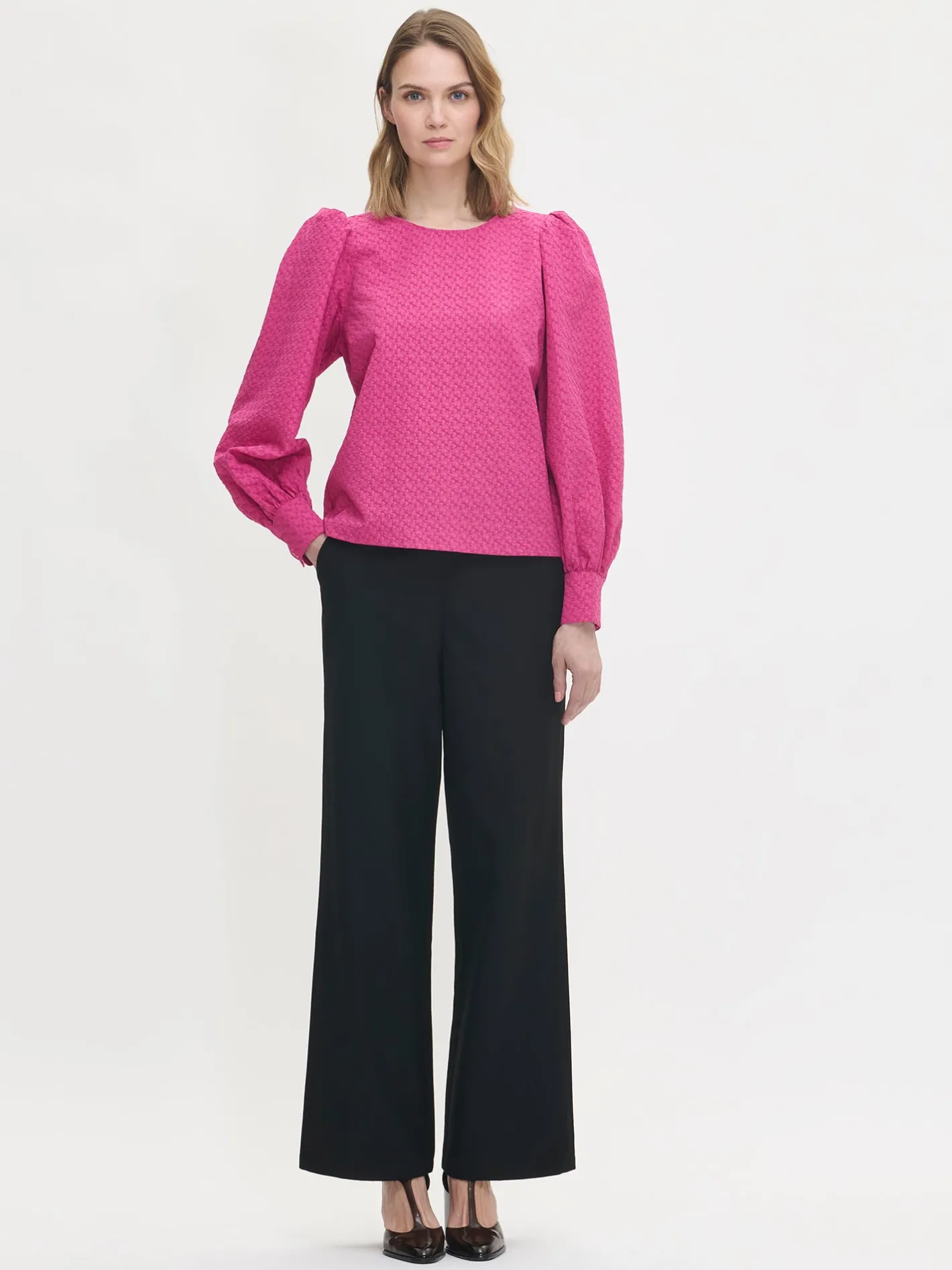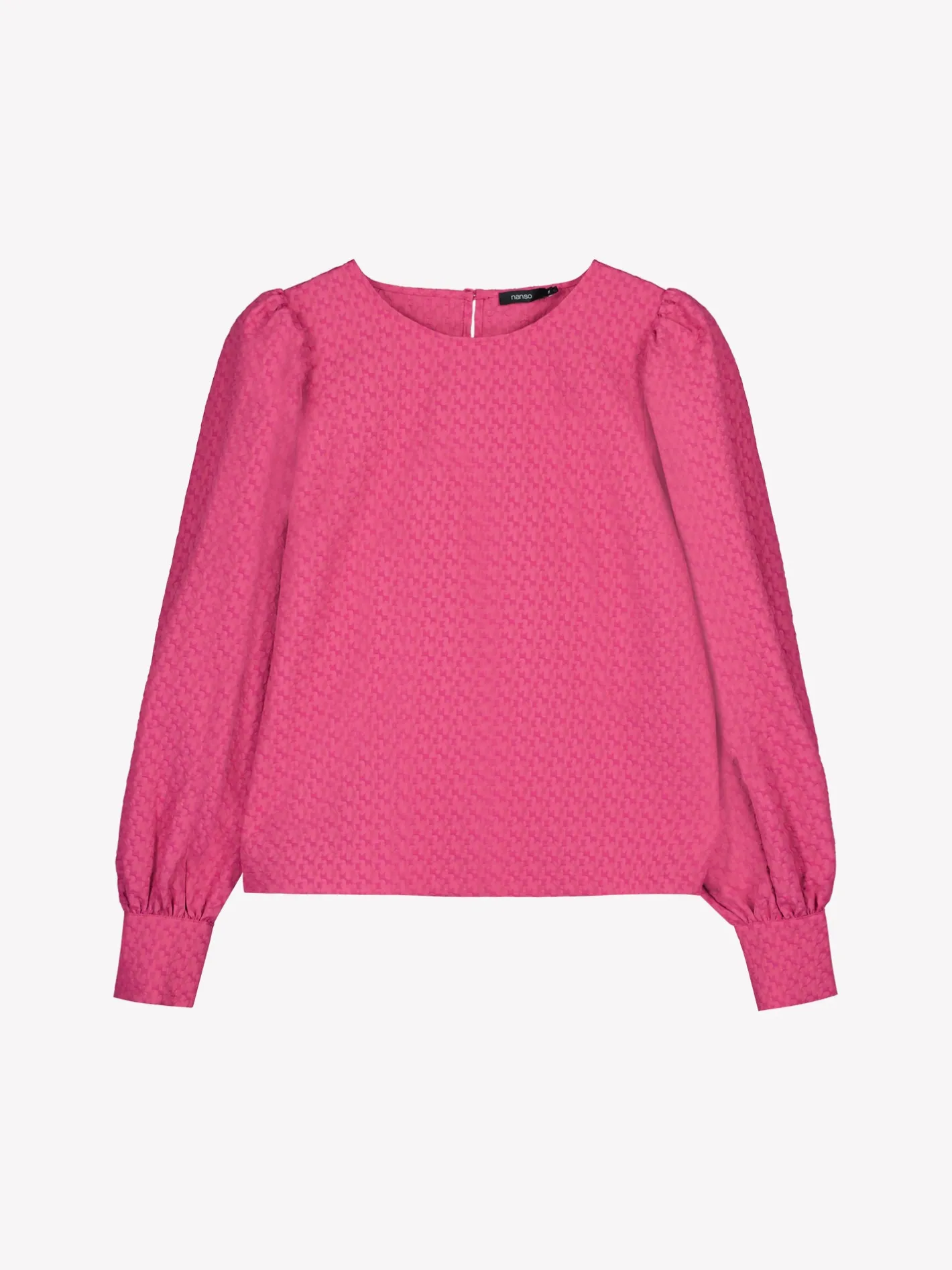 Naisten tyylikäs pinkki Reliefi-pusero kauniilla tekstuuripinnalla. Pusero on täydellinen yhdistettäväksi sekä hameiden että housujen kanssa. Puserossa on pyöreä pääntie, jossa takana nappihalkio. Puserossa on väljät ja muhkeat täyspitkät hihat, jotka poimuttuvat kauniisti olalla sekä kalvosimen yläpuolelle. Hihansuissa on nappikalvosimet. Puseron pituus koossa 38 on noin 60 cm. Materiaali on miellyttävän tuntuista kudottua polyesteri-viskoosi-elastaani -kangasta, jossa on kaunis pintastruktuuri. Materiaalille on ominaista 3-5 % kutistuminen ensimmäisessä pesussa.