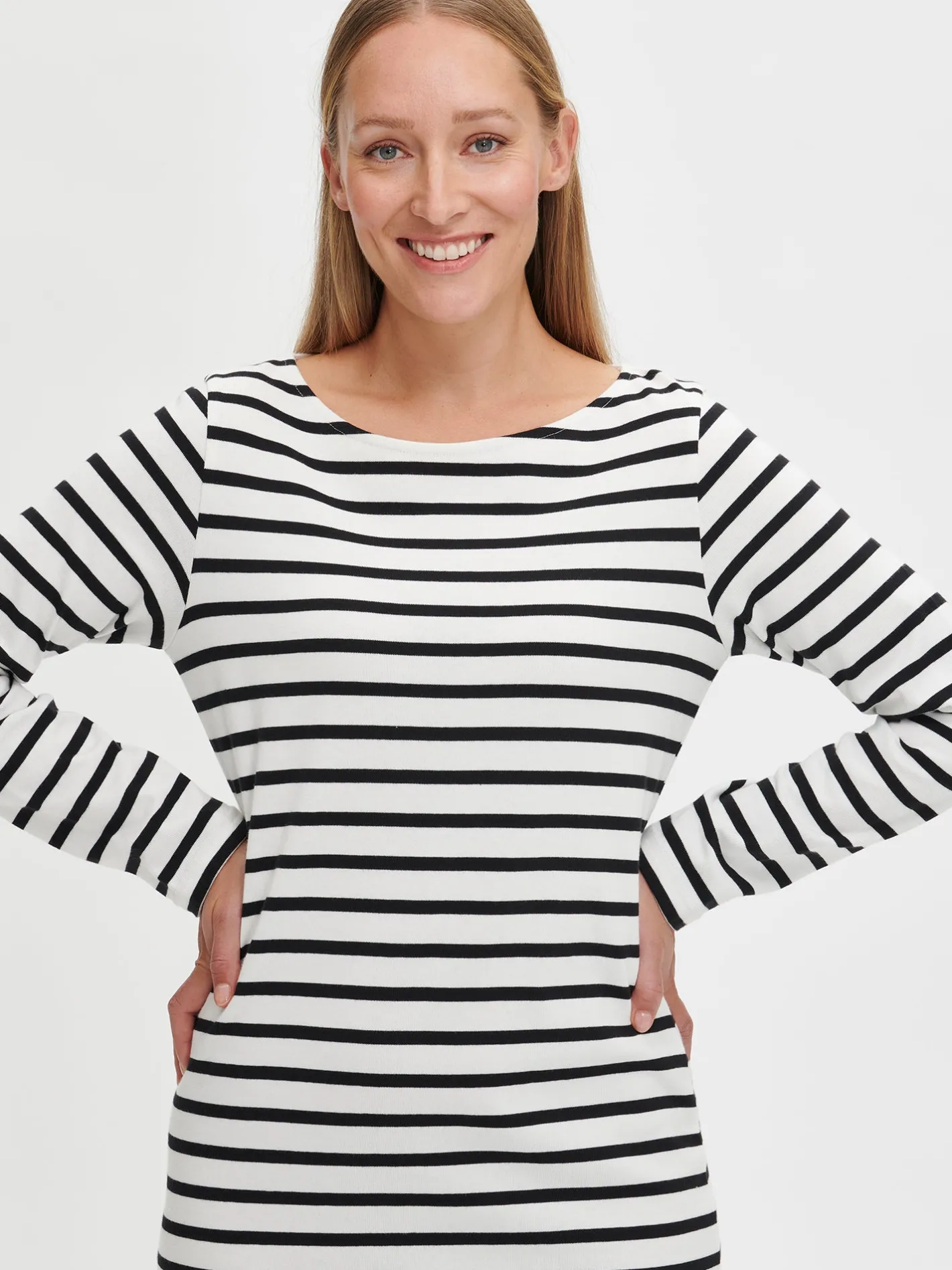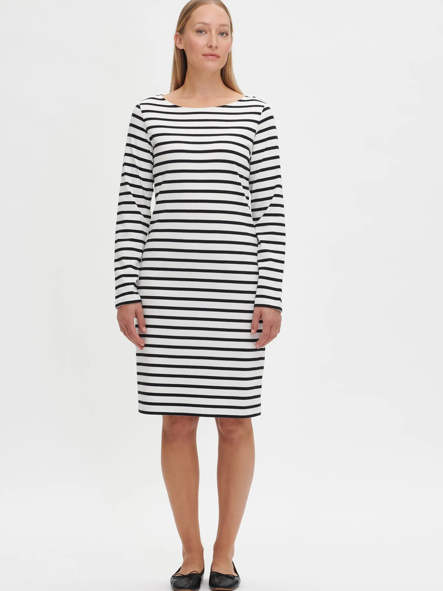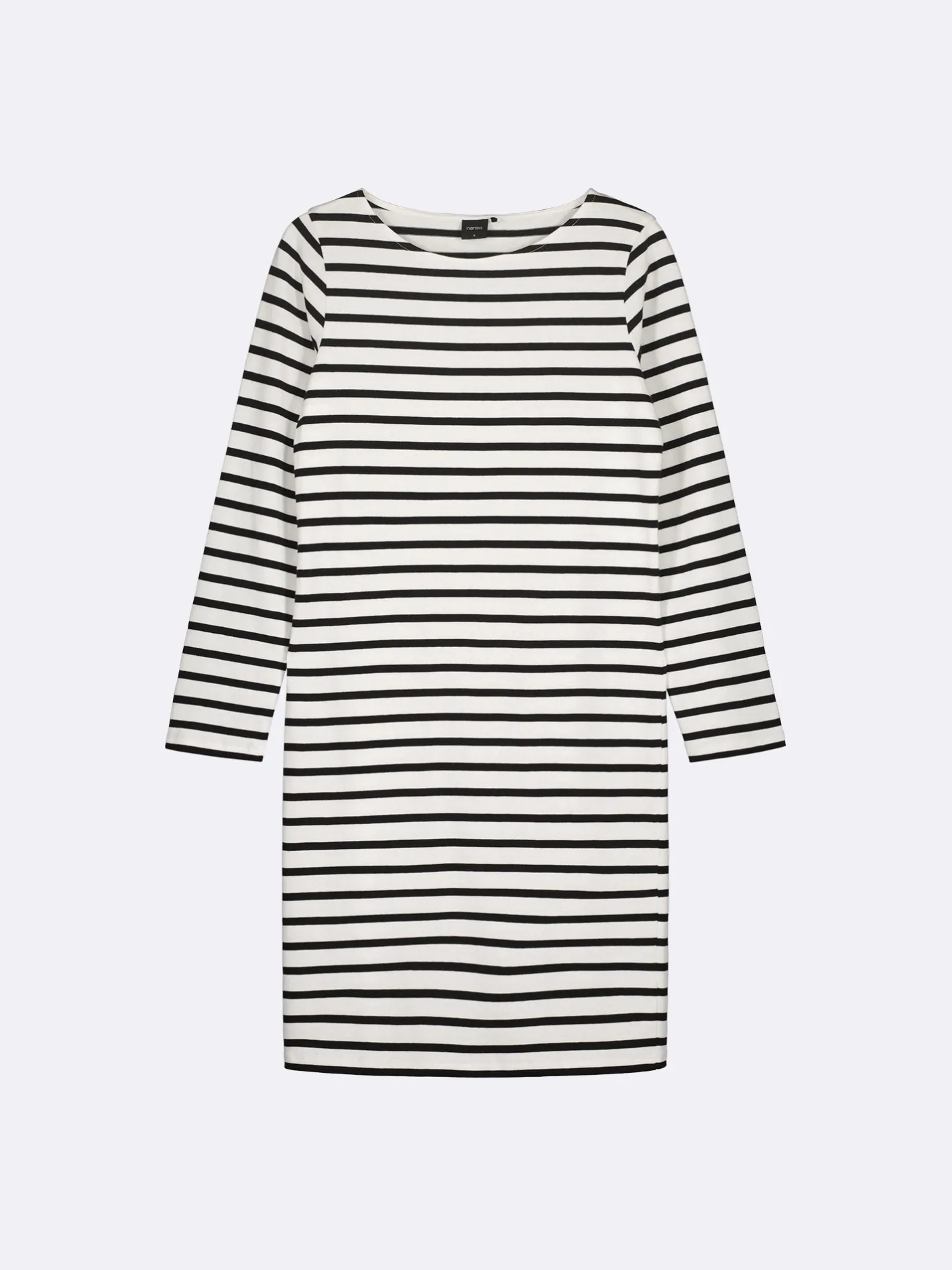 Naisten pitkähihainen, raidallinen mustavalkoinen Rivi-mekko. Pue rennon tyylikäs Rivi-mekko keväällä balleriinojen kanssa tai yhdistä se talvella tyylikkäisiin saappaisiin. Istuvassa mekossa on kantilla viimeistelty venepääntie ja täyspitkät hihat. Mekon pituus koossa M on noin 100 cm. Materiaali on miellyttävän tuntuista ja helppohoitoista puuvillaneulosta. Materiaalille on ominaista 3-5% kutistuminen ensimmäisessä pesussa. Pesun jälkeen muotoile tuote kosteana.
