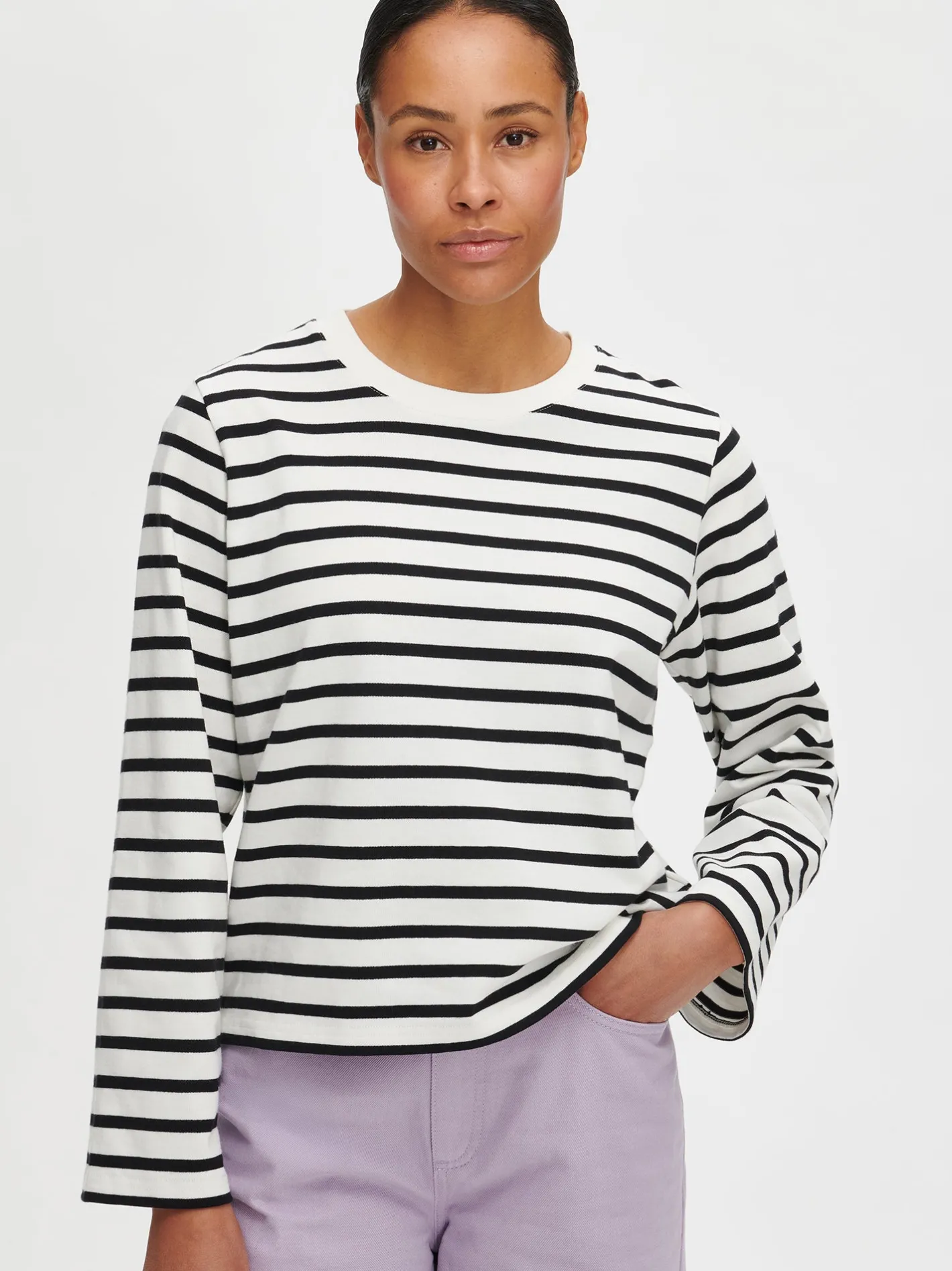 Naisten raidallinen mustavalkoinen Rivi-pusero täyspitkillä hihoilla. Klassinen pitkähihainen raitapaita on vaivaton yhdistää erilaisiin asukokonaisuuksiin. Rennon paidan pääntie on pyöreä ja se on viimeistelty ribillä. Paidan pituus koossa M on noin 58 cm. Materiaali on miellyttävää ja ryhdikästä 100% puuvillaa. Materiaalille on ominaista 3-5% kutistuminen ensimmäisessä pesussa. Pesun jälkeen muotoile tuote kosteana.