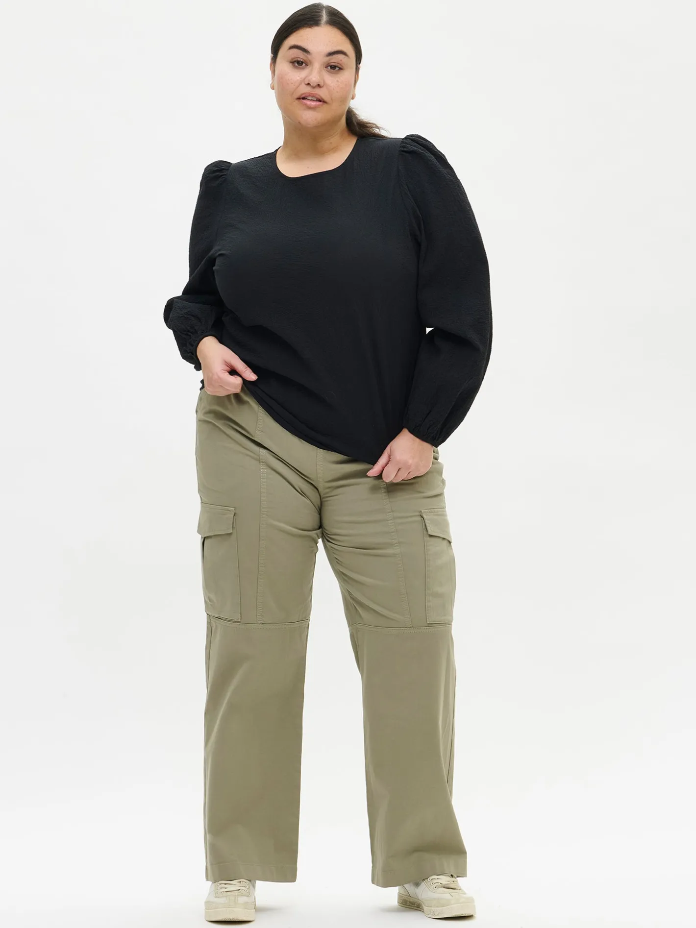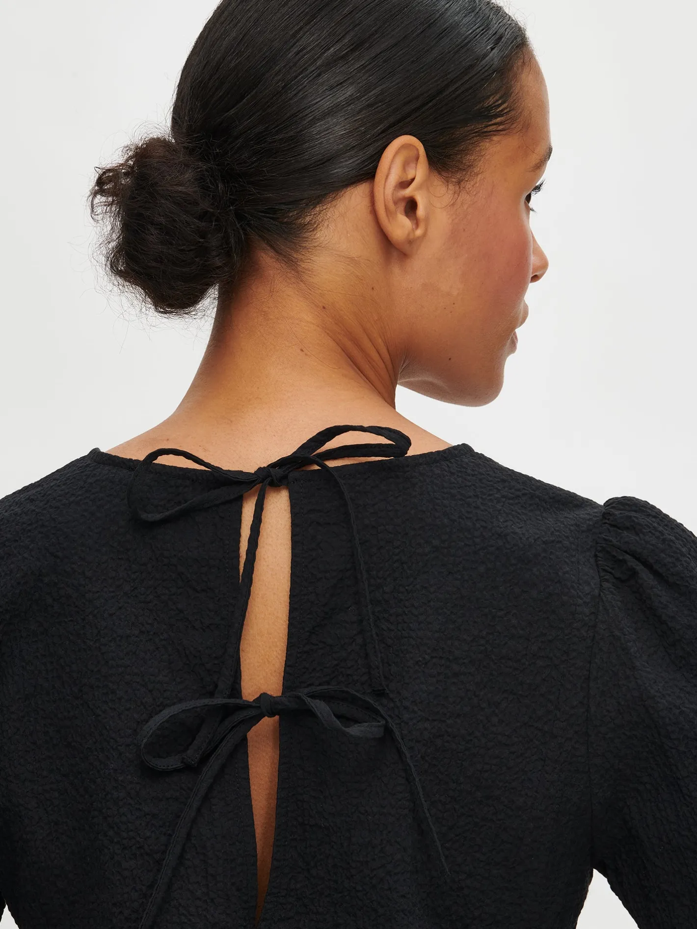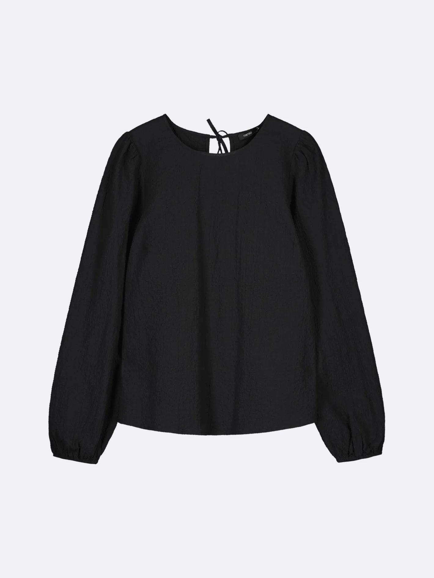 Naisten musta pitkähihainen Rusetti-pusero. Yksinkertaisen tyylikäs pusero on helppo yhdistää erilaisiin asukokonaisuuksiin. Puserossa on kantilla viimeistelty pyöreä pääntie ja takana yksityiskohtana halkio kahdella rusetilla, joista ylimmäinen on avattava. Täyspitkät hihat poimuttuvat hihansuiden kuminauhakäänteeseen. Puseron pituus koossa M on noin 64 cm. Materiaali on kudottua puuvillakangasta, jossa kaunis seersucker pintastruktuuri. Kankaassa on hieman elastaania antamassa joustoa. Materiaalille on ominaista 3-5% kutistuminen ensimmäisessä pesussa.