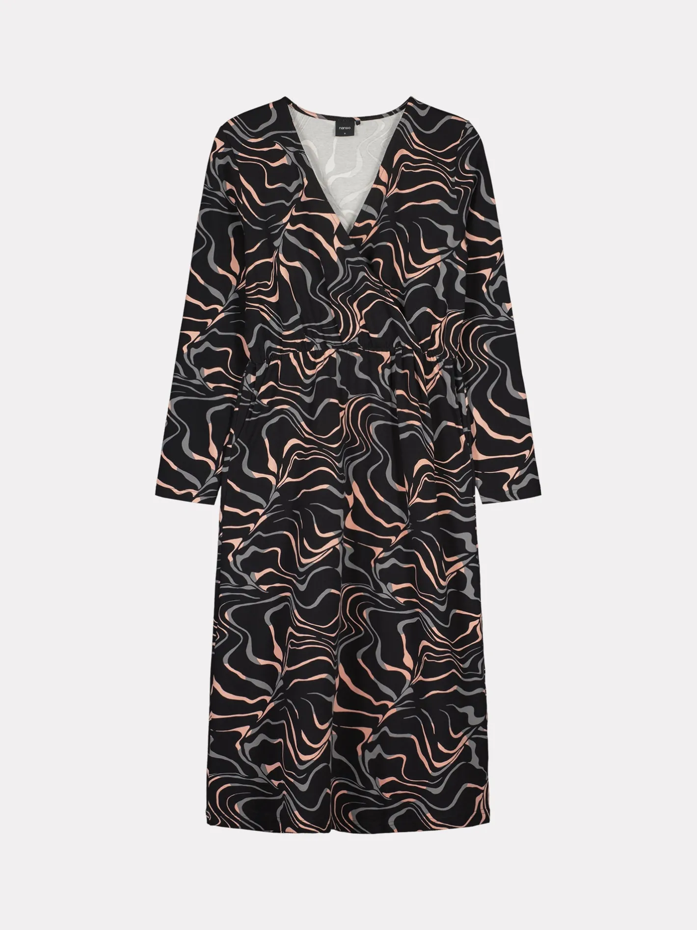 Naisten musta Saara-mekko kauniilla kuosilla. Mekossa on kietaisumallinen yläosa, jossa on laskoksia vyötäröltä alaspäin. Mekossa on täyspitkät hihat ja helmaosa on istuva. Mekon sivuissa on taskut ja vyötäröllä kuminauha. Mekon pituus koossa M on noin 115 cm. Materiaali on miellyttävän tuntuista ja helppohoitoista puuvilla-elastaani-neulosta.