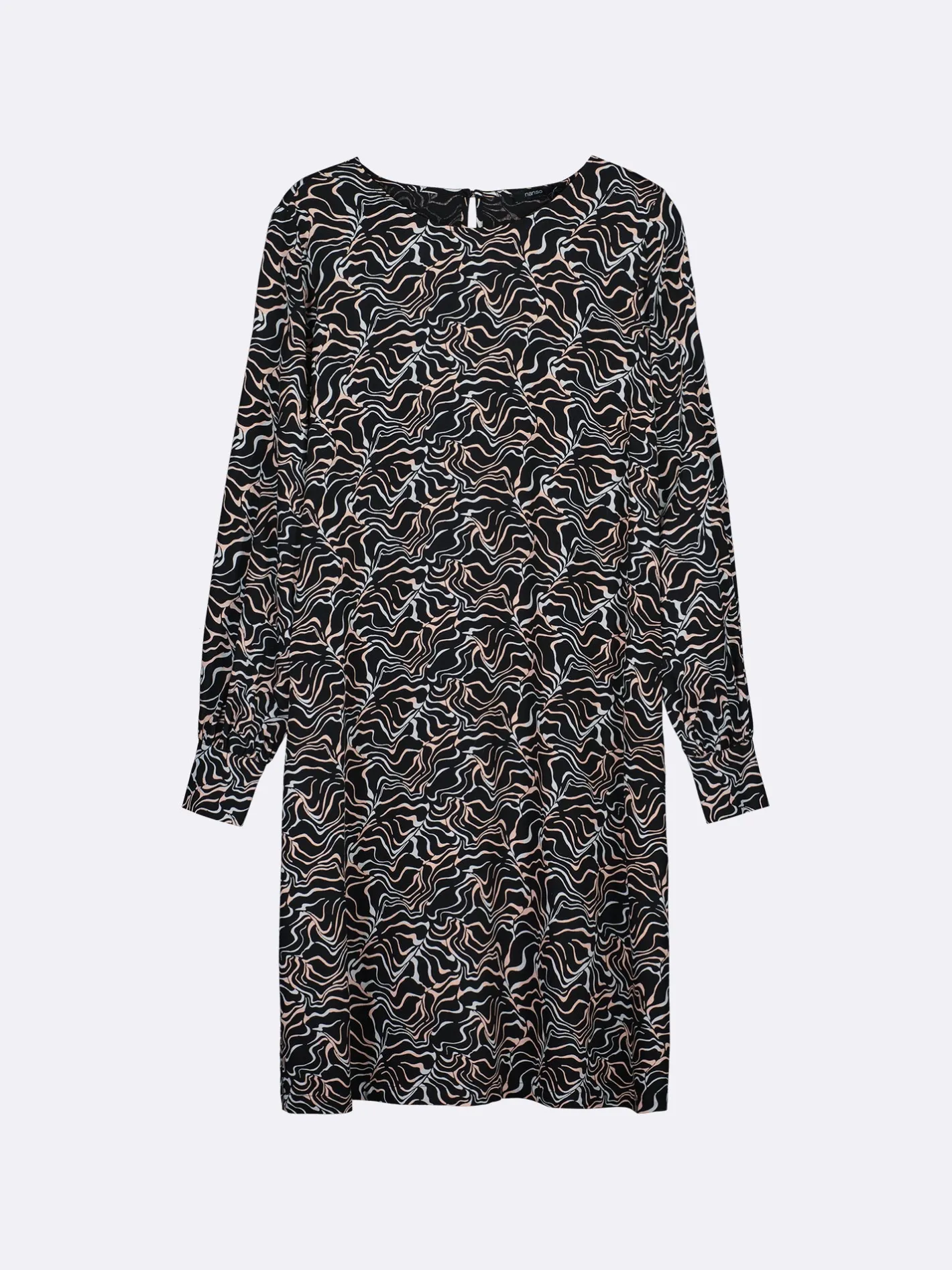 Naisten musta kuosillinen Sara-mekko pitkillä hihoilla. Tyylikäs midimittainen kangasmekko on helppo valinta arkeen. Mekossa on pyöreä pääntie, jossa takana pisaran muotoinen nappihalkio sekä sivutaskut ja suora helma. Täyspitkät hihat poimuttuvat hihansuun leveän nappikalvosimen yläpuolelle. Mekon pituus koossa 38 on noin 100 cm. Materiaali on kauniisti laskeutuvaa twillisidoksista viskoosikangasta. Materiaalille on ominaista 3-5% kutistuminen ensimmäisessä pesussa.