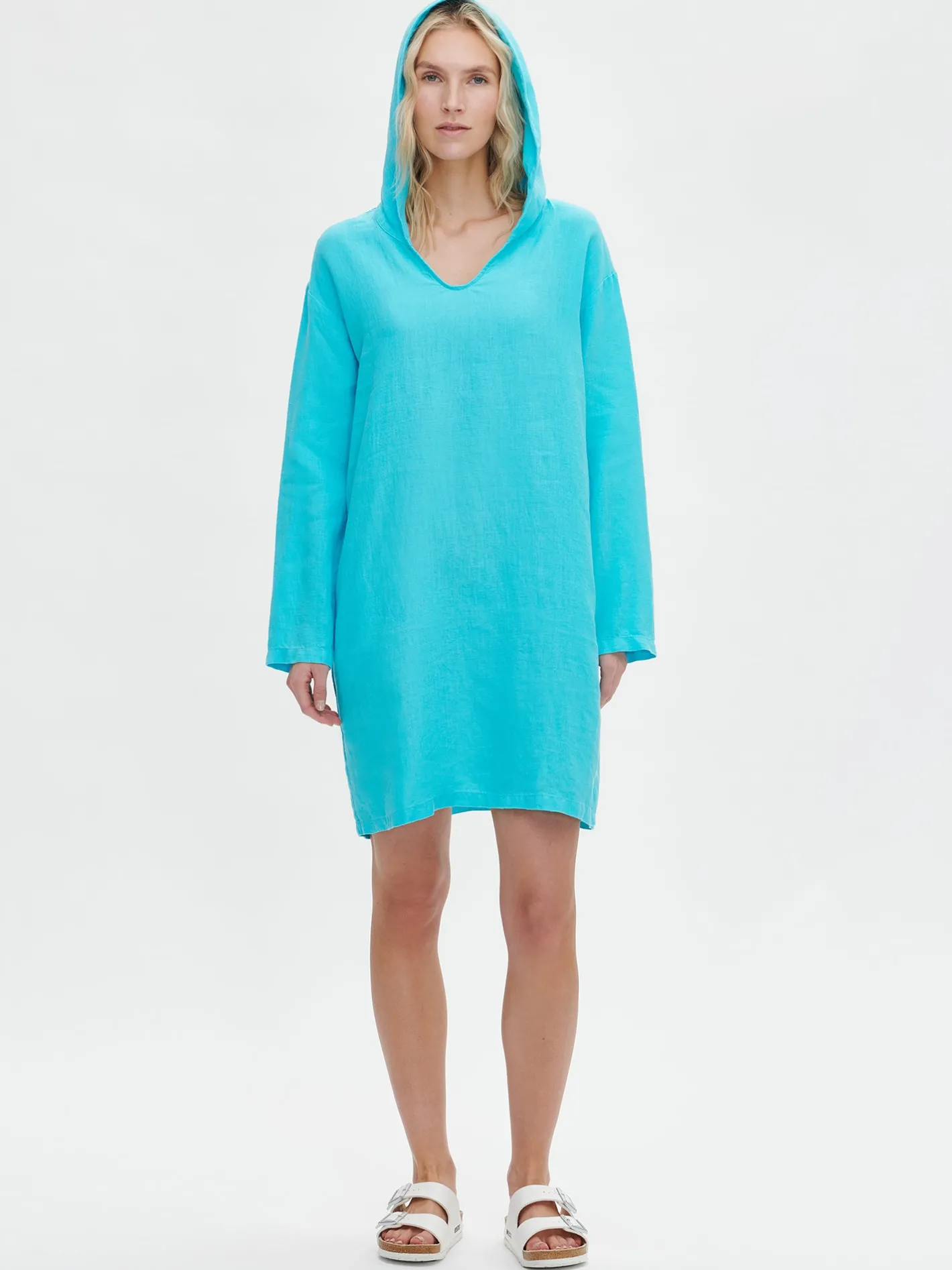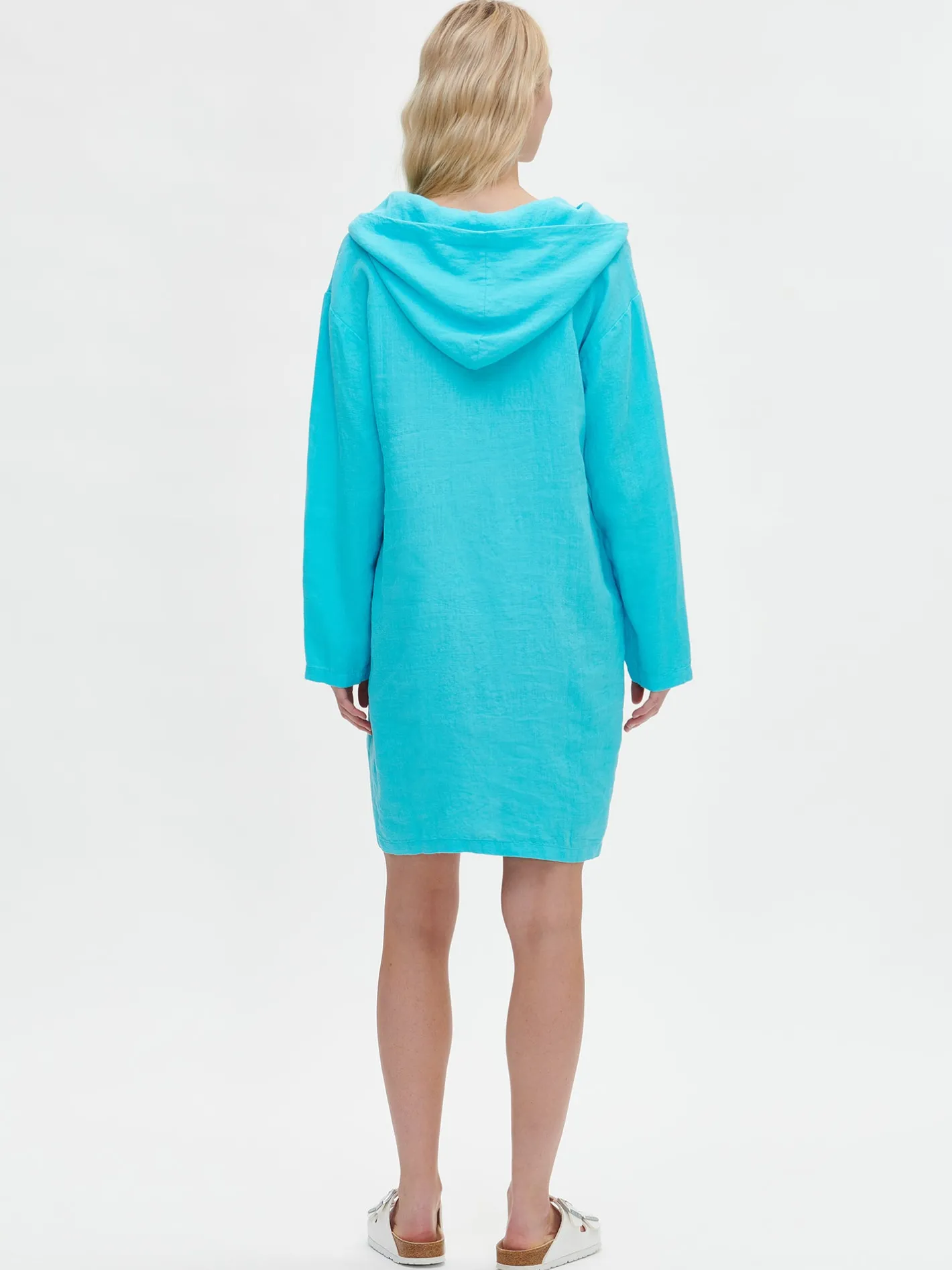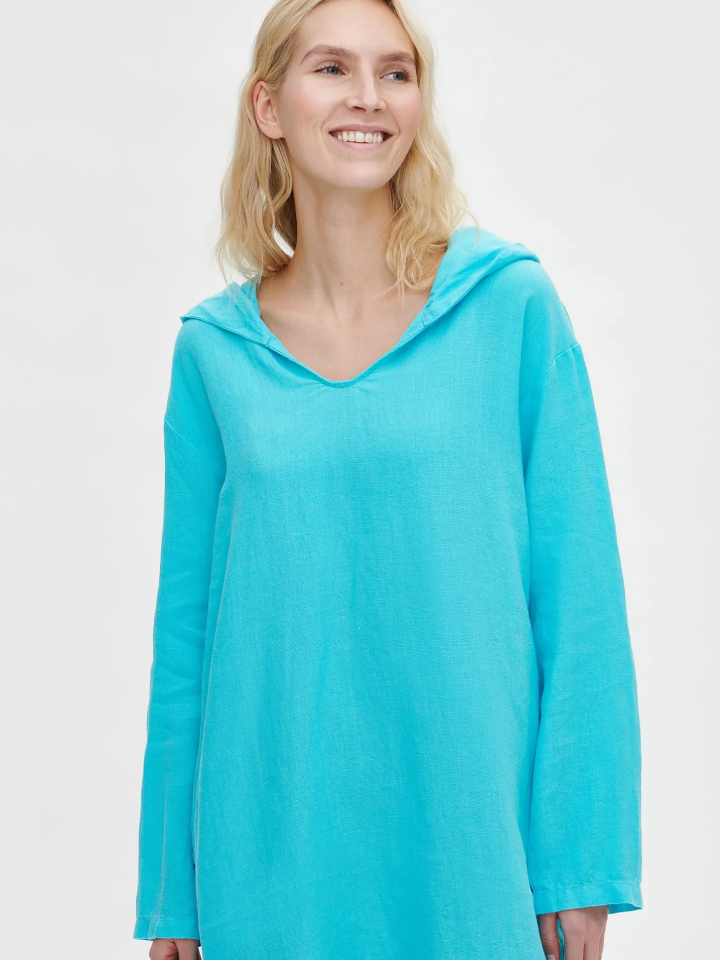 Naisten rento turkoosi Sarastus-pellavahupparimekko pitkillä hihoilla. Ihana pellavamekko sopii täydellisesti rentoon oleiluun ja lämpimiin kesäpäiviin. Huppari mekossa on kauniisti muotoiltu halkio pääntiellä, huppu ja sivutaskut. Pellavamekon pituus koossa M on noin 95 cm. Materiaali kudottua pellavakangasta, joka on kestävää ja hengittävää. Pellavalle on ominaista luonnollinen pieni rypistyminen. Tuote on esipesty tuotannossa, joten se ei kutistu ensimmäisessä pesussa.
