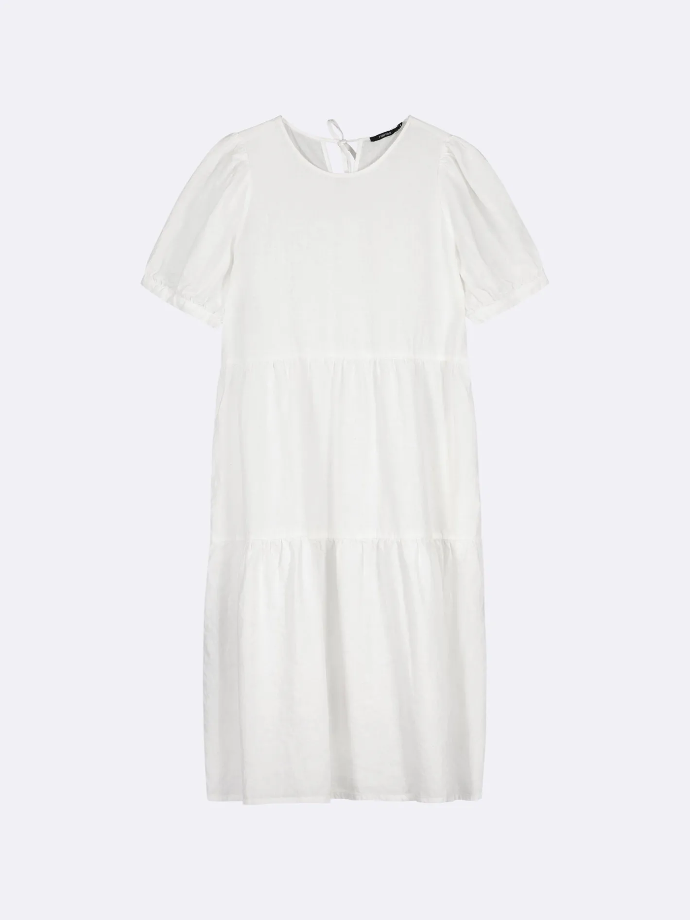 Naisten kaunis valkoinen midimittainen Sarastus-pellavamekko volyymisilla frillakerroksilla ja lyhyillä puhvihihoilla, joissa on napit säätövaralla. Rennon tyylikäs Sarastus-pellavamekko on kesän kestosuosikki, joka hurmaa ihanassa midi-pituudessa. Pellavamekossa on sivutaskut, pyöreä pääntie sekä niskassa pieni halkio ja solmittavat nyörit. Mekon pituus koossa M on noin 113 cm. Materiaali kudottua pellavakangasta, joka on kestävää ja hengittävää. Pellavalle on ominaista luonnollinen pieni rypistyminen. Tuote on esipesty tuotannossa, joten se ei kutistu ensimmäisessä pesussa.