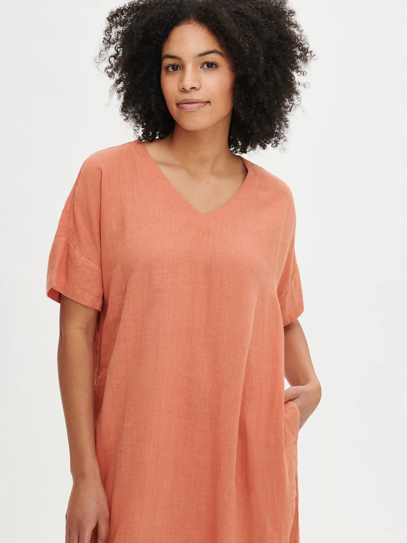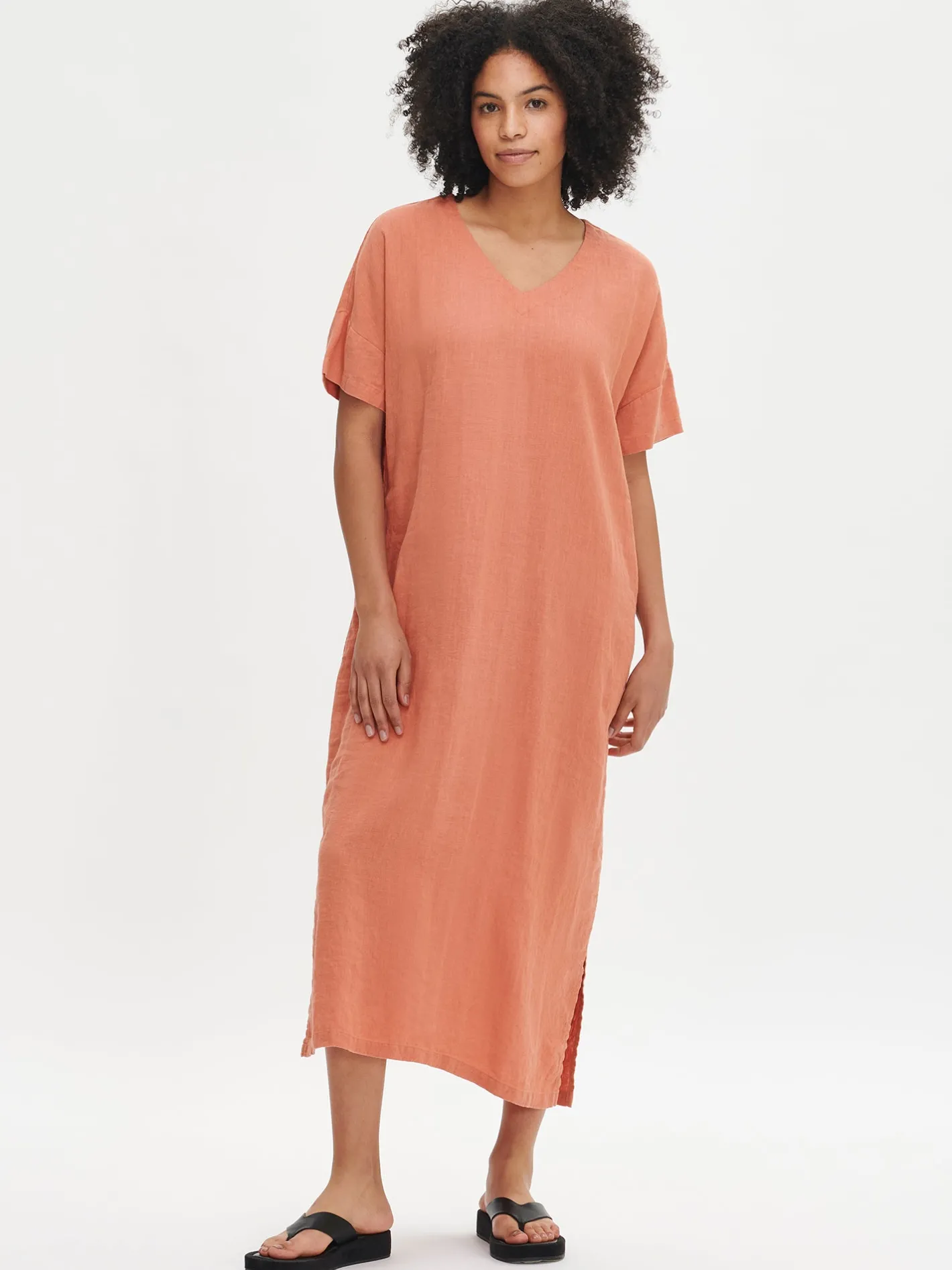 Naisten rento oranssi suoralinjainen Sarastus-pellavamekko sivuhalkioilla. Lyhythihaisessa kaftaanissa on V-pääntie ja sivutaskut. Mekon pituus koossa M on noin 130 cm. Materiaali kudottua pellavakangasta, joka on kestävää ja hengittävää. Pellavan kevyt ja viileä tuntu tekevät mekosta täydellisen valinnan rentoihin kesäpäiviin ja kiireettömiin hetkiin kotona. Pellavalle on ominaista luonnollinen pieni rypistyminen. Tuote on esipesty tuotannossa, joten se ei kutistu ensimmäisessä pesussa.