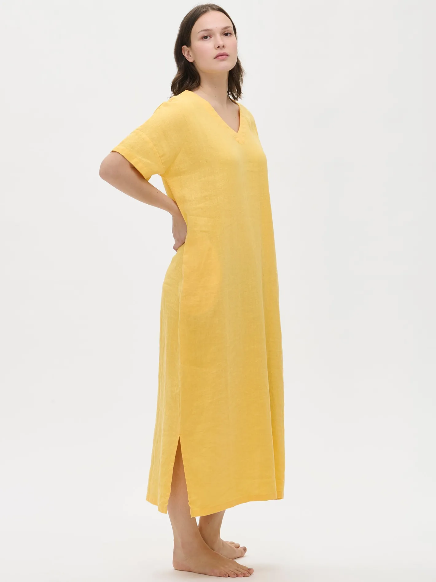 Naisten rento keltainen suoralinjainen Sarastus-pellavamekko sivuhalkioilla. Lyhythihaisessa kaftaanissa on V-pääntie ja sivutaskut. Mekon pituus koossa M on noin 130 cm. Materiaali kudottua pellavakangasta, joka on kestävää ja hengittävää. Pellavan kevyt ja viileä tuntu tekevät mekosta täydellisen valinnan rentoihin kesäpäiviin ja kiireettömiin hetkiin kotona. Pellavalle on ominaista luonnollinen pieni rypistyminen. Tuote on esipesty tuotannossa, joten se ei kutistu ensimmäisessä pesussa.