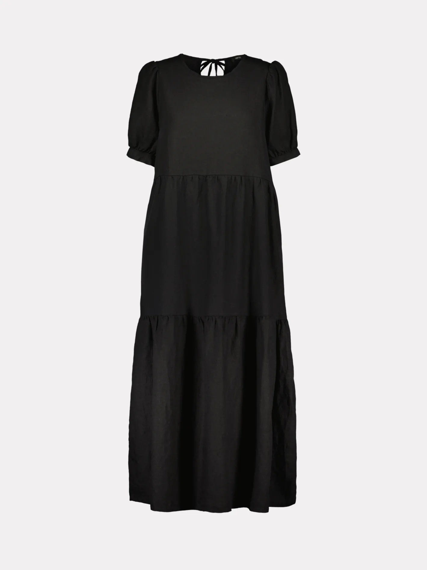 Naisten kaunis musta Sarastus-pellavamekko volyymisilla frillakerroksilla ja lyhyillä puhvihihoilla, joissa on napit säätövaralla. Tyylikäs ja rento Sarastus-pellavamekko on kesän kestosuosikki vuodesta toiseen. Mekossa on sivutaskut, pyöreä pääntie sekä niskassa pieni halkio ja solmittavat nyörit. Pellavamekon pituus koossa M on noin 130 cm. Materiaali kudottua pellavakangasta, joka on kestävää ja hengittävää. Pellavalle on ominaista luonnollinen pieni rypistyminen. Tuote on esipesty tuotannossa, joten se ei kutistu ensimmäisessä pesussa.