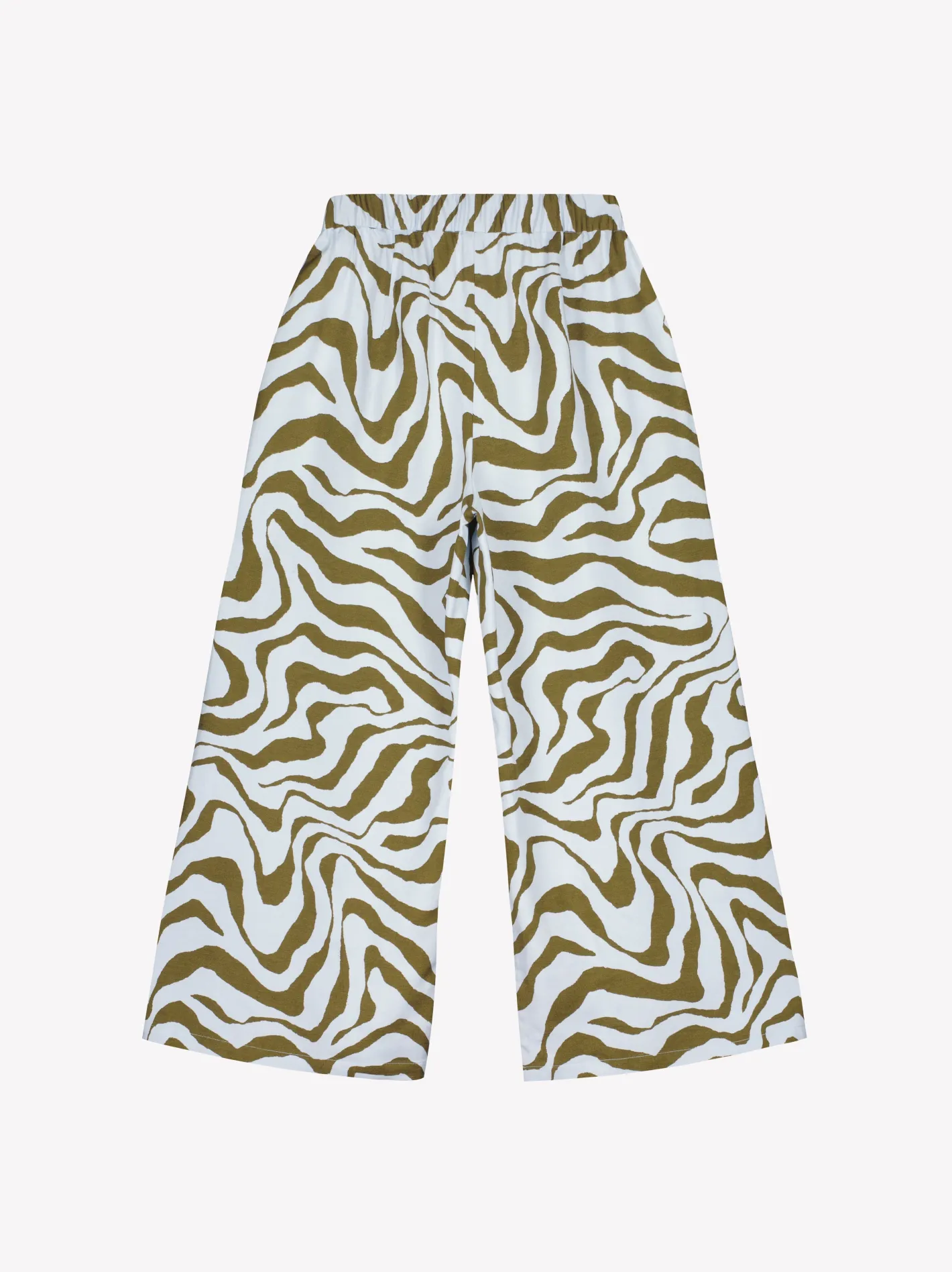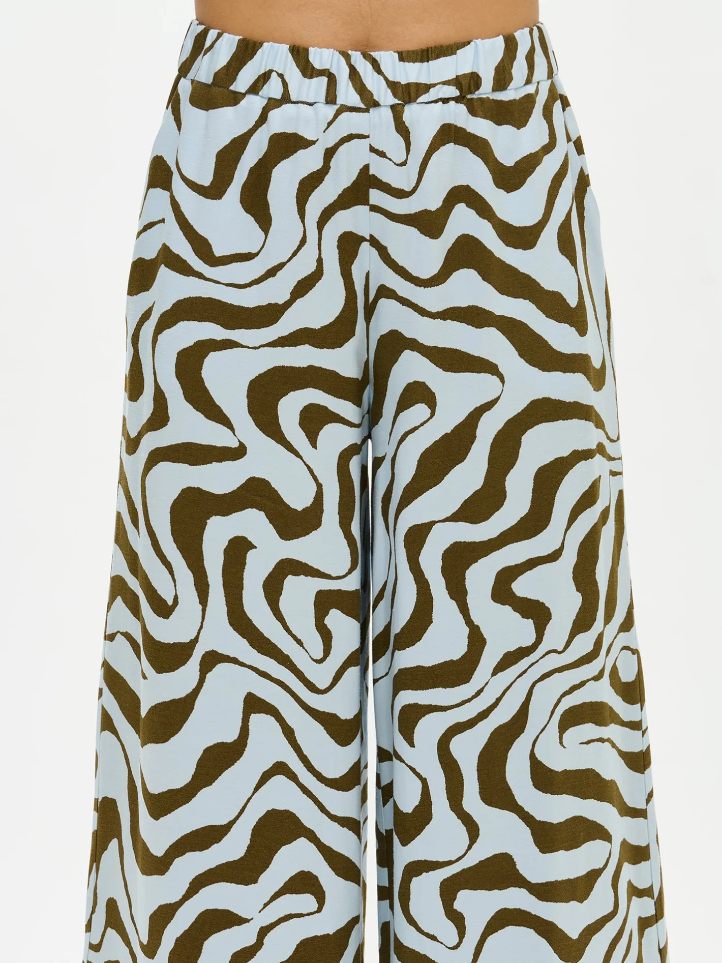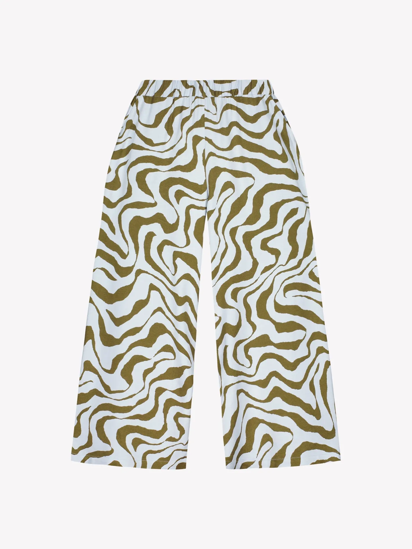 Naisten kuosilliset vaaleansiniset Savanna-housut. Housuissa on leveät lahkeet, sivuissa taskut ja joustava vyötärö. Housut ovat täyspitkät ja lahkeen sisäpituus koossa 38 on noin 76 cm. Kauniisti laskeutuvien housujen materiaali on laadukasta ja miellyttävän tuntuista viskoosi-pellava-kangasta. Materiaalille on ominaista 3-5% kutistuminen ensimmäisessä pesussa.