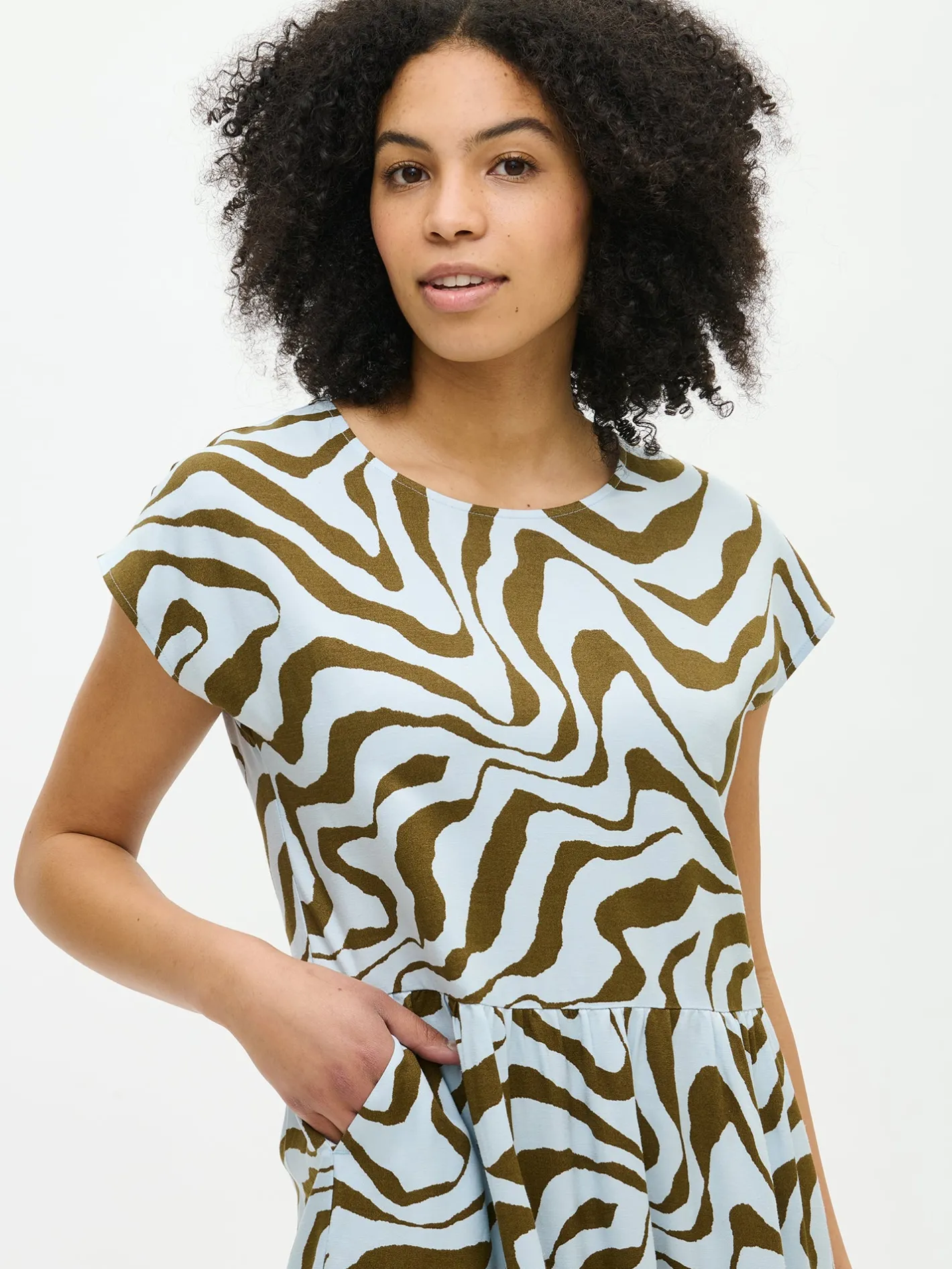 Naisten kuosillinen vaaleansininen Savanna-mekko. Rento mekko tuo arkeesi ripauksen rohkeaa kuosia ja pehmeää helppoutta. Mekossa on kantilla viimeistelty ovaali pääntie ja kädentiet. Mekon helma poimuttuu kevyesti vyötärön leikkaussaumaan ja sivuissa on taskut. Mekon pituus koossa 38 on noin 125 cm. Materiaali on laadukasta ja miellyttävän tuntuista viskoosi-pellava-kangasta. Materiaalille on ominaista 3-5% kutistuminen ensimmäisessä pesussa.