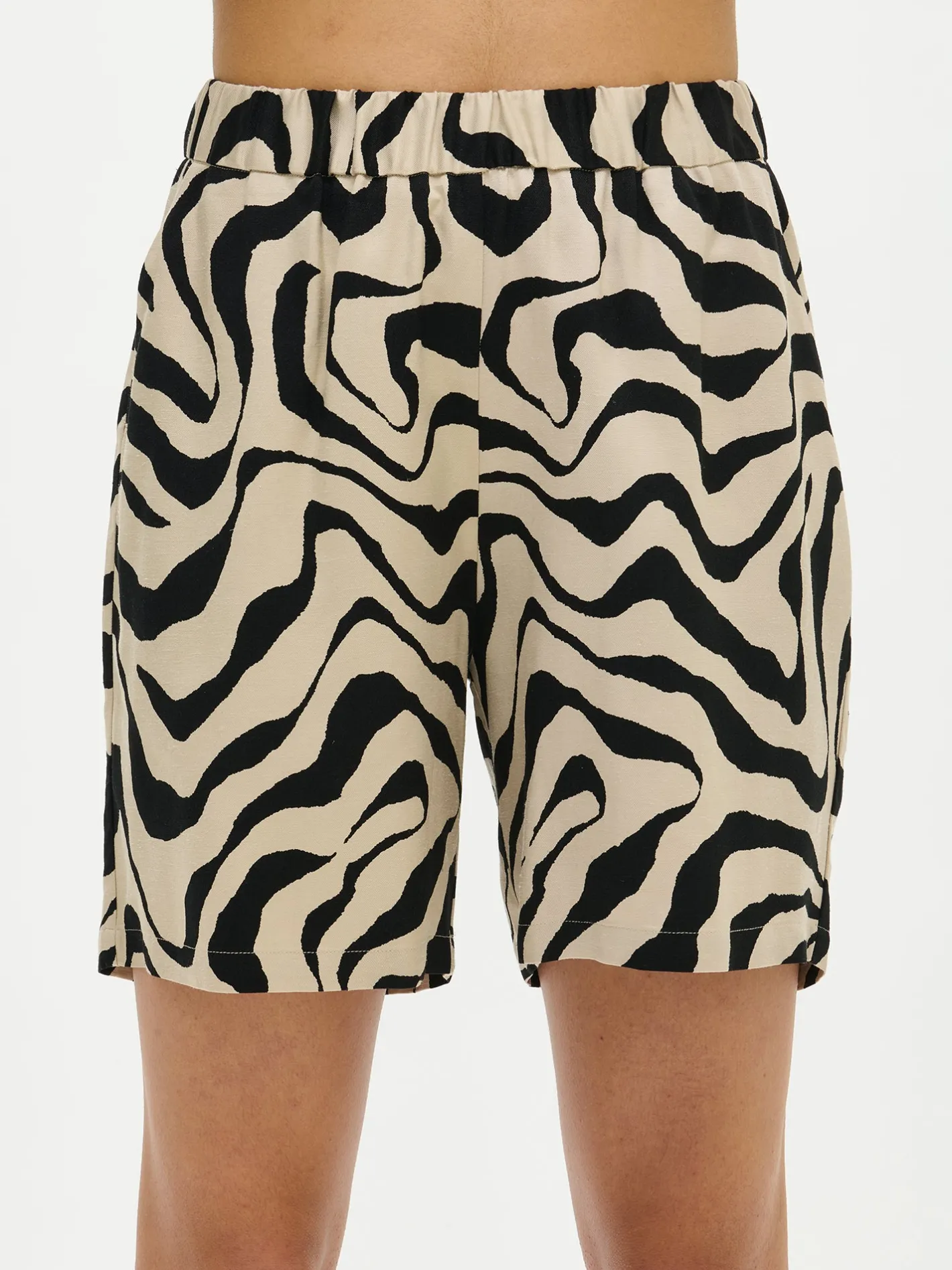 Naisten rennot kuviolliset beiget Savanna-shortsit. Shortseissa on joustava vyötärö ja sivuissa on taskut. Shortsien lahkeen sisäpituus koossa 38 on noin 16,5 cm. Tuote on valmistettu laadukkaasta kudotusta viskoosipellavakankaasta. Materiaalille on ominaista 3-5 % kutistuminen ensimmäisessä pesussa.