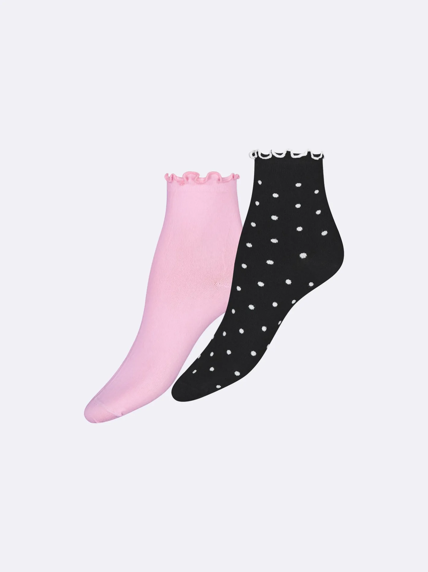 Voguen nilkkasukat pehmeästä, korkealaatuisesta luomupuuvillasta. Sukissa on kaunis frillareuna. Kahden parin pakkauksessa mustassa sukkaparissa on siro pilkkukuvio ja toinen sukkapari on yksivärinen vaaleanpunainen.