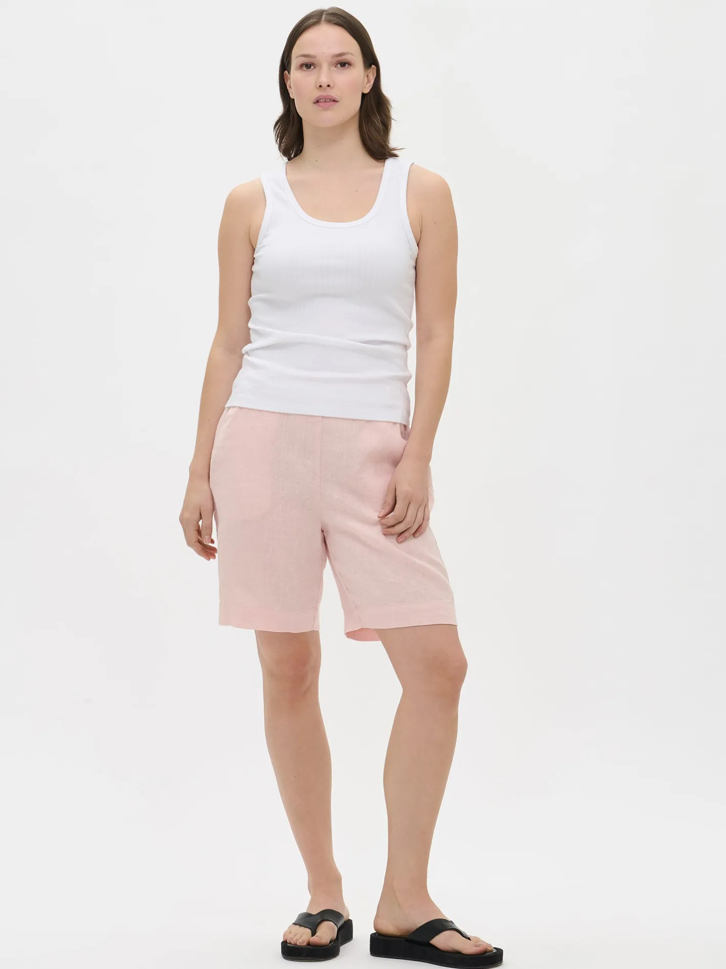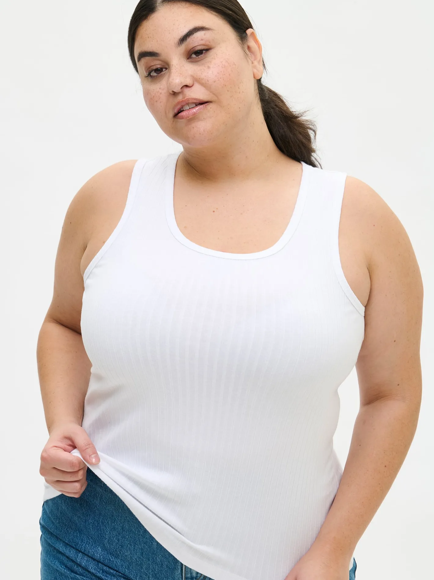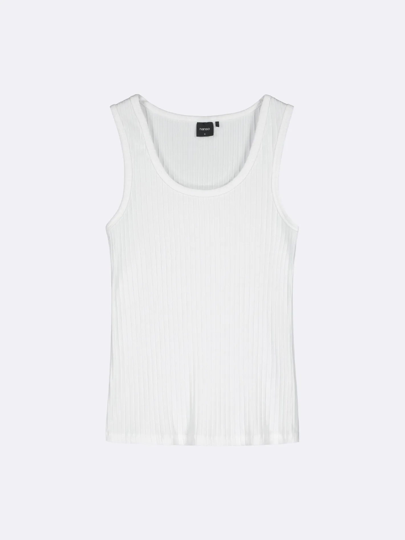 Naisten ajaton valkoinen Seri-toppi pyöreällä pääntiellä ja suoralla helmalla. Hihattoman topin pituus koossa M on noin 62 cm. Joustava ribbineulos on laadukasta ja iholla miellyttävän pehmeältä tuntuvaa puuvilla-elastaania. Pehmeä ja joustava toppi tuo täydellistä mukavuutta päivittäisiin asuihin, yhdistäen tyylin ja rentouden vaivattomasti.