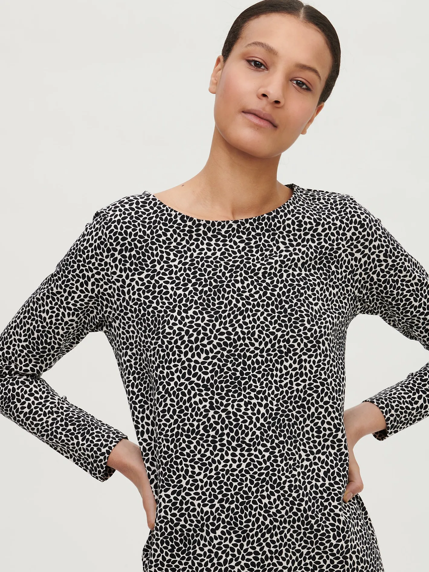 Sharon on 165 cm pitkä ja hänellä on päällään tuotteesta koko S. Mallin ympärysmitat ovat: rinta 82 cm, vyötärö 66 cm ja lantio 94 cm.