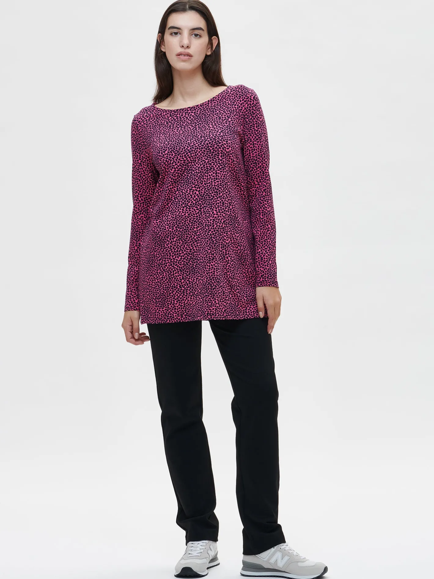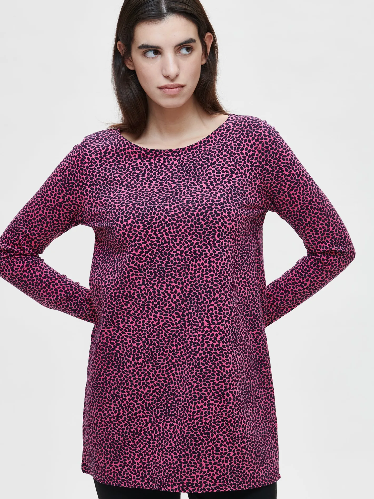 Naisten kuosillinen pinkki Sesam-tunika. Kevyesti levenevässä tunikassa on kantilla viimeistelty ovaali pääntie, sivuissa taskut ja täyspitkät hihat. Tunikan pituus koossa M on noin 78 cm. Materiaali on miellyttävän tuntuista ja helppohoitoista puuvilla-elastaani-neulosta.