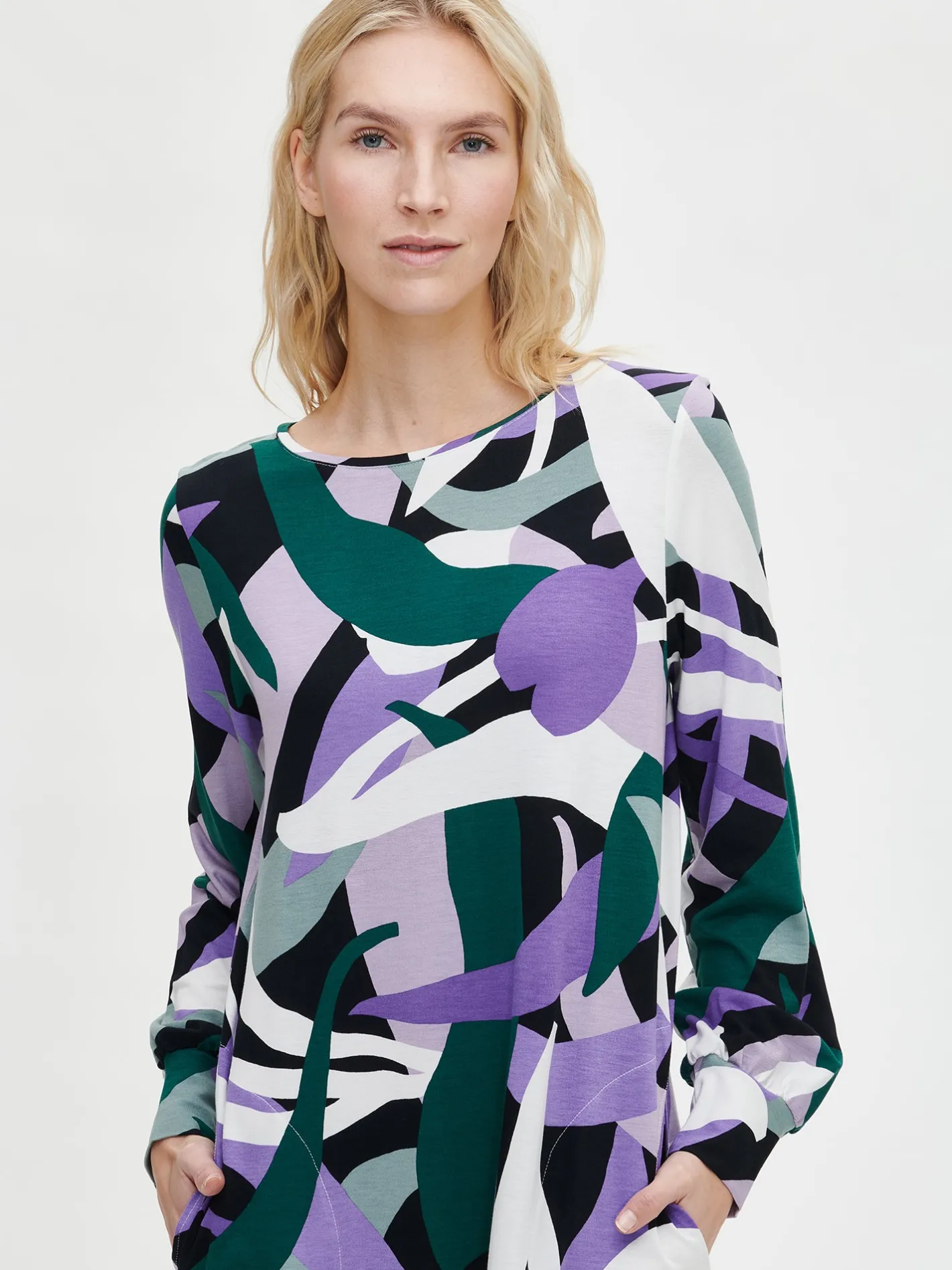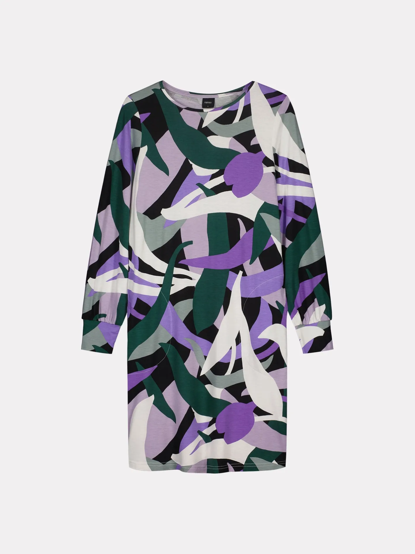 Naisten kuosillinen monivärinen Siimes-mekko. A-linjaisessa mekossa on tereellä viimeistelty ovaali pääntie ja sivuissa taskut. Mekossa on täyspitkät hihat, jotka poimuttuvat kauniisti hihansuun leveän rannekkeen yläpuolelle. Mekon pituus koossa M on noin 95 cm. Kauniisti laskeutuvan mekon materiaali on laadukasta ja miellyttävän tuntuista viskoosi-elastaani-neulosta. Viskoosineulos on sähköistymätöntä ja helppohoitoista. Tuote on valmistettu LENZING™ ECOVERO™ -viskoosista. Materiaalille on ominaista 3-5% kutistuminen ensimmäisessä pesussa.