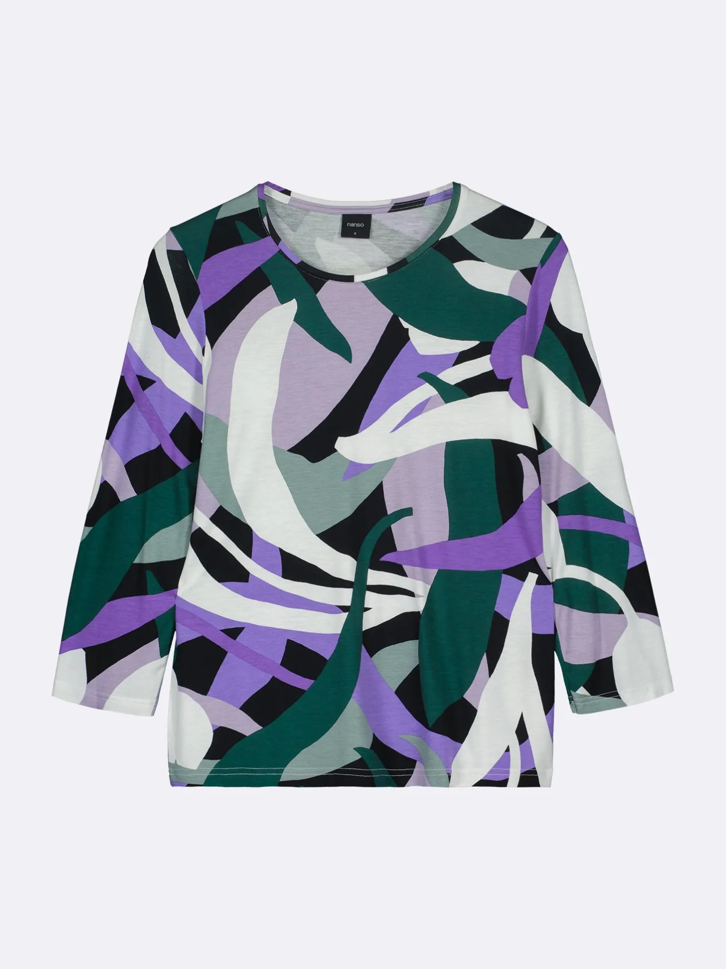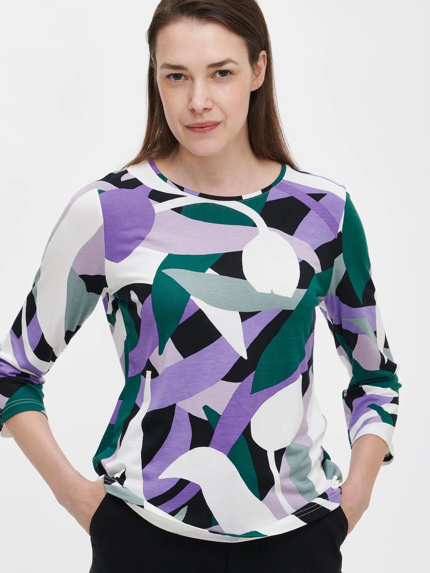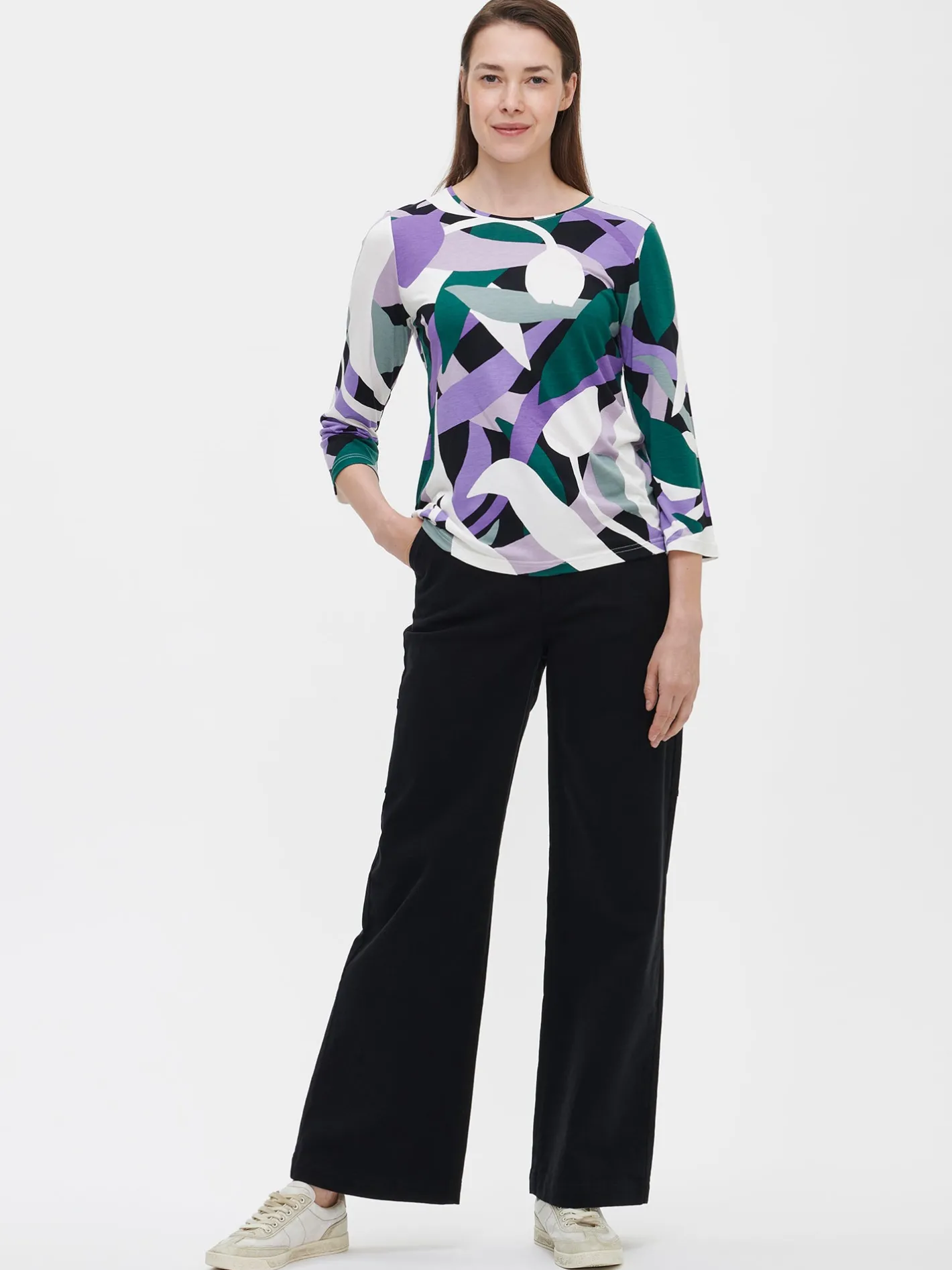 Naisten kuosillinen monivärinen Siimes-pusero. Istuvassa puserossa on tereellä viimeistelty avara pyöreä pääntie ja 3/4 pituiset hihat. Puseron pituus koossa M on noin 65 cm. Kauniisti laskeutuvan puseron materiaali on laadukasta ja miellyttävän tuntuista viskoosi-elastaani-neulosta. Viskoosineulos on sähköistymätöntä ja helppohoitoista. Tuote on valmistettu LENZING™ ECOVERO™ -viskoosista. Materiaalille on ominaista 3-5 % kutistuminen ensimmäisessä pesussa.