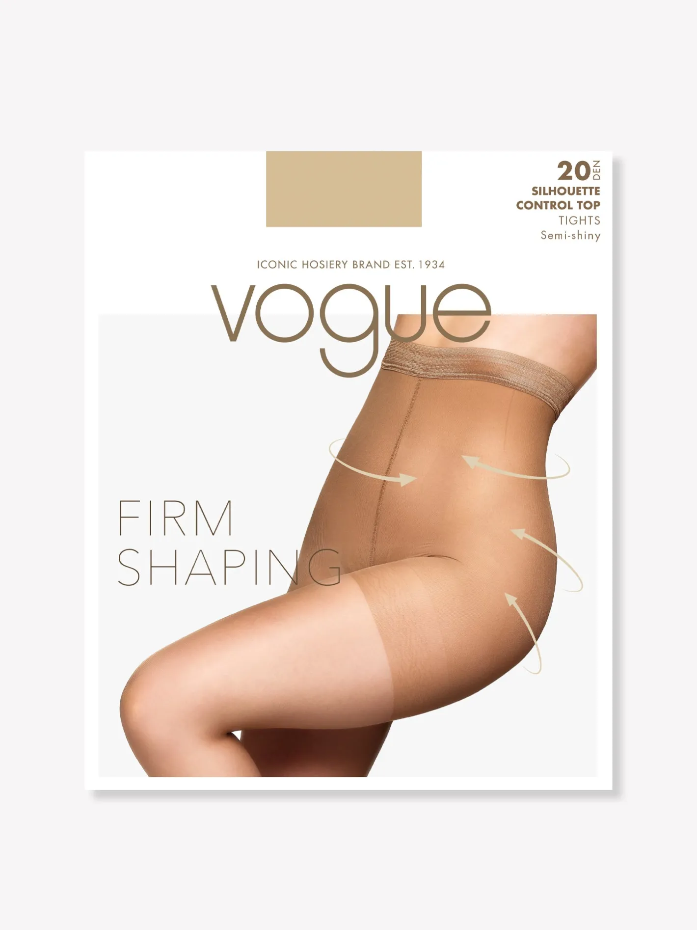 Voguen 20 denierin himmeäkiiltoiset muotoilevat sukkahousut. Sukkahousujen Control Top- housuosa on 50 denierin paksuinen ja muotoilee voimakkaasti vyötäröltä reidelle. Sukkahousuissa on tasosauma, puuvillahaarakiila ja huomaamaton kärkivahvike. Sukkahousujen vyötärönauhalla on silikoninauha.