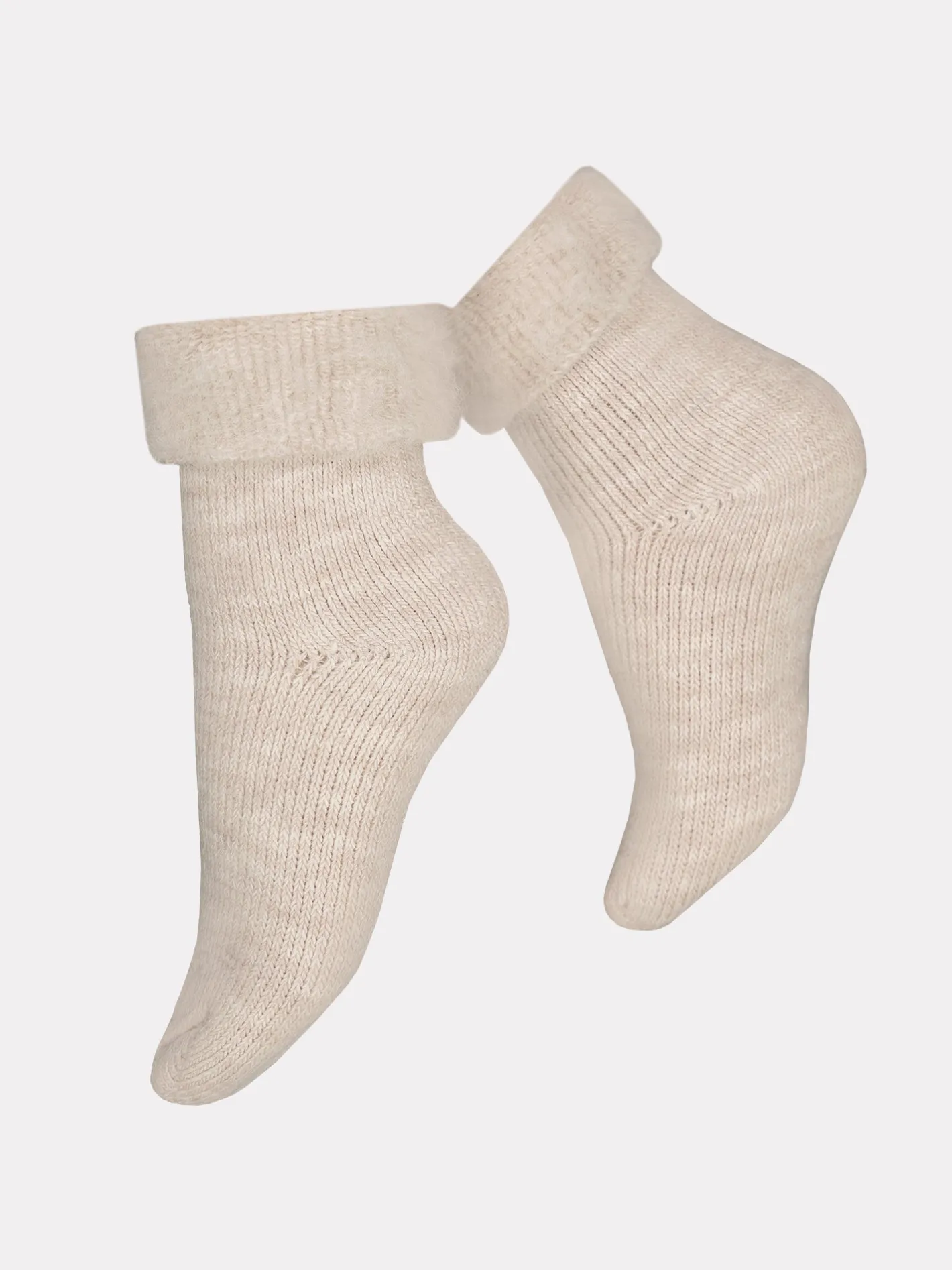 Voguen ihanan pehmeät alpakkavillasekoitesukat ecrun värissä. Pörröiset kotisukat ovat ihanteelliset leppoisaan kotona oleskeluun.