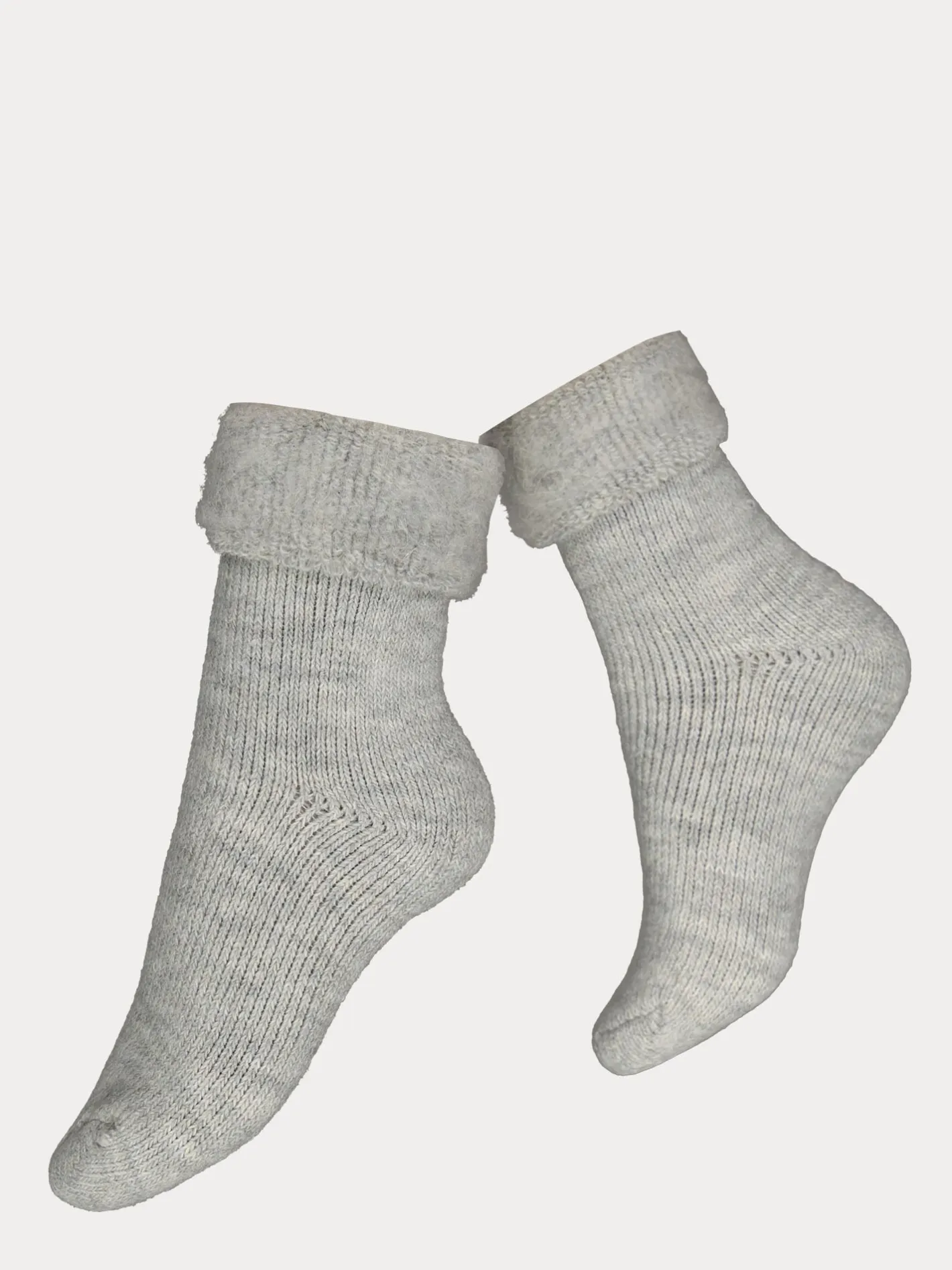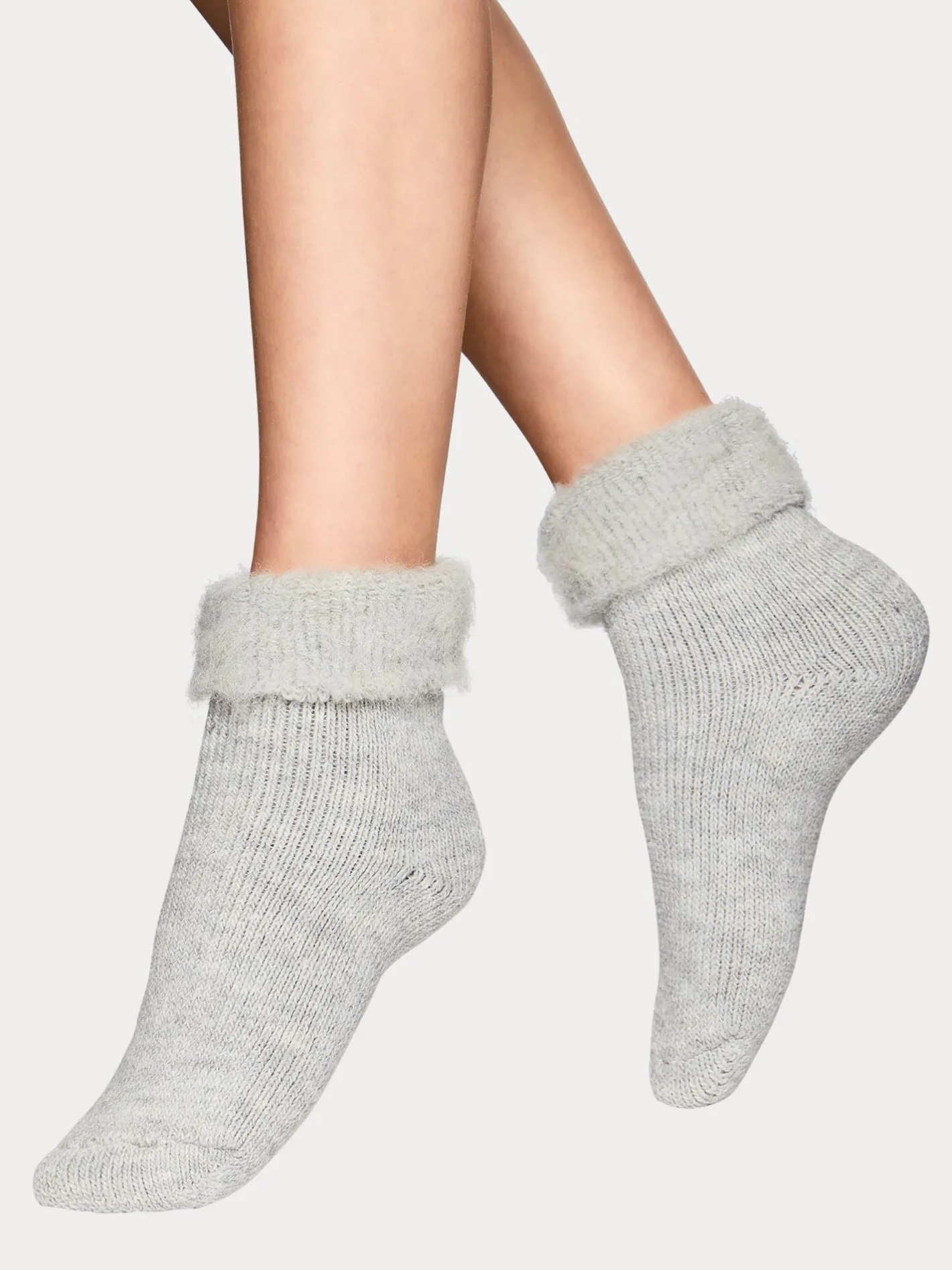 Voguen ihanan pehmeät alpakkavillasekoitesukat harmaassa sävyssä. Pörröiset kotisukat ovat ihanteelliset leppoisaan kotona oleskeluun.