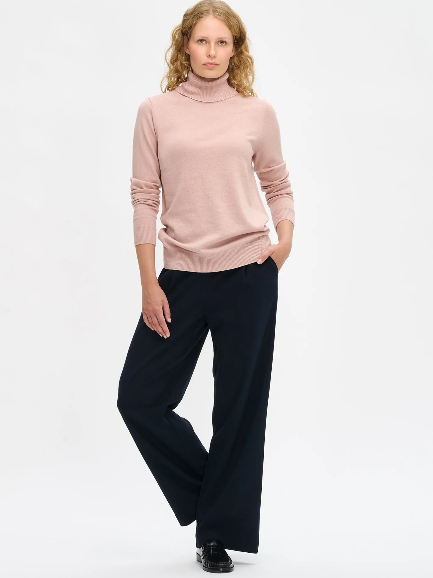 Naisten tummansiniset pitkät Sointu-housut. Tyylikkäät ja mukavat housut ovat arjen luottovaate. Housuissa on edessä vyötäröllä laskokset, sivuissa taskut ja joustava vyötärö. Housuissa on täyspitkät leveät lahkeet ja lahkeen sisäpituus koossa 38 on noin 78 cm. Kauniisti laskeutuvien housujen materiaali on laadukasta ja miellyttävän tuntuista polyesteri-viskoosi-sekoitekangasta, jossa on hieman elastaania antamassa joustoa. Kankaan mattapinta on twill sidoksinen.