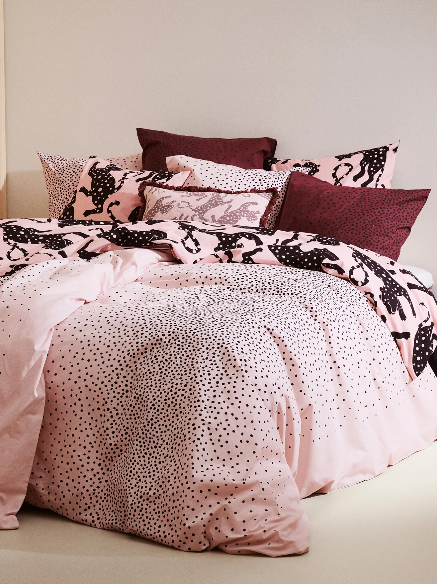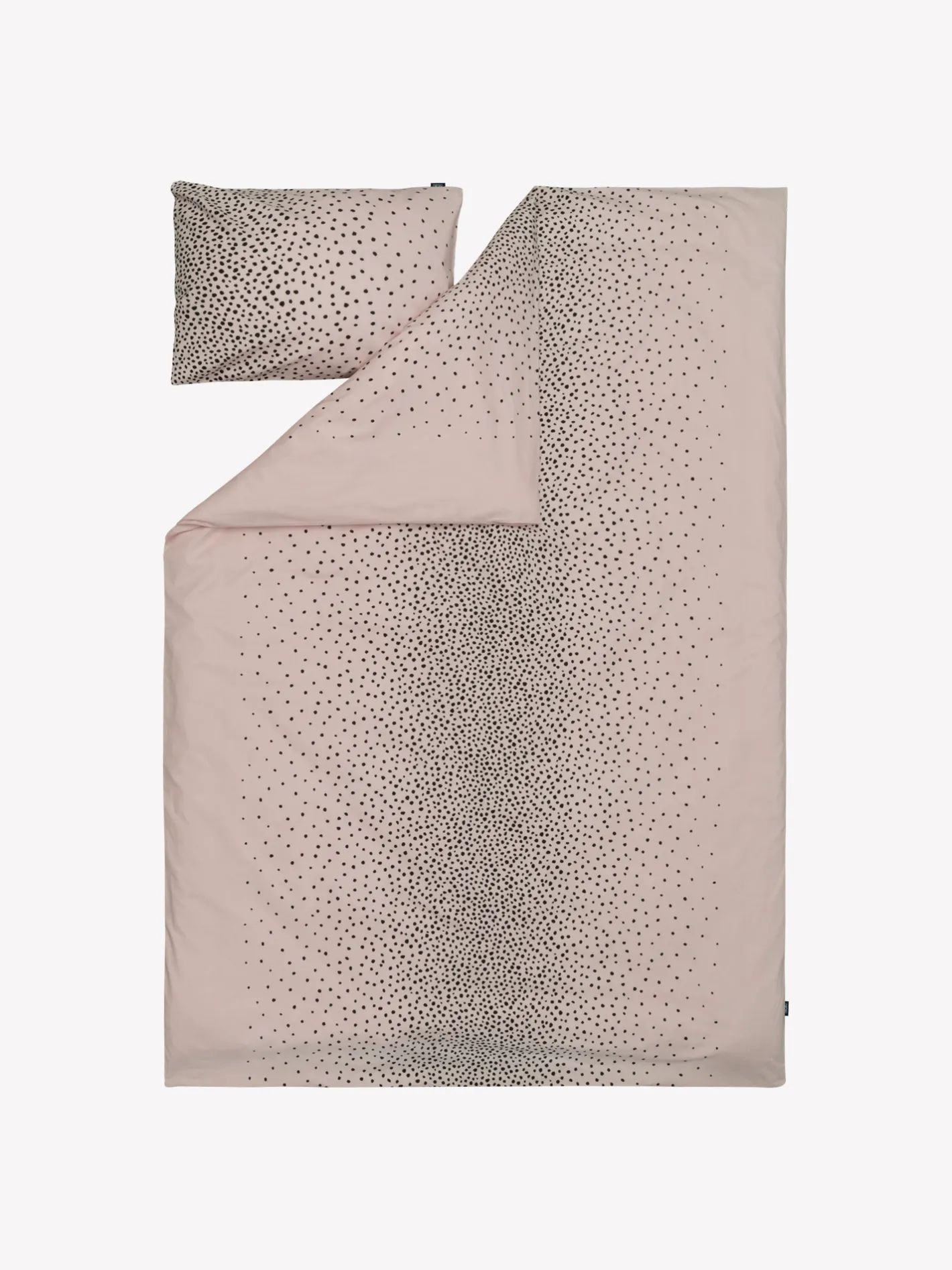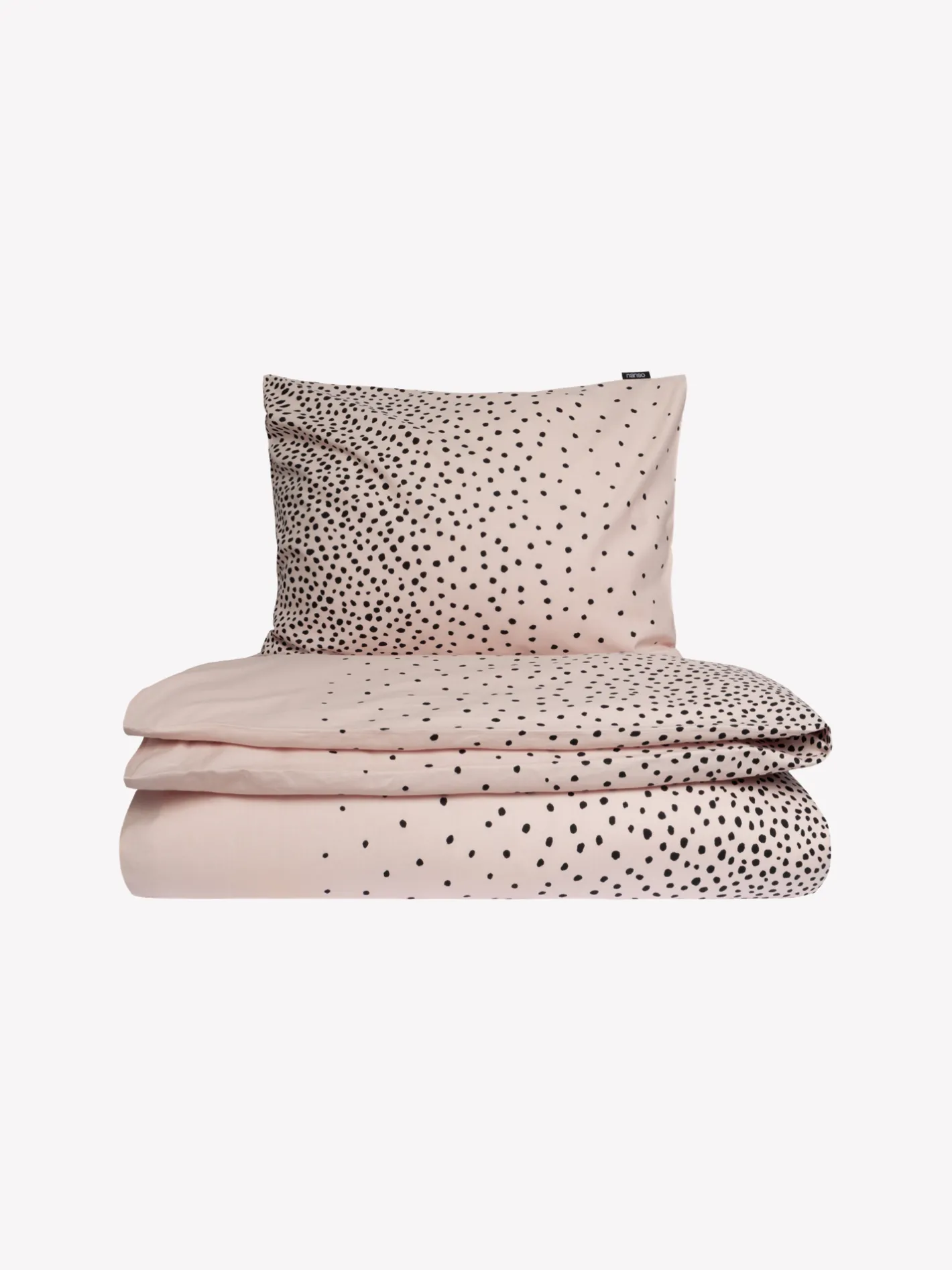 Täplä-pussilakanasetti ihastuttaa pilkkukuviollaan vaaleanpunaisessa värissä. Pussilakanasetti on tehty tiiviistä ja korkealaatuisesta puuvillapalttina kankaasta. Pussilakanan materiaali on ihastuttavan kevyttä ja ilmavaa, mikä nukkuessa tuntuu miellyttävältä ihoa vasten. Pussilakanan yläosan käsiaukot helpottavat pussilakanan pukemista peiton päälle. Pussilakanan koko on 150 x 210 cm ja tyynyliinan 50 x 60 cm.