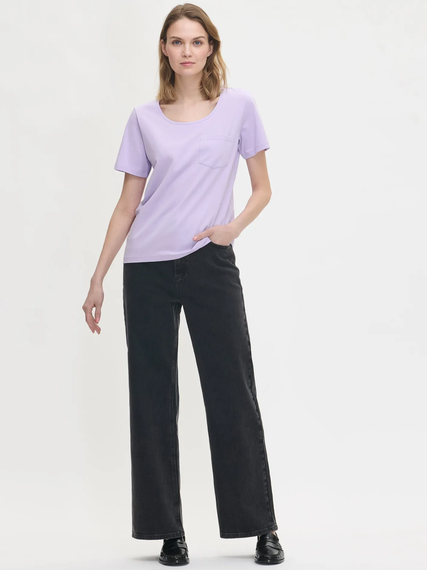 Naisten tyylikäs lila Tasku t-paita pyöreällä pääntiellä. Klassiseen t-paitaan voi aina luottaa, sillä se sopii vaivattomasti jokaiseen asuun. Hihat on lyhyet ja paidassa on rintatasku. T-paidan pituus koossa M on noin 65 cm. Materiaali on miellyttävää ja joustavaa puuvilla-elastaani-neulosta.