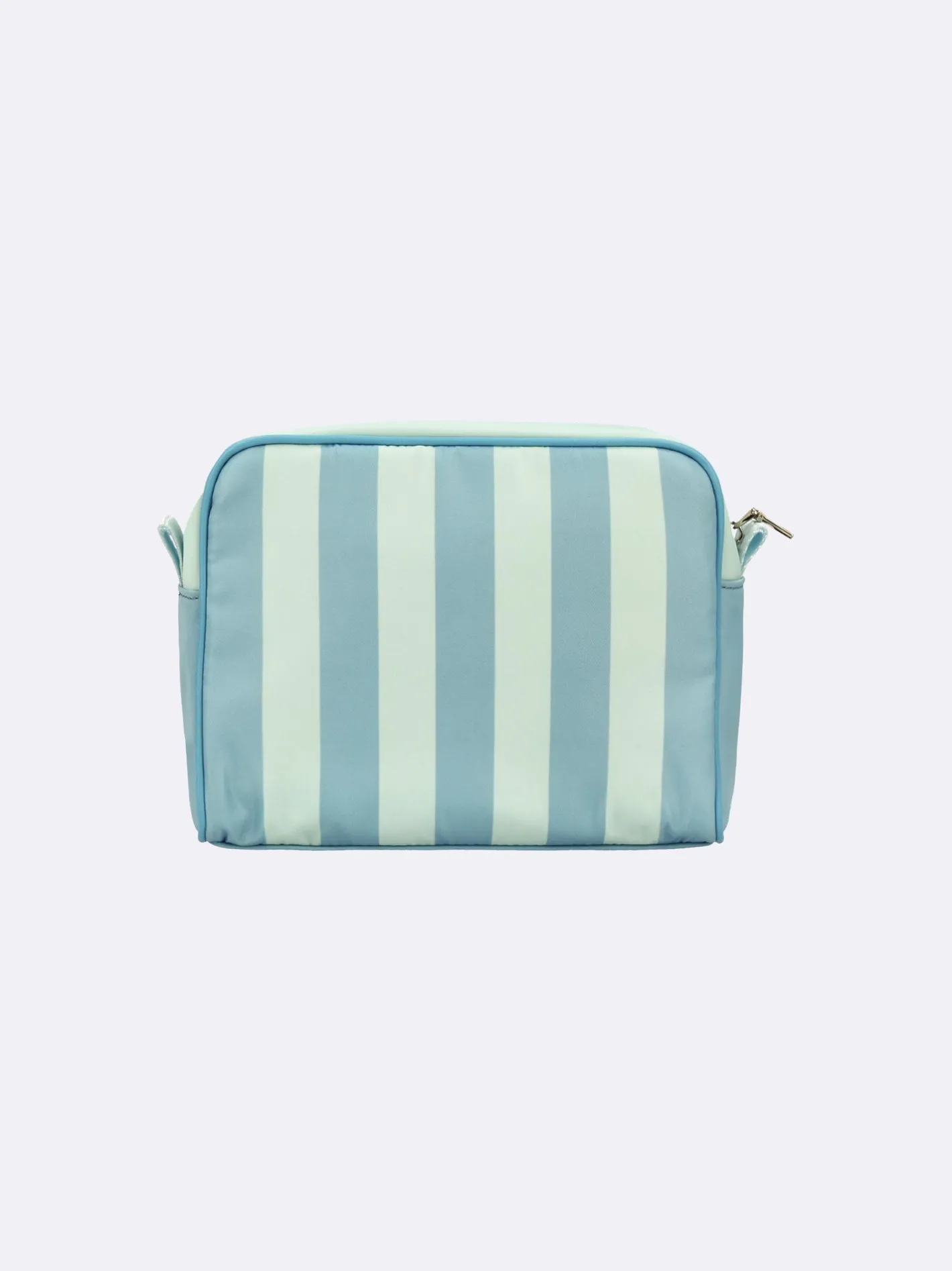 Raidallisen vaaleansinisen Tie -kosmetiikkalaukun päällinen on kestävää polyamidikangasta ja laukun sisäpuolella on likaahylkivä polyesterivuori. Sisäpuolella on kaksi avotaskua. Päällä on metallinen vetoketju. Kosmetiikkalaukun koko on noin 20 cm x 16 cm x 8 cm.