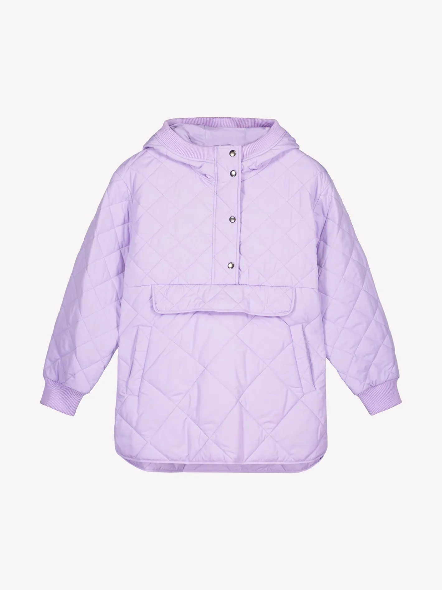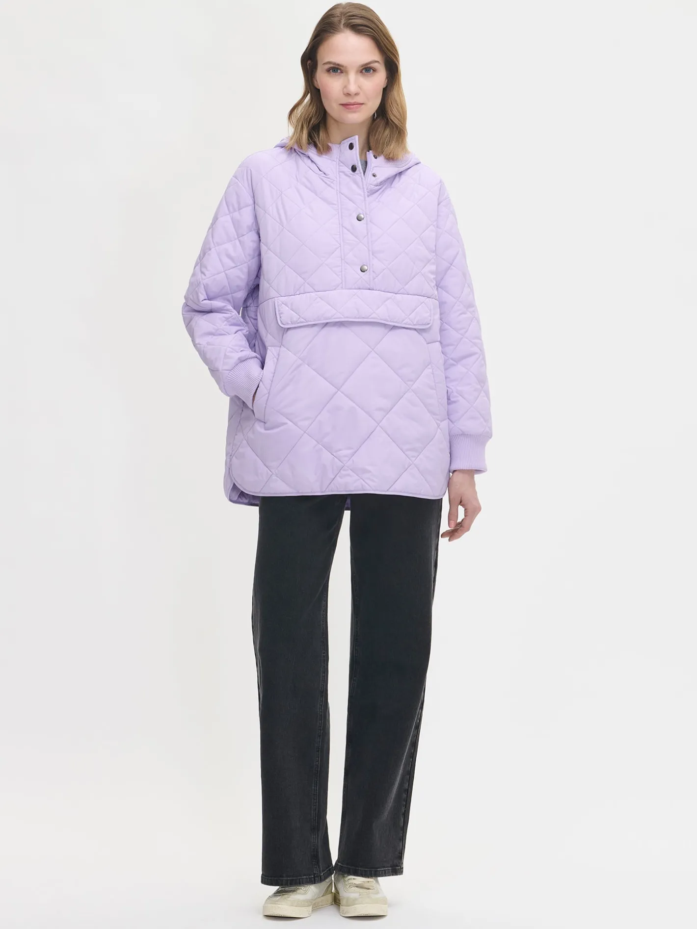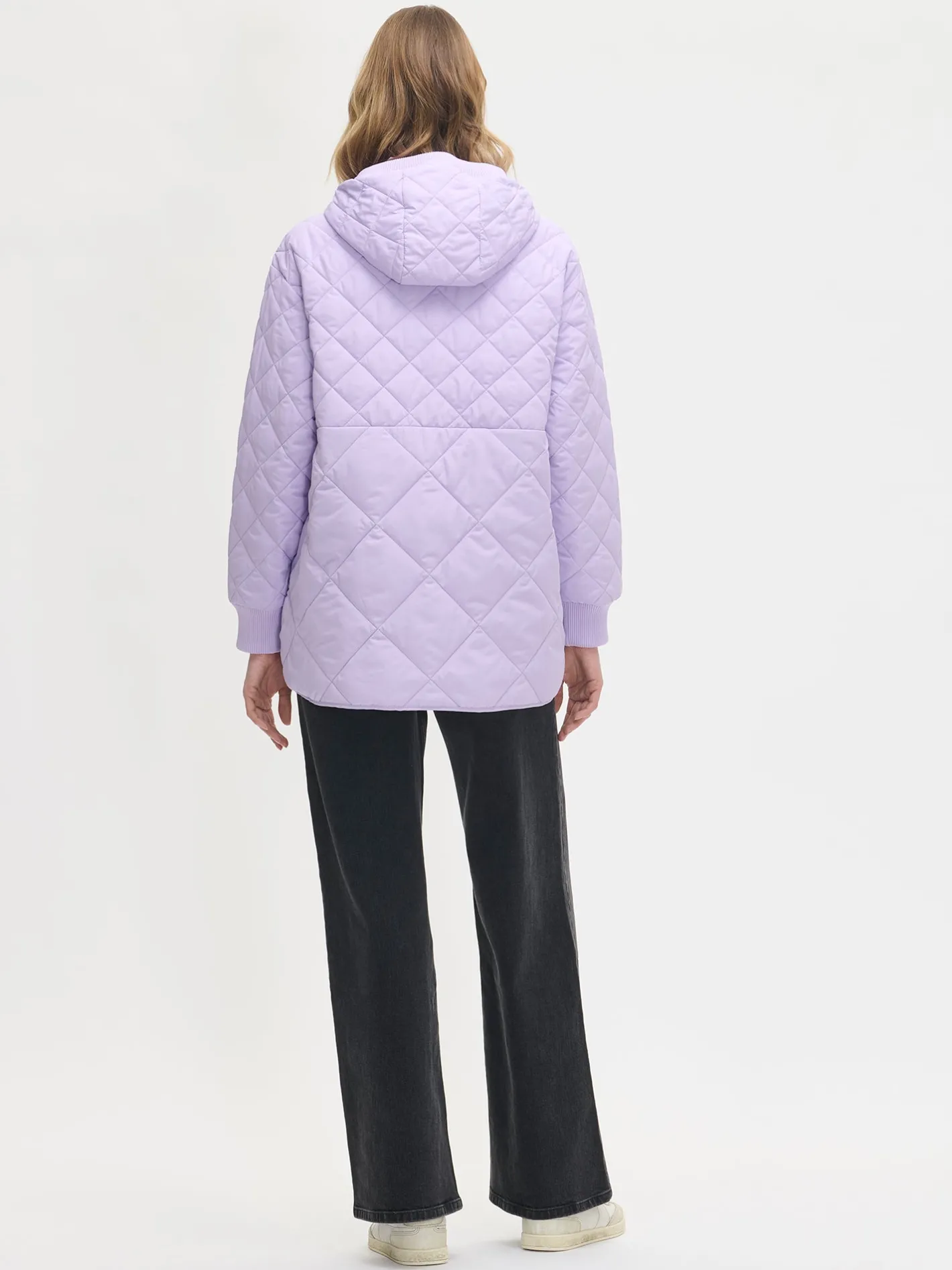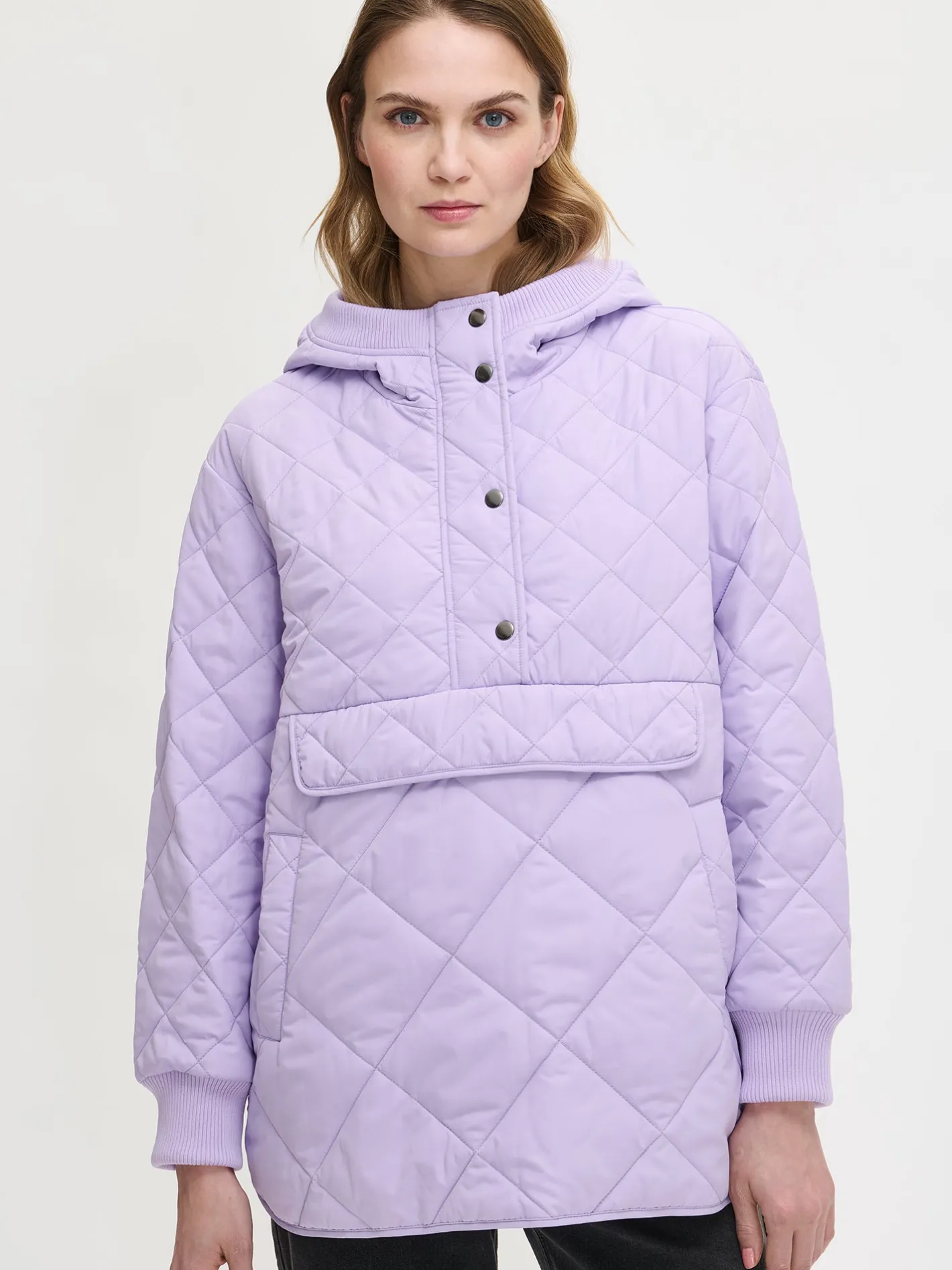 Naisten rento lila Anorakki-tikkitakki kevyellä Sorona-vanulla. Hupullisessa A-linjaisessa takissa on edessä puolipitkä vetoketju ja nepparikiinnitteinen tuulilista. Takissa on kaksi taskua edessä: kengurutasku vetoketjulla ja listatasku, joka on auki molemmilta sivuilta. Hupun reunassa ja hihansuissa on mukava neulosresori. Takissa on pudotettu olkalinja ja pyöristetty helma. Takin pituus koossa M on noin 75 cm. Materiaali on laadukasta vettähylkivää kierrätyspolyesteria ja takissa on Sorona-vanu.