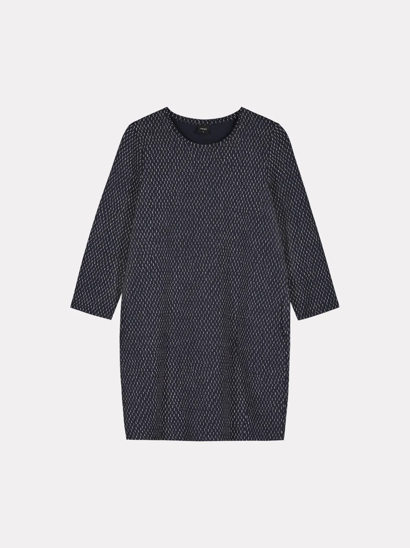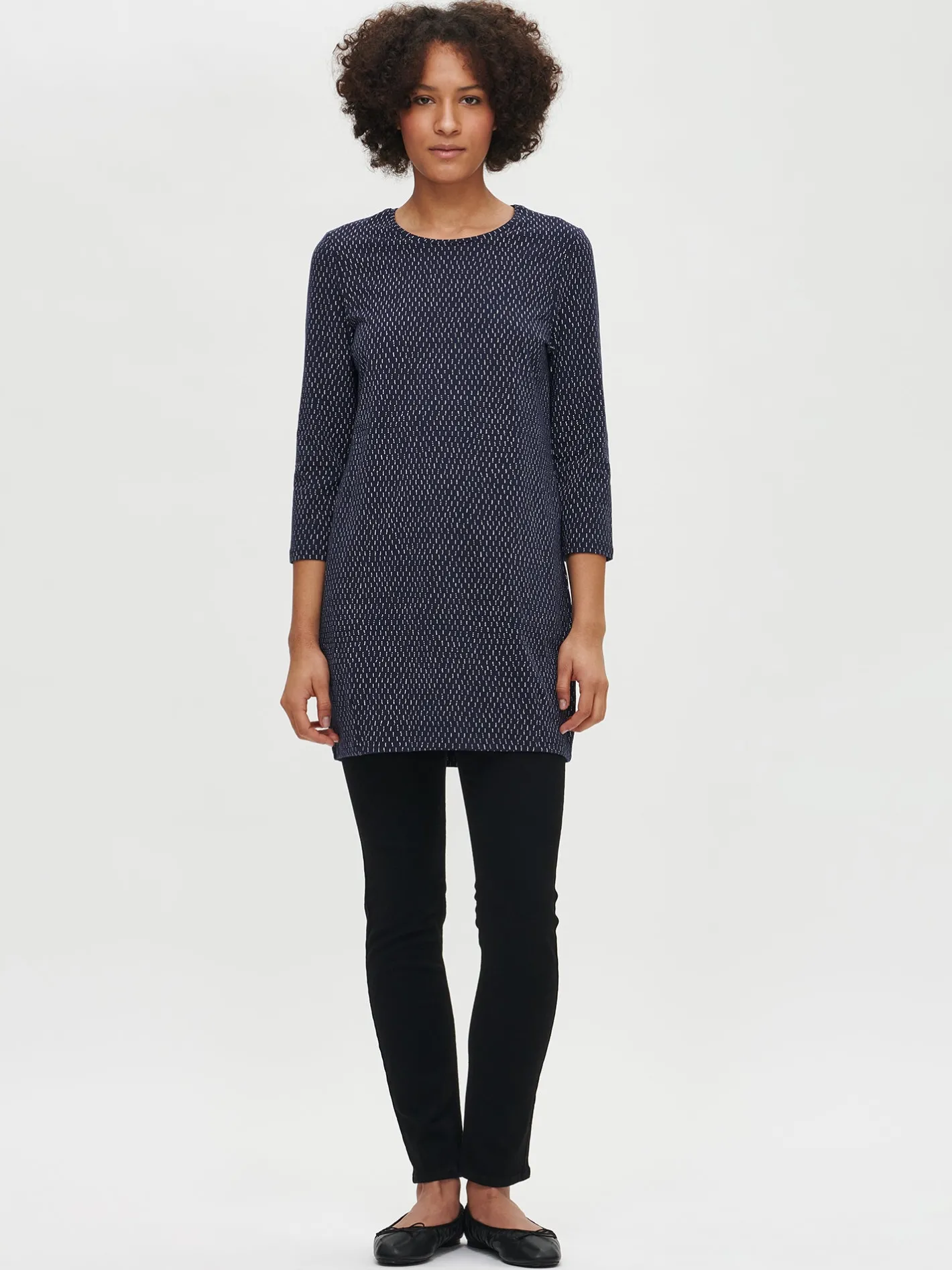Naisten kuosillinen tummansininen Tiplu-tunika. Rentolinjaisessa tunikassa on helmassa muotolaskokset luomassa tulppaanimaista muotoa. Tunikan avara pyöreä pääntie on viimeistelty tereellä, sivuissa on taskut ja hihat ovat 3/4 pituiset. Tunikan pituus koossa M on noin 85 cm. Materiaali on laadukasta ja helppohoitoista puuvilla-elastaani-neulosta, joka pysyy hyvänä pesusta toiseen.
