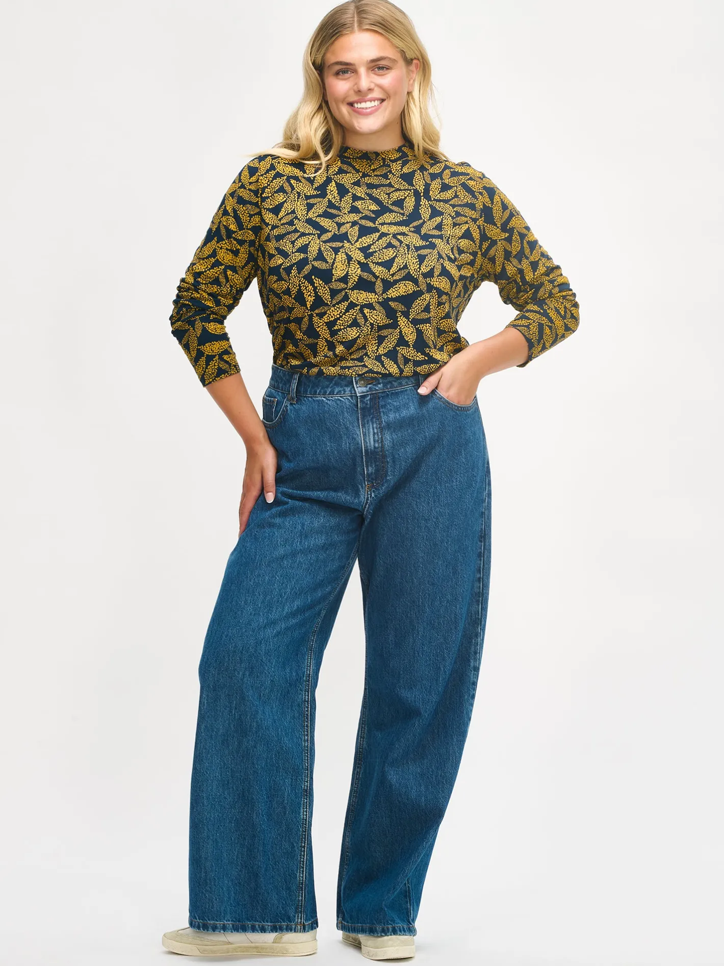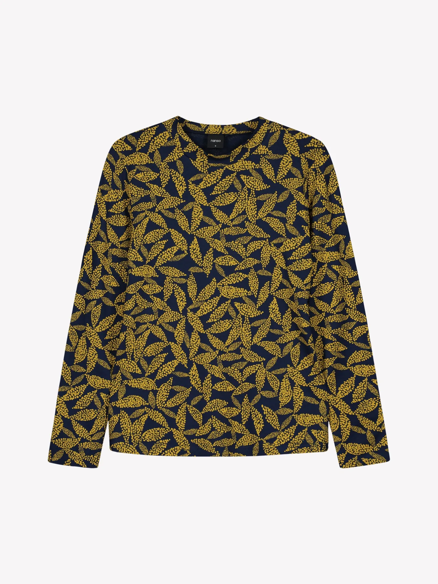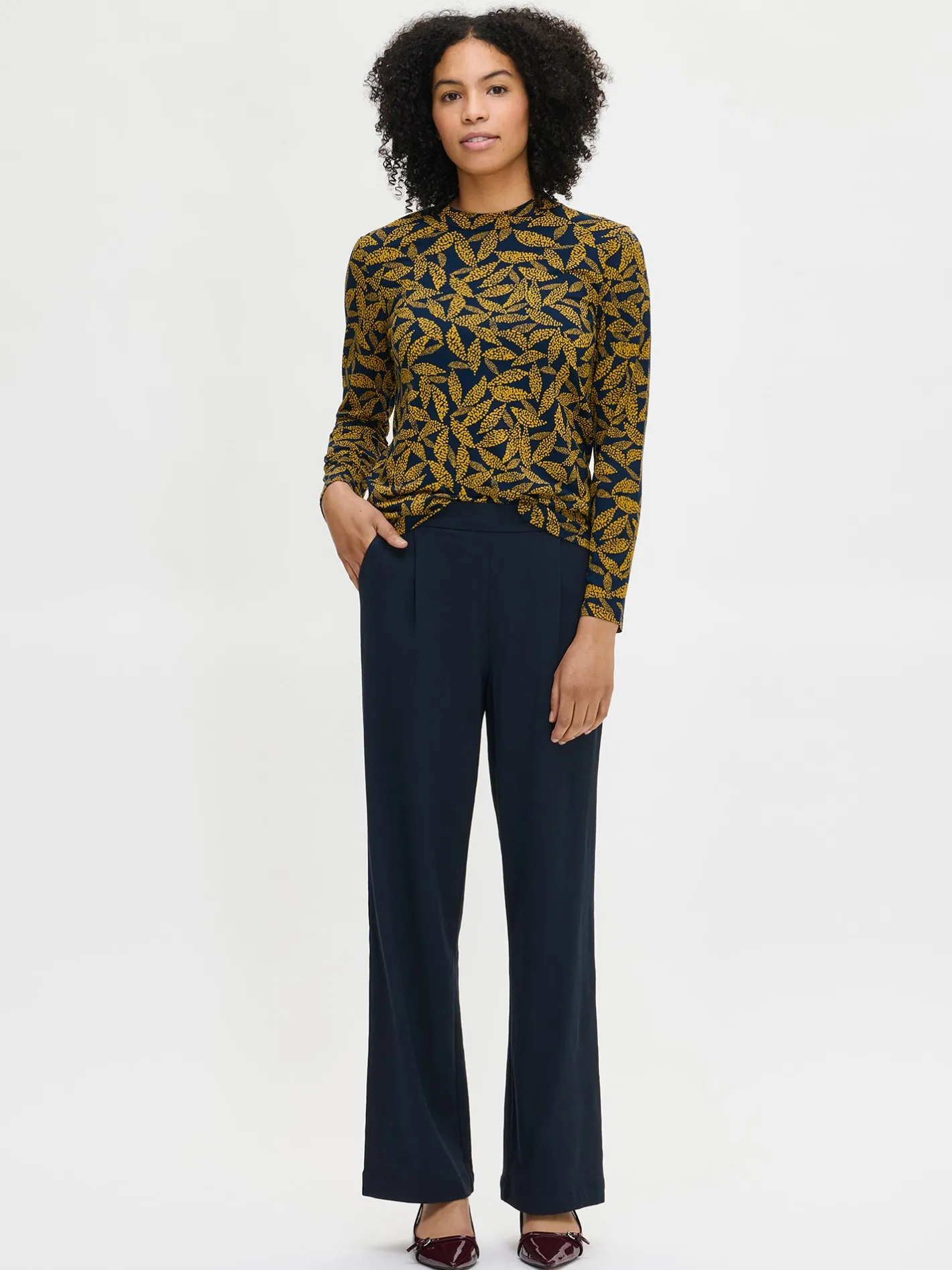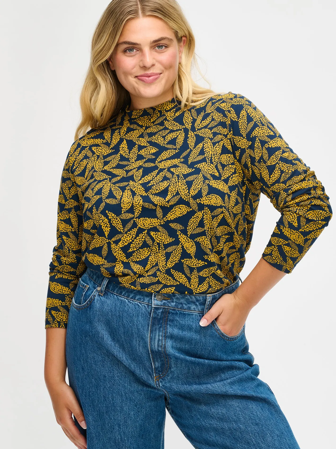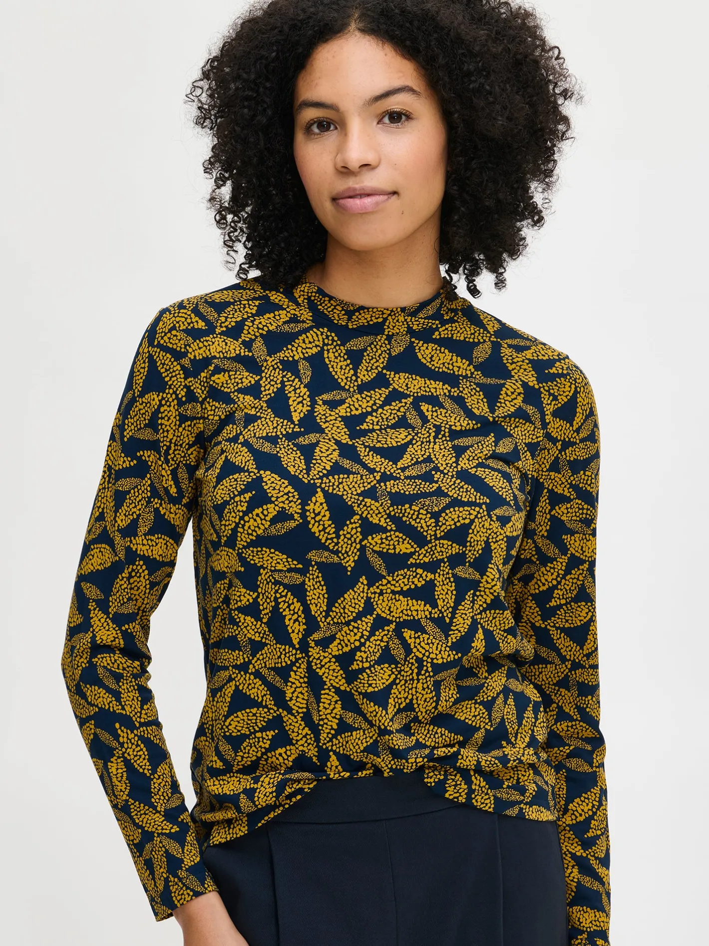 Naisten kuosillinen keltainen Triine-pusero pienellä pystykauluksella. Suoralinjaisessa puserossa on täyspitkät hihat. Puseron pituus koossa M on noin 65 cm. Materiaali on laadukasta ja miellyttävän tuntuista, ohutta viskoosi-elastaani-neulosta. Viskoosineulos on sähköistymätöntä ja helppohoitoista. Tuote on valmistettu LENZING™ ECOVERO™ -viskoosista. Materiaalille on ominaista 3-5 % kutistuminen ensimmäisessä pesussa.