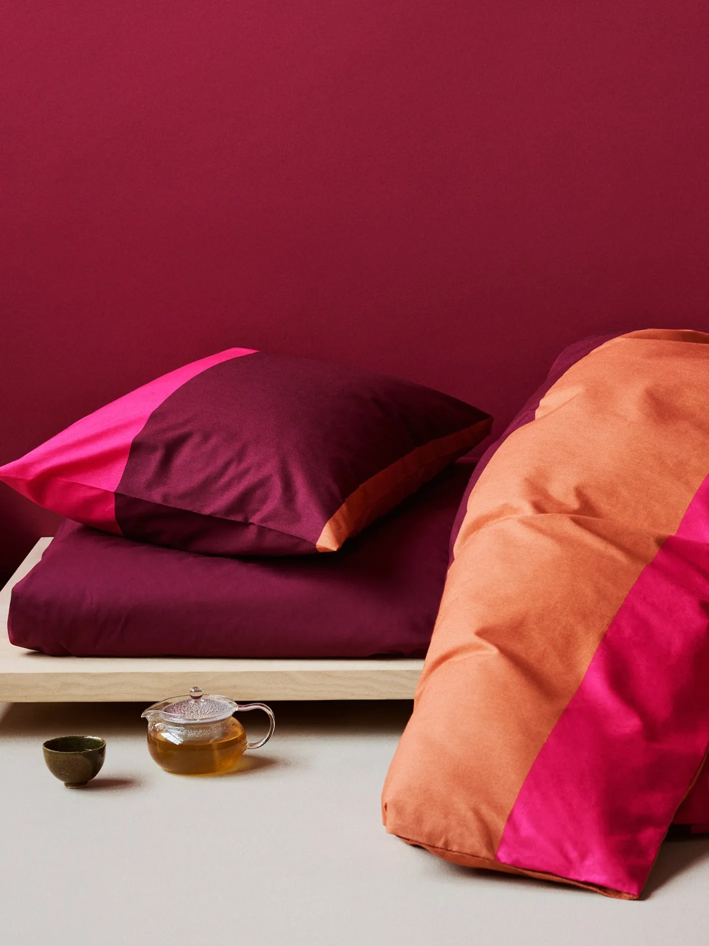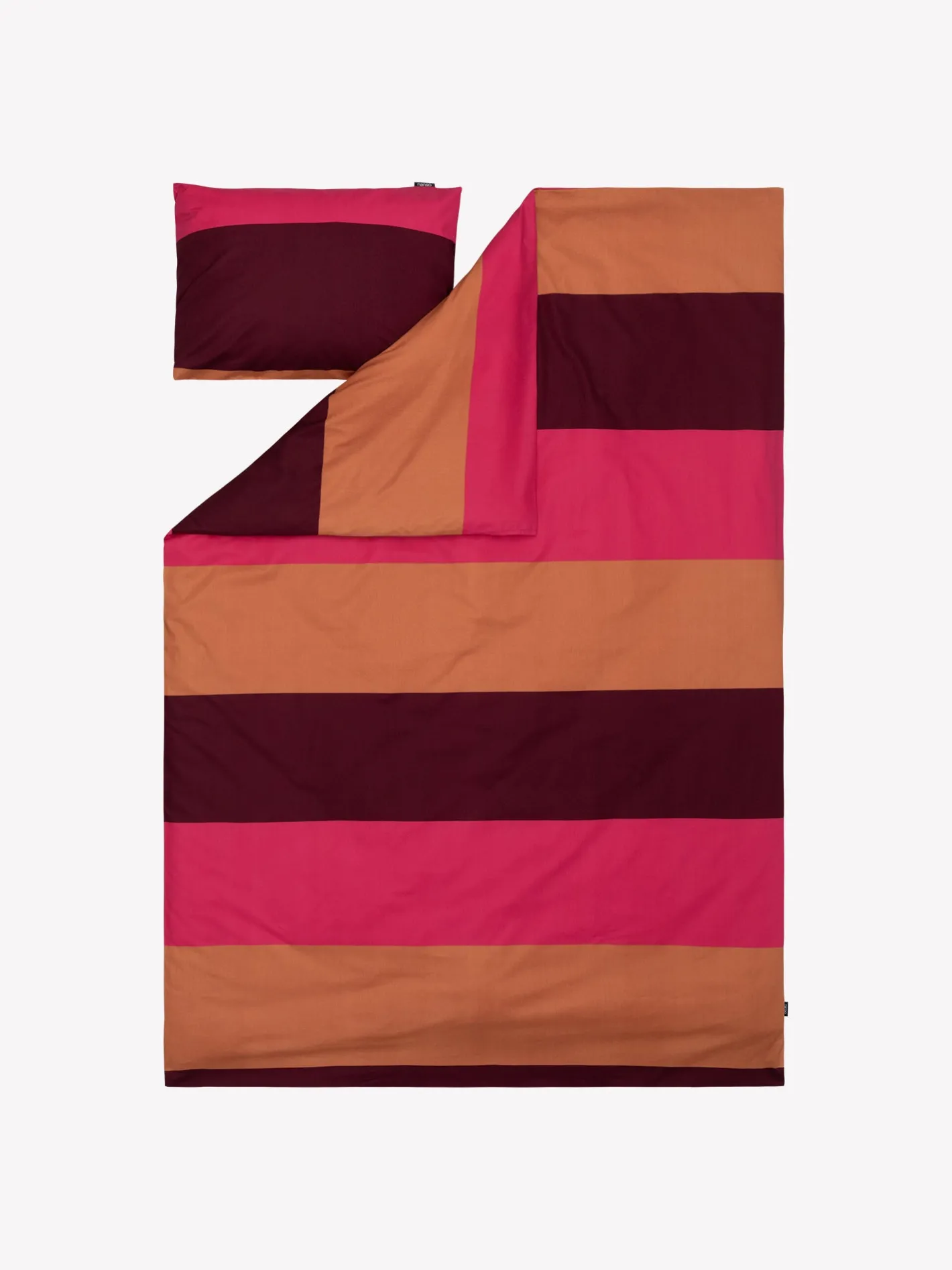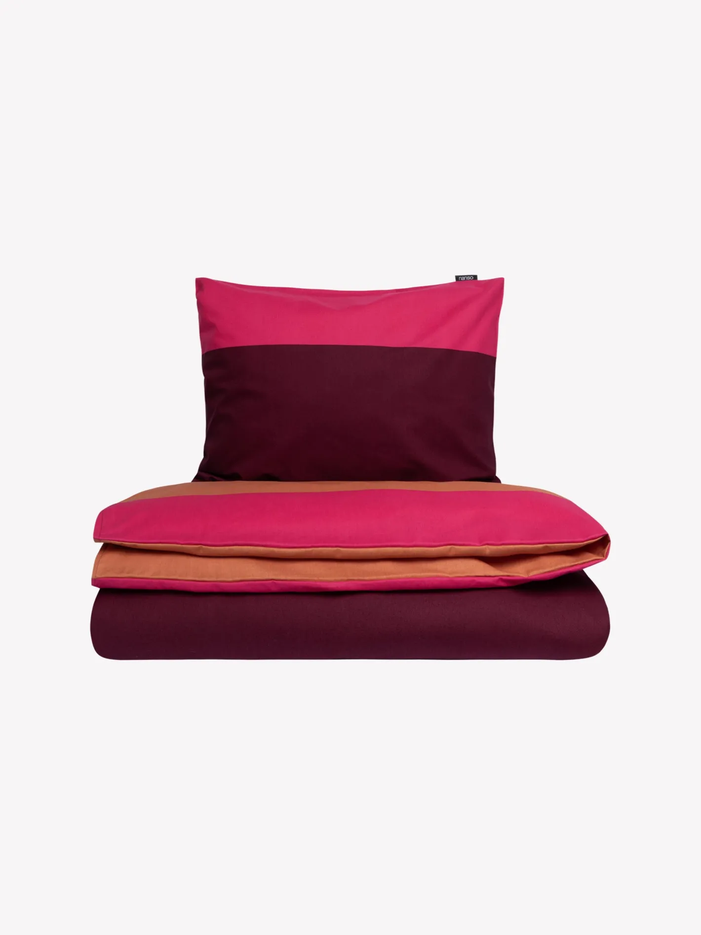 Punainen Trio-pussilakanasetissä on kaunis leveä raitakuosi, joka tuo petaukseen modernia ilmettä. Raitakuvion aloitusväri voi vaihdella sen mukaan, mistä kohtaa kangas on leikattu, mutta raidat ovat aina saman levyisiä. Lakanan toinen puoli on yksivärinen, toinen puoli raidoitettu. Pussilakanasetti on tehty tiiviistä ja korkealaatuisesta puuvillapalttinasta. Materiaali on ihastuttavan kevyttä ja ilmavaa, ja se tuntuu miellyttävältä ihoa vasten. Pussilakanan yläosan kätevät käsiaukot helpottavat peiton petaamista. Pussilakanan koko on 150 x 210 cm ja tyynyliinan 50 x 60 cm.