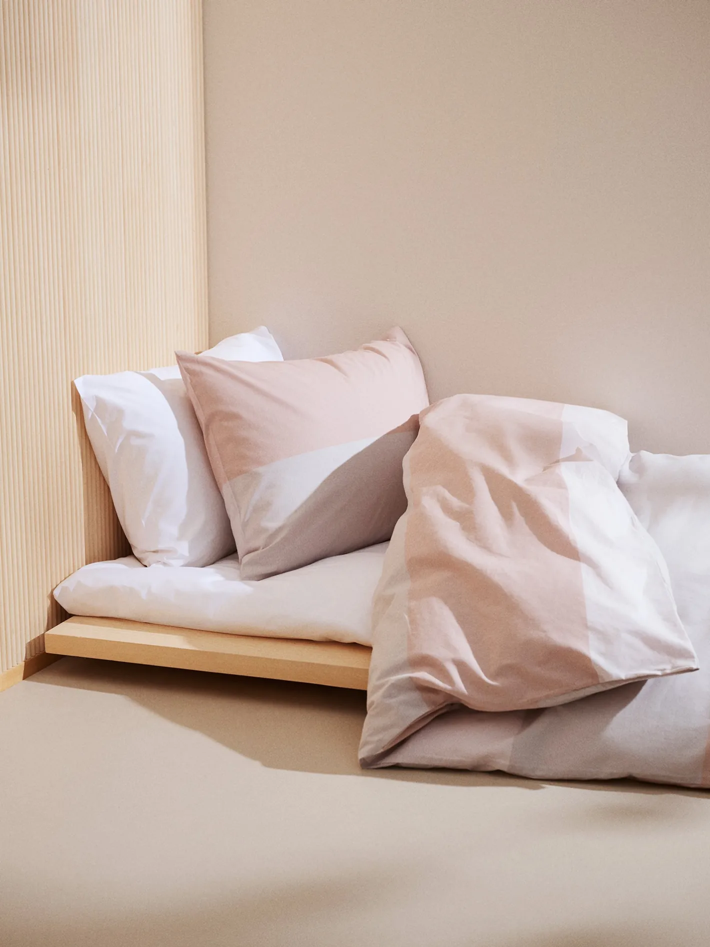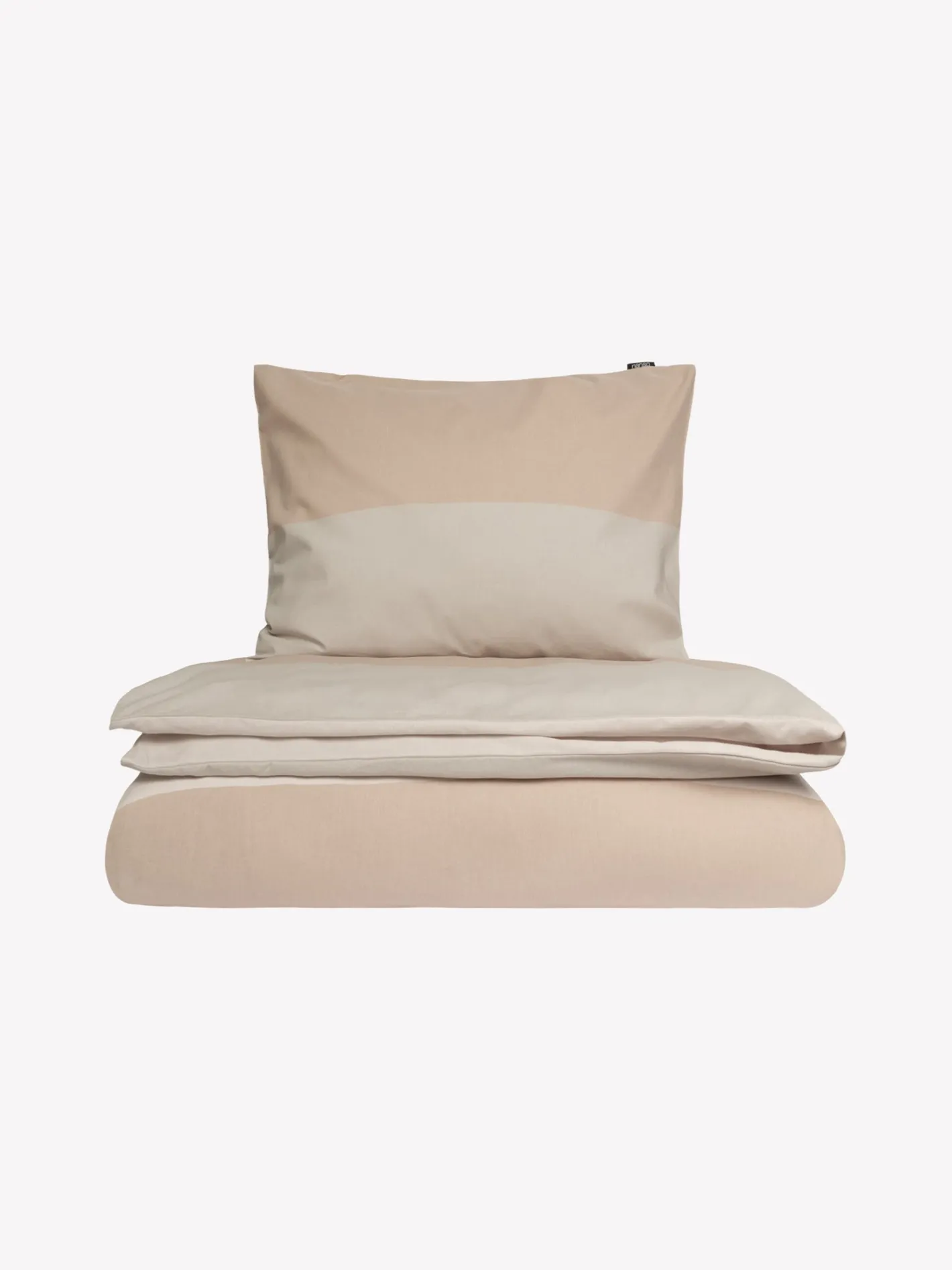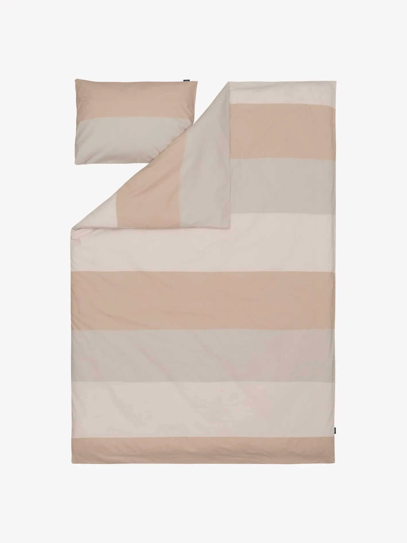 Beigessä Trio-pussilakanasetissä on kaunis leveä raitakuosi, joka tuo petaukseen modernia ilmettä. Raitakuvion aloitusväri voi vaihdella sen mukaan, mistä kohtaa kangas on leikattu, mutta raidat ovat aina saman levyisiä. Lakanan toinen puoli on yksivärinen, toinen puoli raidoitettu. Pussilakanasetti on tehty tiiviistä ja korkealaatuisesta puuvillapalttinasta. Materiaali on ihastuttavan kevyttä ja ilmavaa, ja se tuntuu miellyttävältä ihoa vasten. Pussilakanan yläosan kätevät käsiaukot helpottavat peiton petaamista. Pussilakanan koko on 150 x 210 cm ja tyynyliinan 50 x 60 cm.