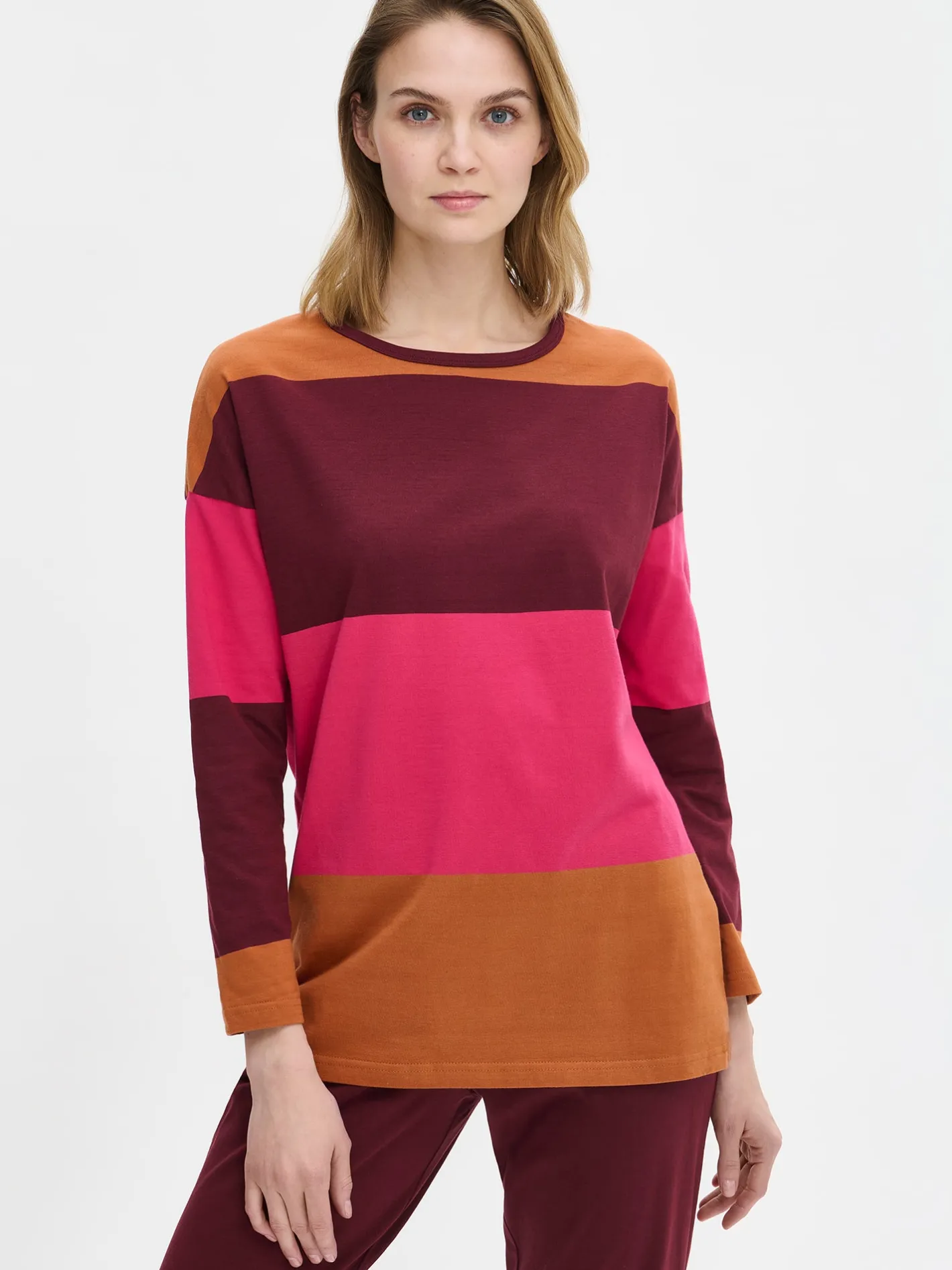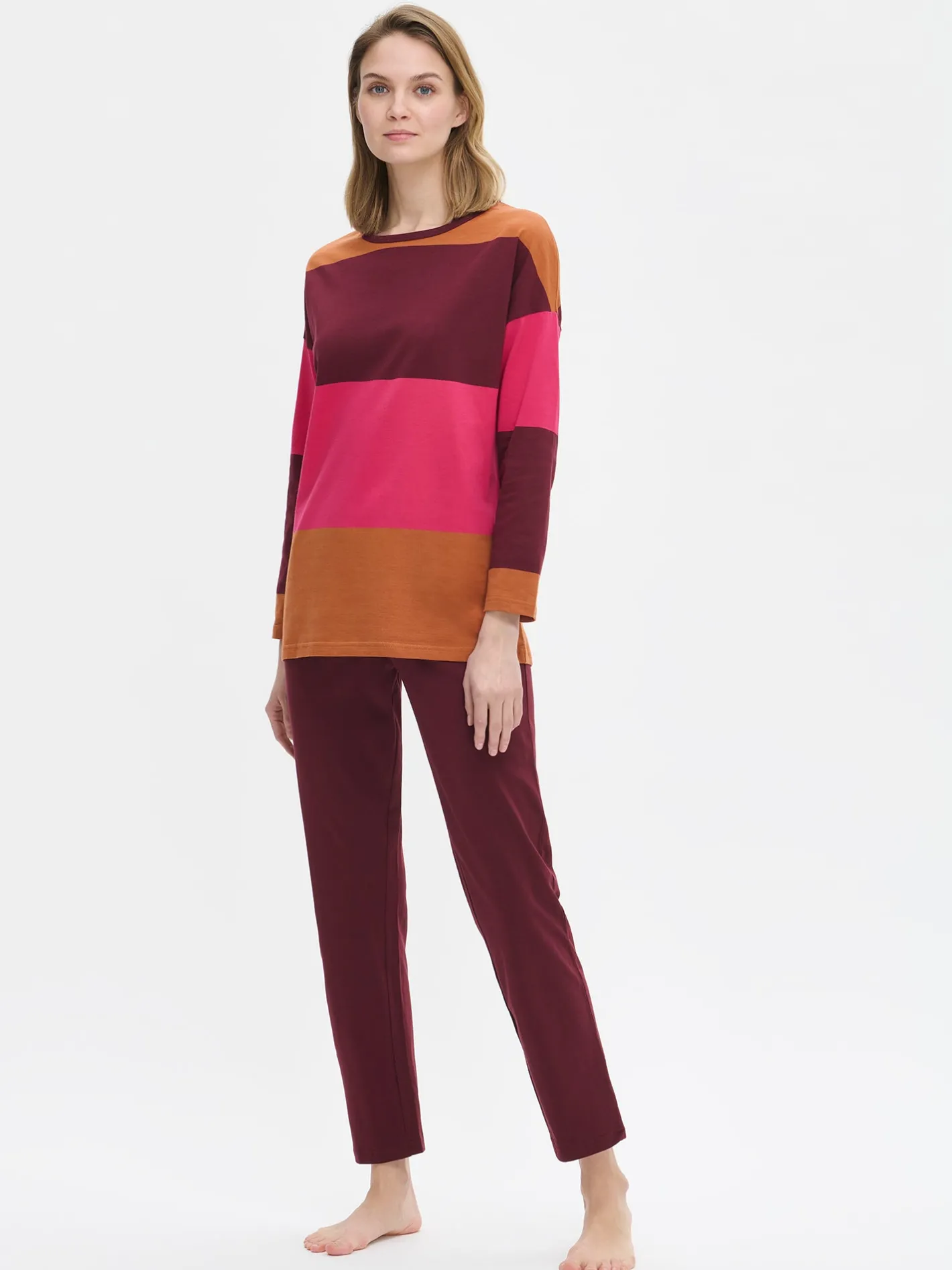 Naisten raidallinen Trio-pyjama pitkillä hihoilla ja pyöreällä pääntiellä. Rennon pyjaman paidan pituus koossa M on noin 76 cm. Yksiväriset housut ovat täyspitkät. Materiaali on laadukasta, iholla miellyttävän pehmeältä tuntuvaa ja helppohoitoista puuvillaneulosta, joka pysyy hyvänä pesusta toiseen. Neulos on valmistettu sertifioidusta puuvillasta.