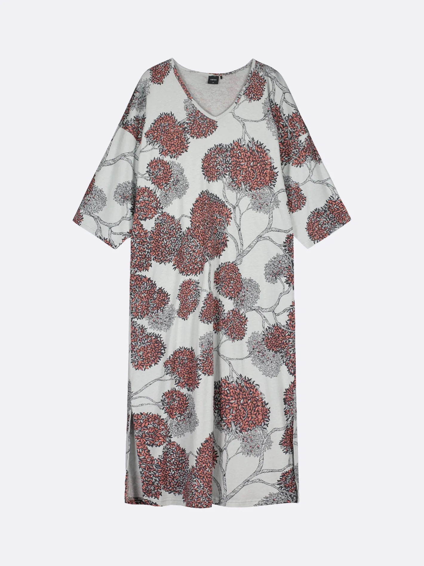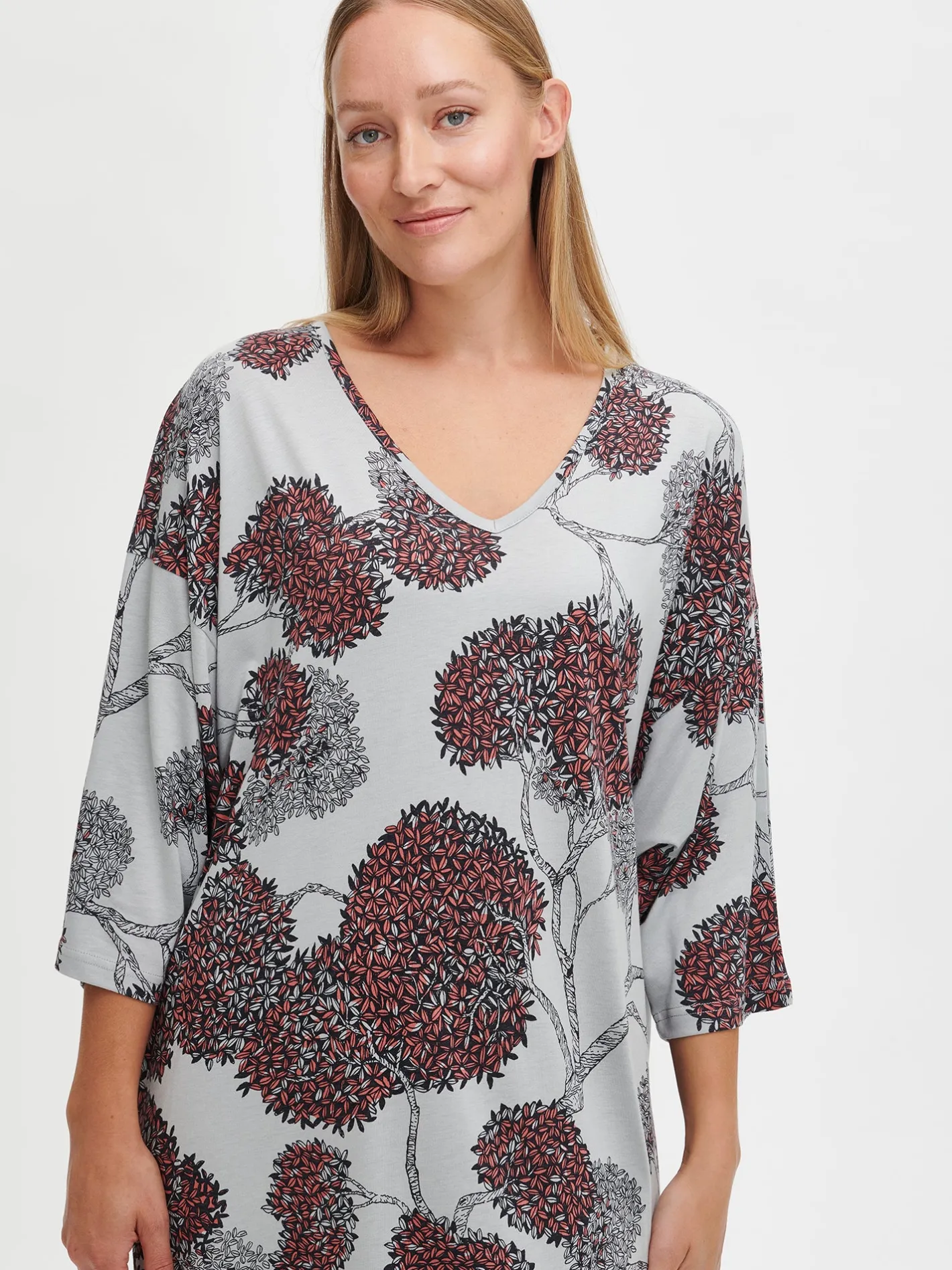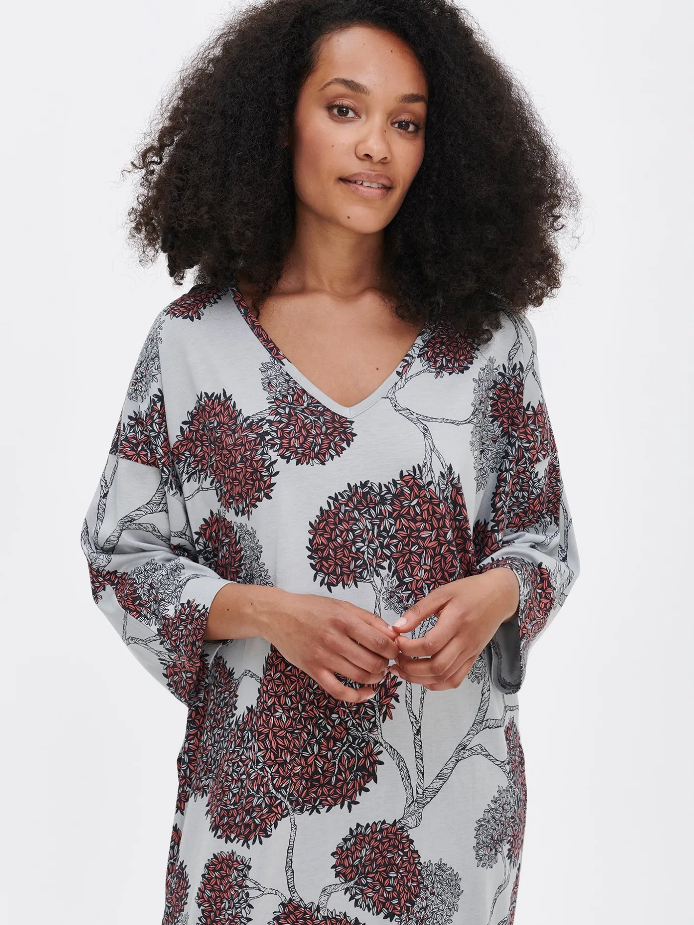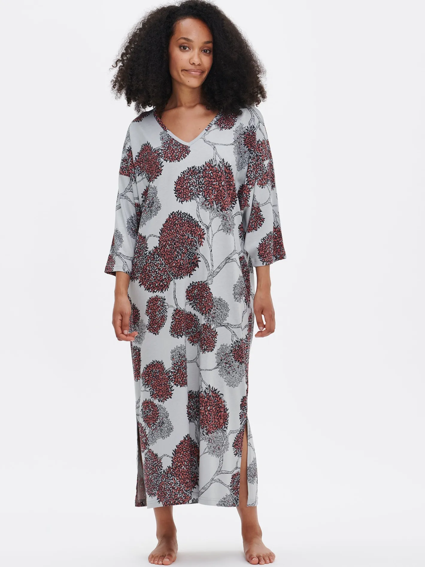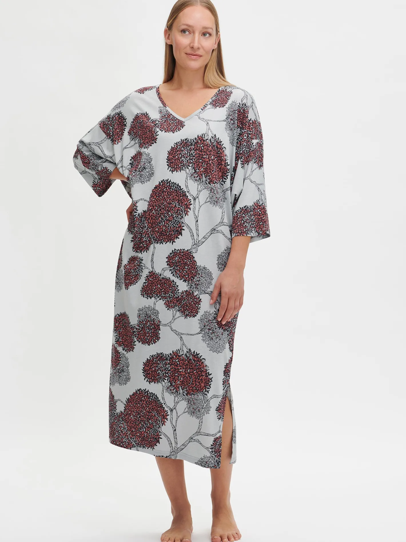 Naisten ihastuttava harmaa Tuomi-kaftaani pudotetulla olkalinjalla ja V-pääntiellä. Kaftaani on malliltaan väljä ja hihat ovat 3/4-pituiset. Helmassa on sivuhalkiot. Pituus koossa M noin 120 cm. Materiaali on laadukasta, iholla miellyttävän pehmeältä tuntuvaa ja helppohoitoista puuvilla-modaalia, joka pysyy hyvänä pesusta toiseen.