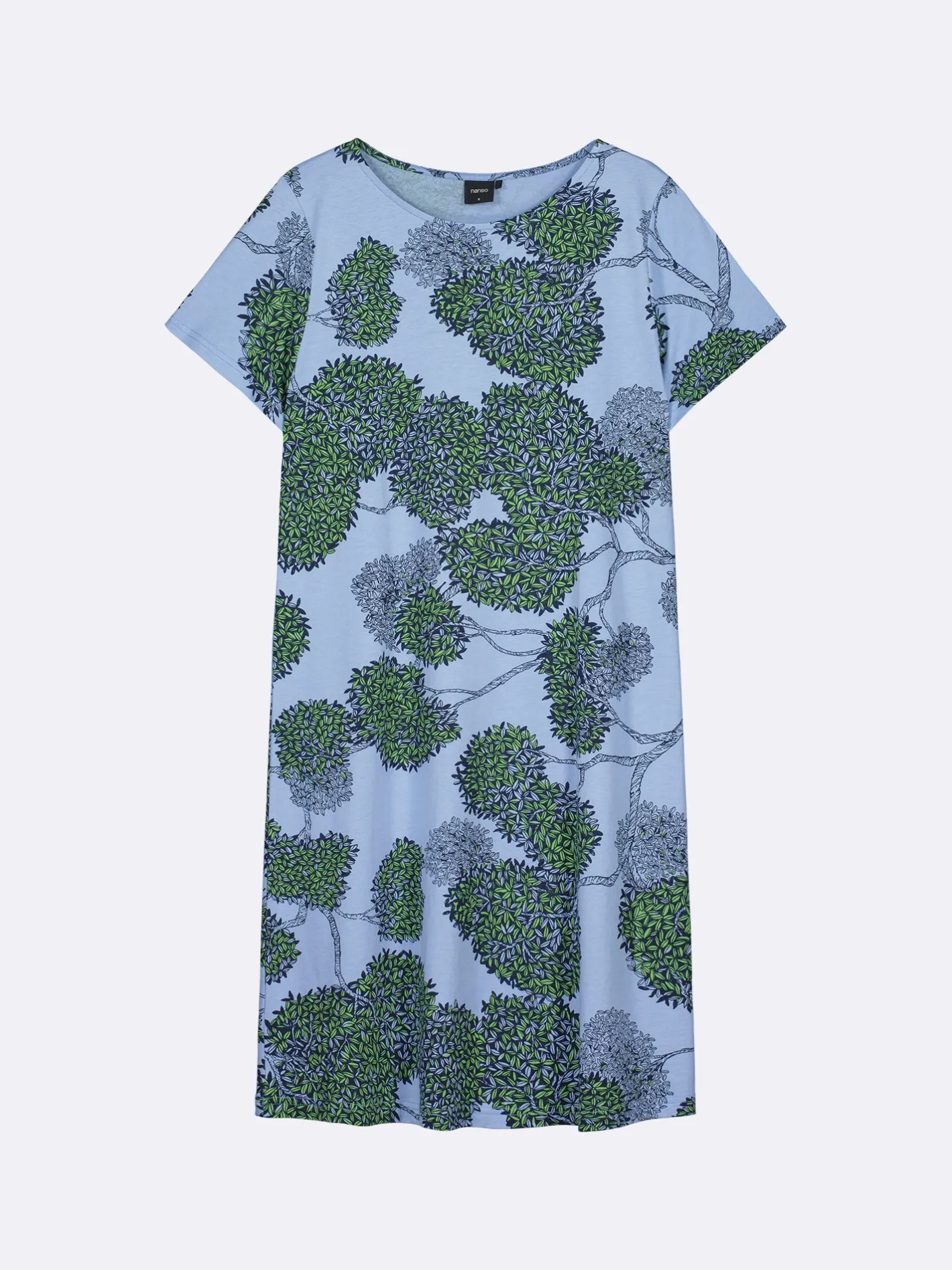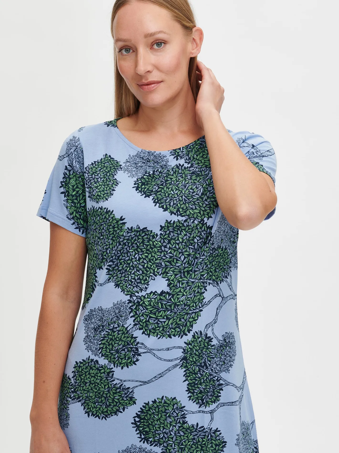 Naisten kuosillinen sininen Tuomi-yöpaita lyhyillä hihoilla ja ovaalilla pääntiellä. Yöpaidan pituus koossa M on noin 95 cm. Materiaali on laadukasta, iholla miellyttävän pehmeältä tuntuvaa ja helppohoitoista puuvilla-modaalia, joka pysyy hyvänä pesusta toiseen.