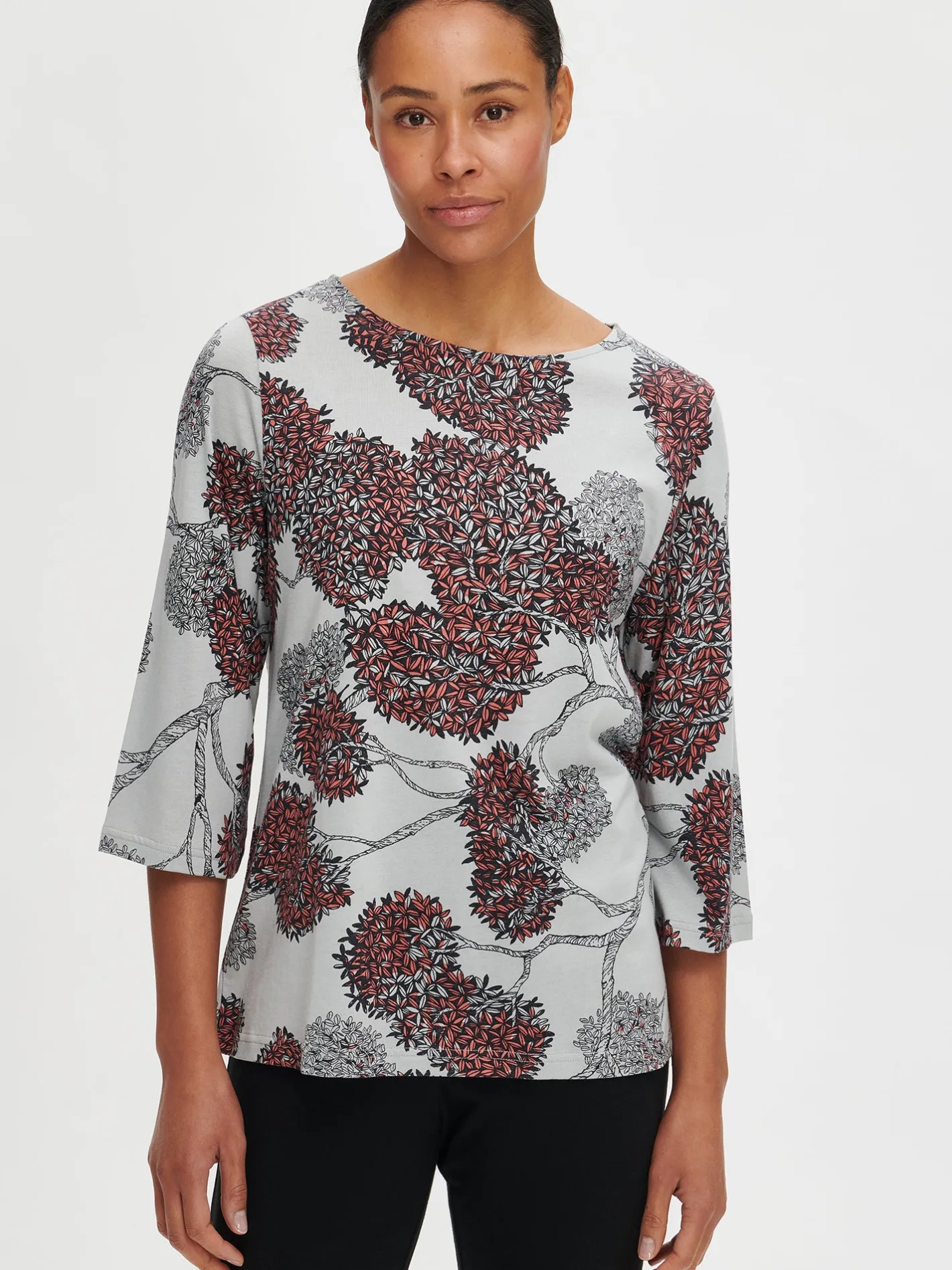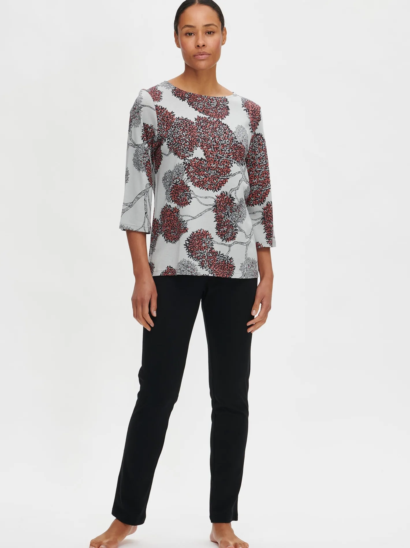Naisten kuosillinen harmaa Tuomi-pyjama 3/4 pituisilla hihoilla ja ovaalilla pääntiellä. Yöpaidan pituus koossa M on noin 67 cm. Housut ovat täyspitkät. Materiaali on laadukasta, iholla miellyttävän pehmeältä tuntuvaa ja helppohoitoista puuvilla-modaalia, joka pysyy hyvänä pesusta toiseen.