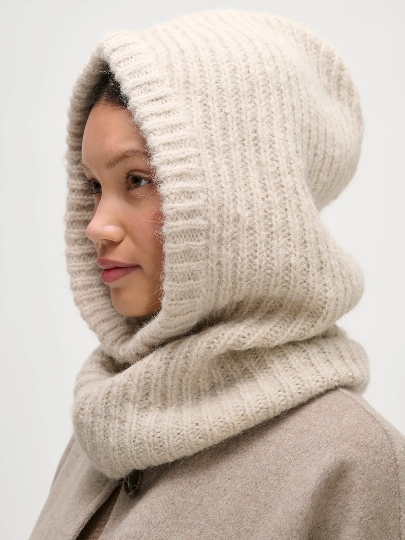 Naisten muhkea ja trendikäs beige Usva-neulehuppu. Huppu pitää samalla sekä pään että kaulan lämpimänä. Neulos on laadukasta, pehmeän ja miellyttävän tuntuista setifioitua villa-alpakka-sekoitetta. Neuleen hoito-ohjeet löydät