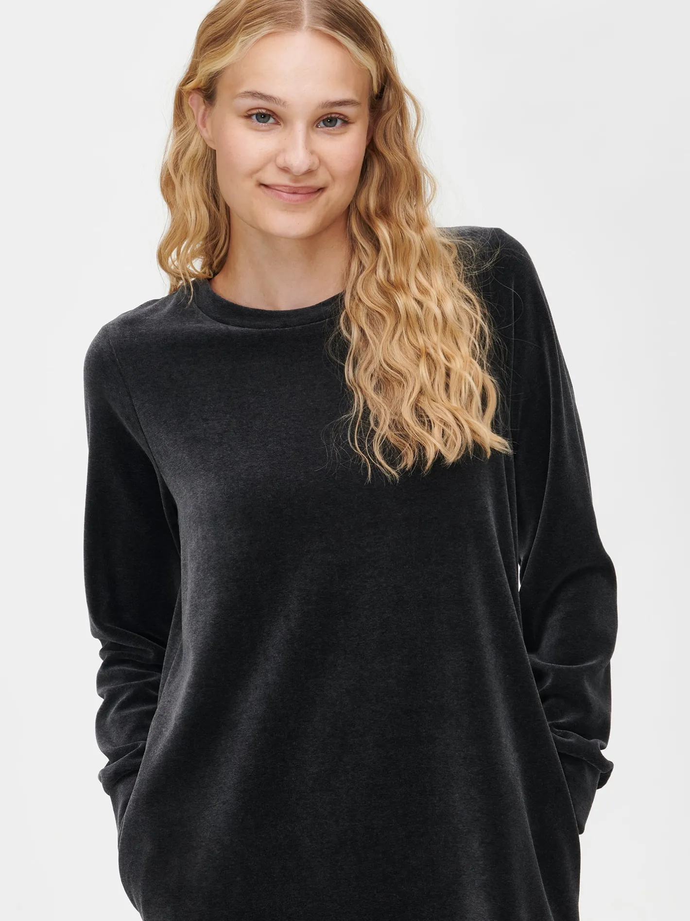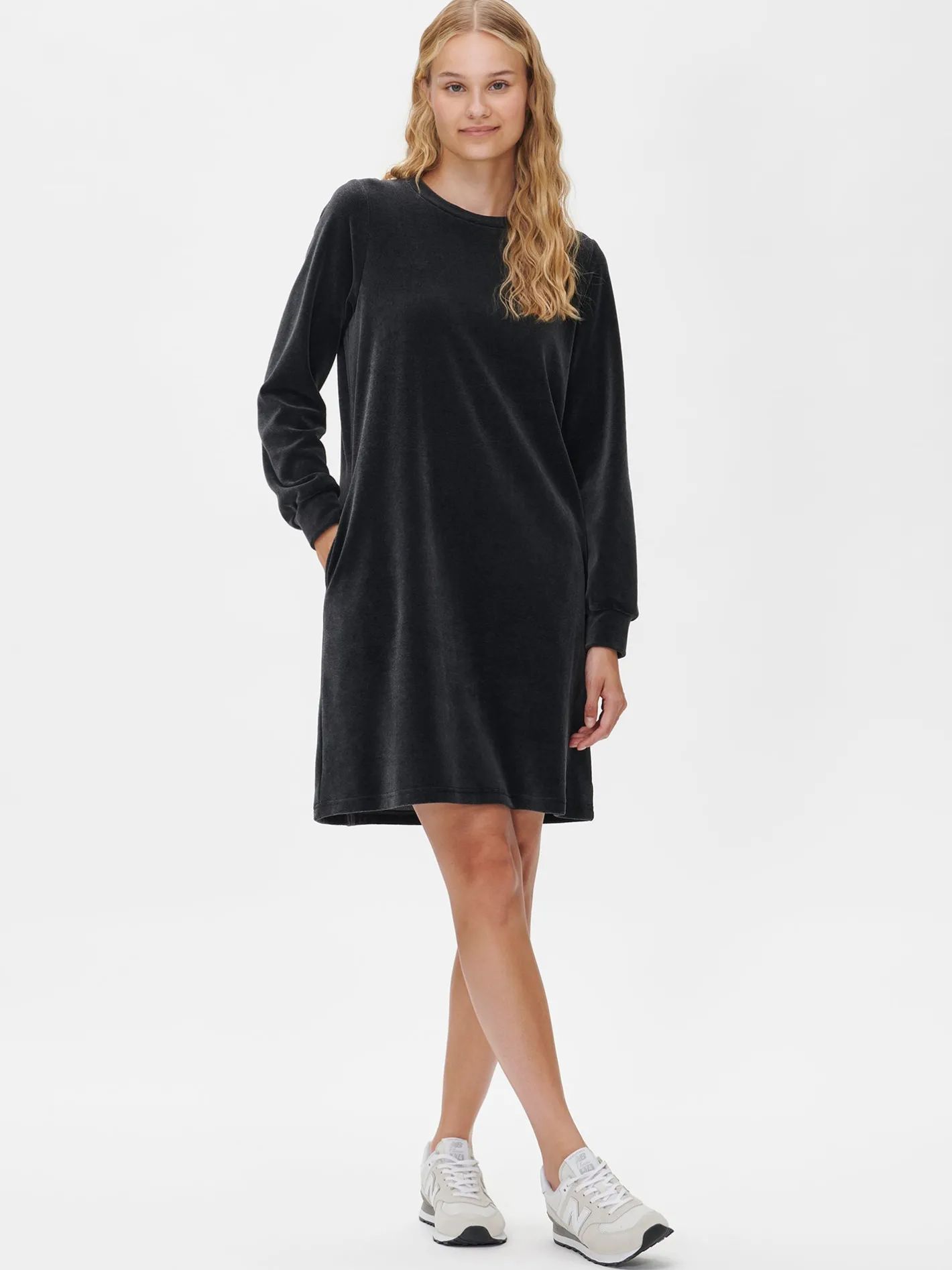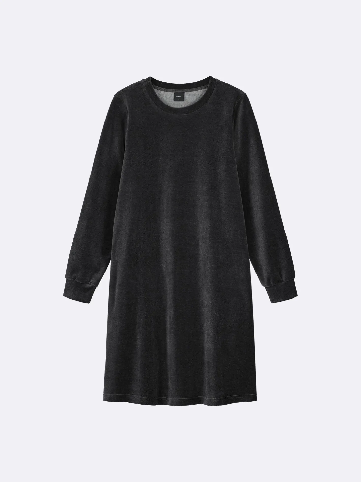 Naisten rento ja mukava meleerattu harmaa Veluuri-mekko sivutaskuilla. Mekossa on pyöreä pääntie ja täyspitkät hihat leveillä rannekkeilla. Mekon pituus koossa M on noin 95 cm. Materiaali on laadukasta ja pehmeää puuvilla-polyesteriveluuria. Materiaalille on ominaista 3-5% kutistuminen ensimmäisessä pesussa.