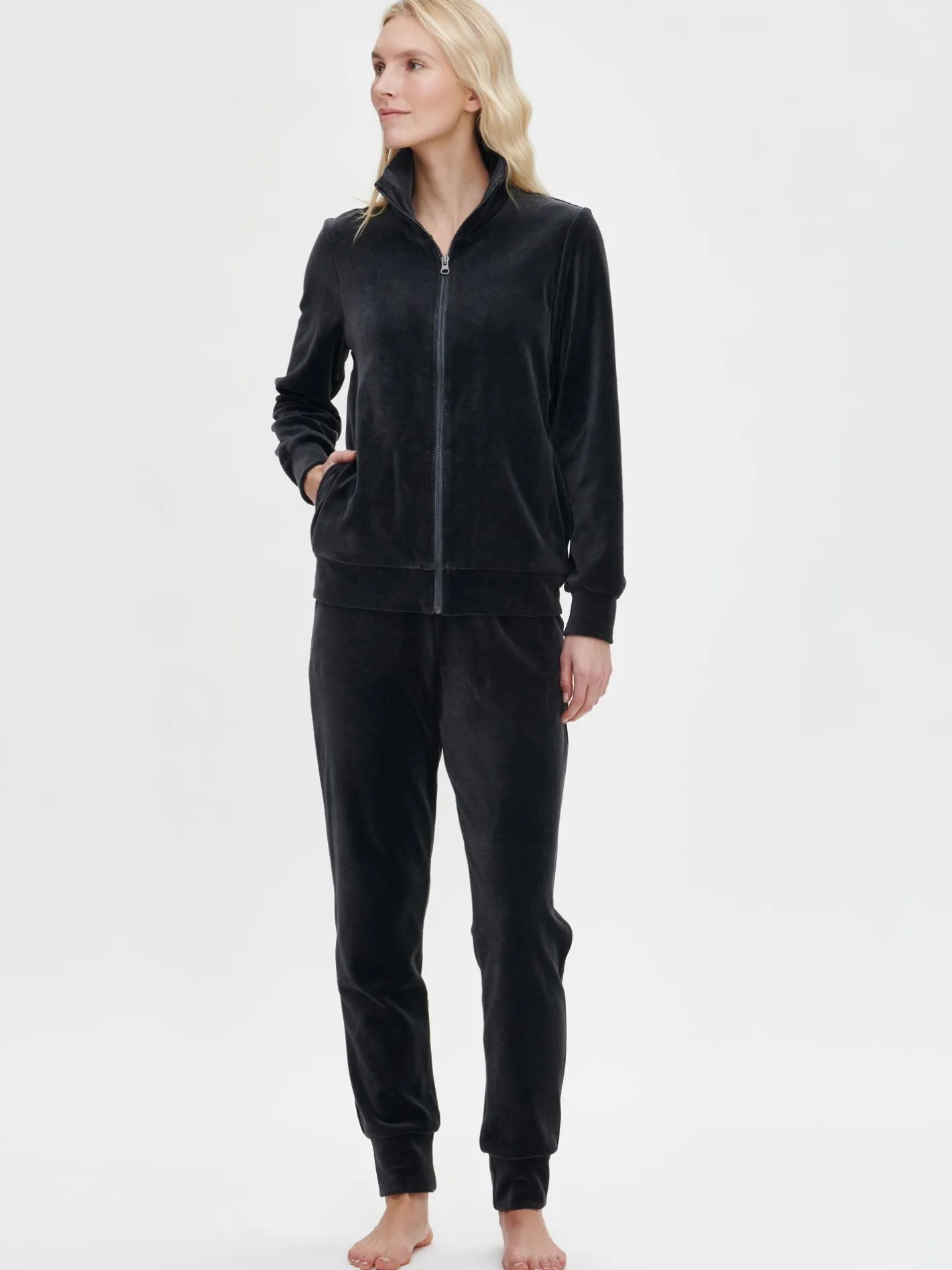 Naisten rento meleeratun harmaa Veluuri-takki pitkillä hihoilla ja pystykauluksella. Takissa on vetoketju ja sivutaskut. Takin pituus koossa M on noin 65 cm. Materiaali on laadukasta ja pehmeää puuvilla-polyesteriveluuria. Materiaalille on ominaista 3-5% kutistuminen ensimmäisessä pesussa.