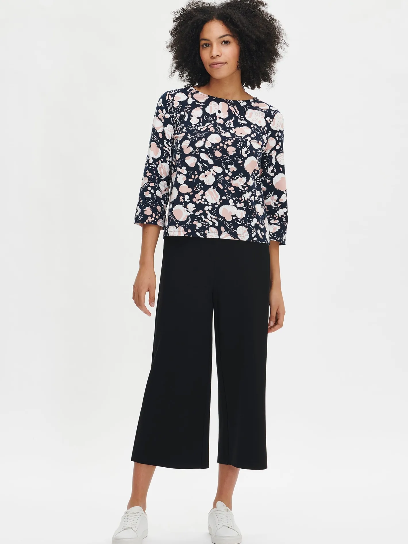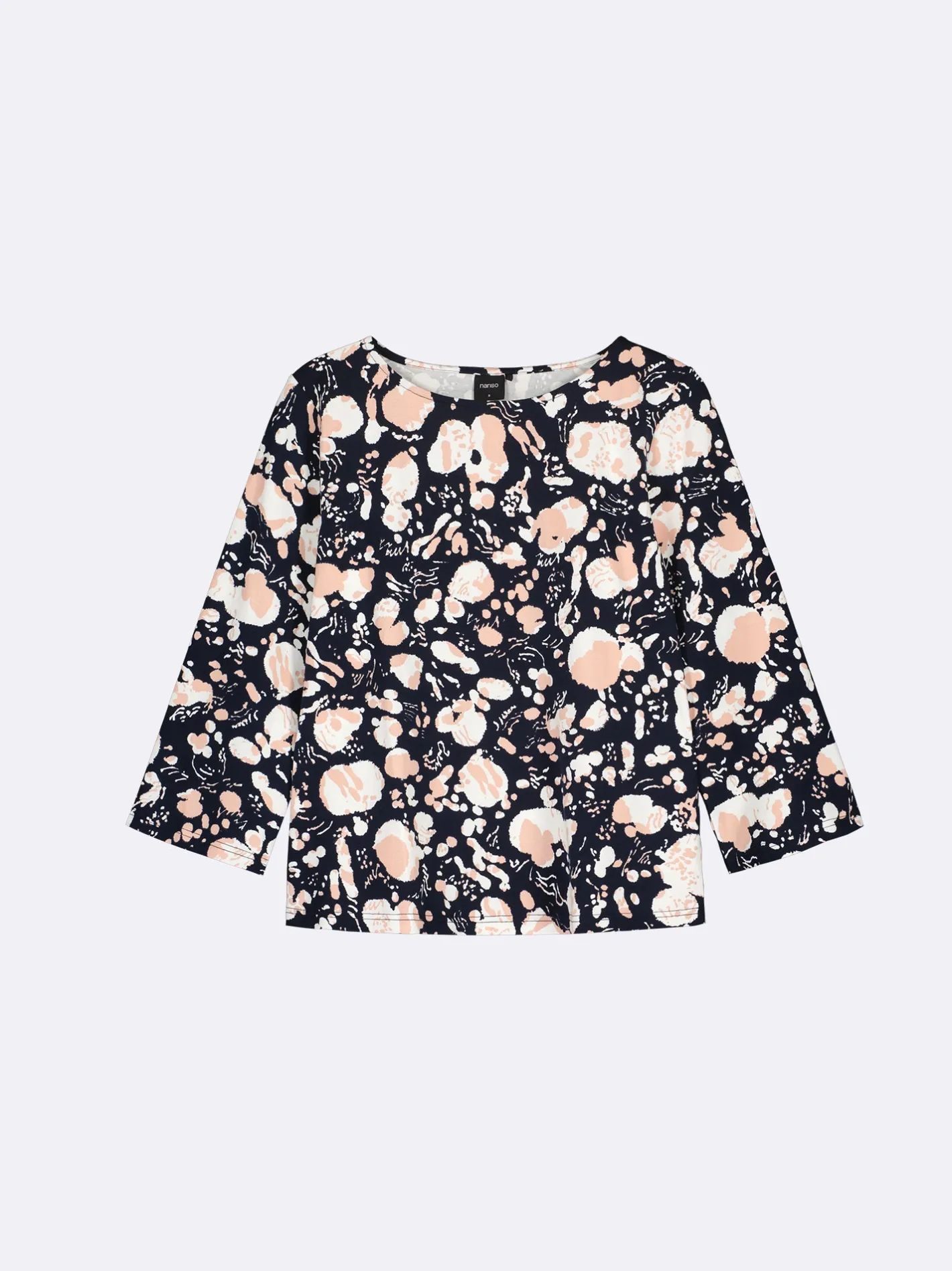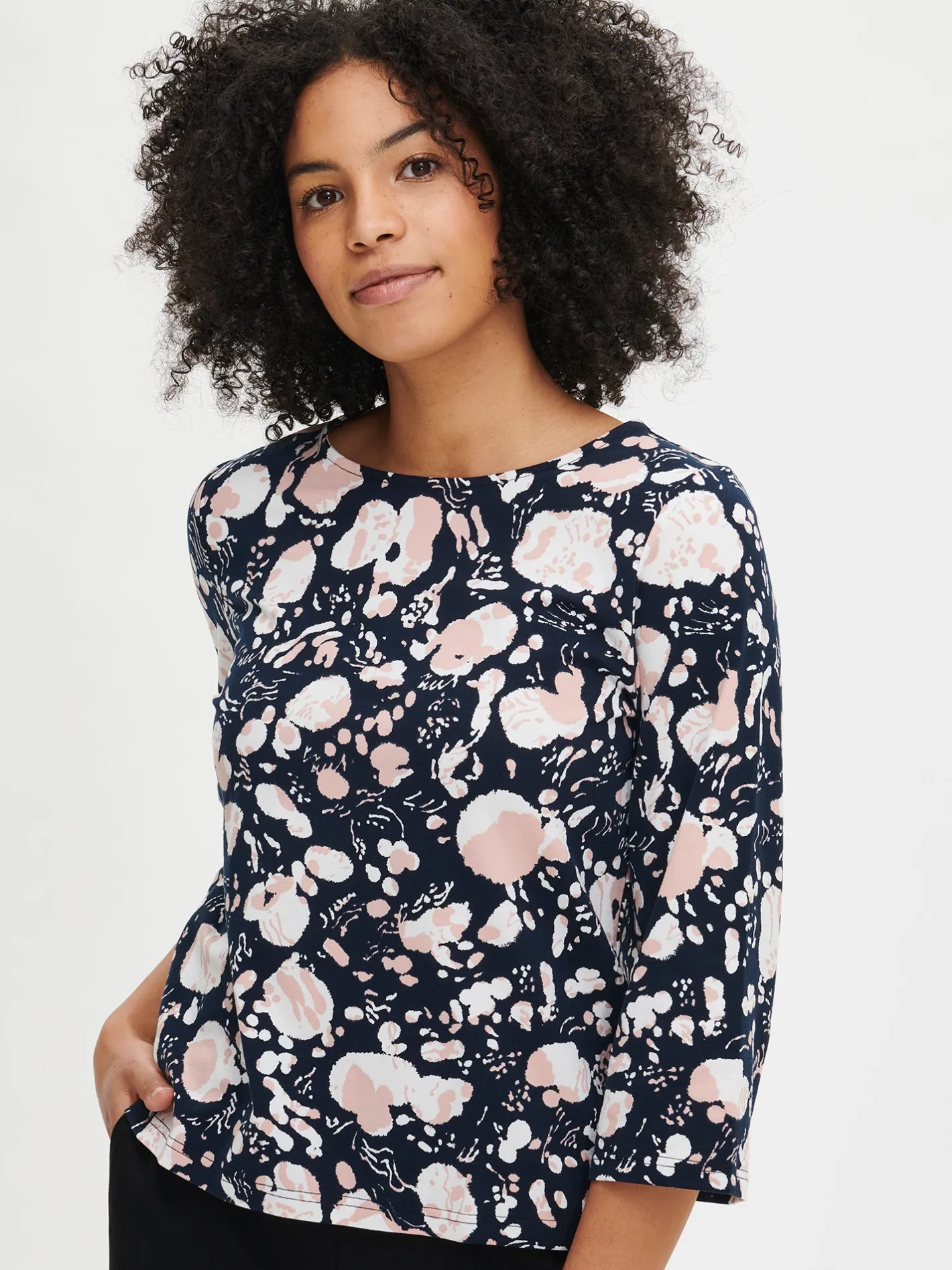 Naisten kuosillinen tummansininen Venla-pusero. Rento ja mukava pusero on ihana vaate arjen pukeutumiseen. Puserossa on kantilla viimeistelty ovaali pääntie ja 3/4 pituiset hihat. Puseron pituus koossa M on noin 62 cm. Materiaali on miellyttävän tuntuista ja helppohoitoista puuvilla-elastaani-neulosta.