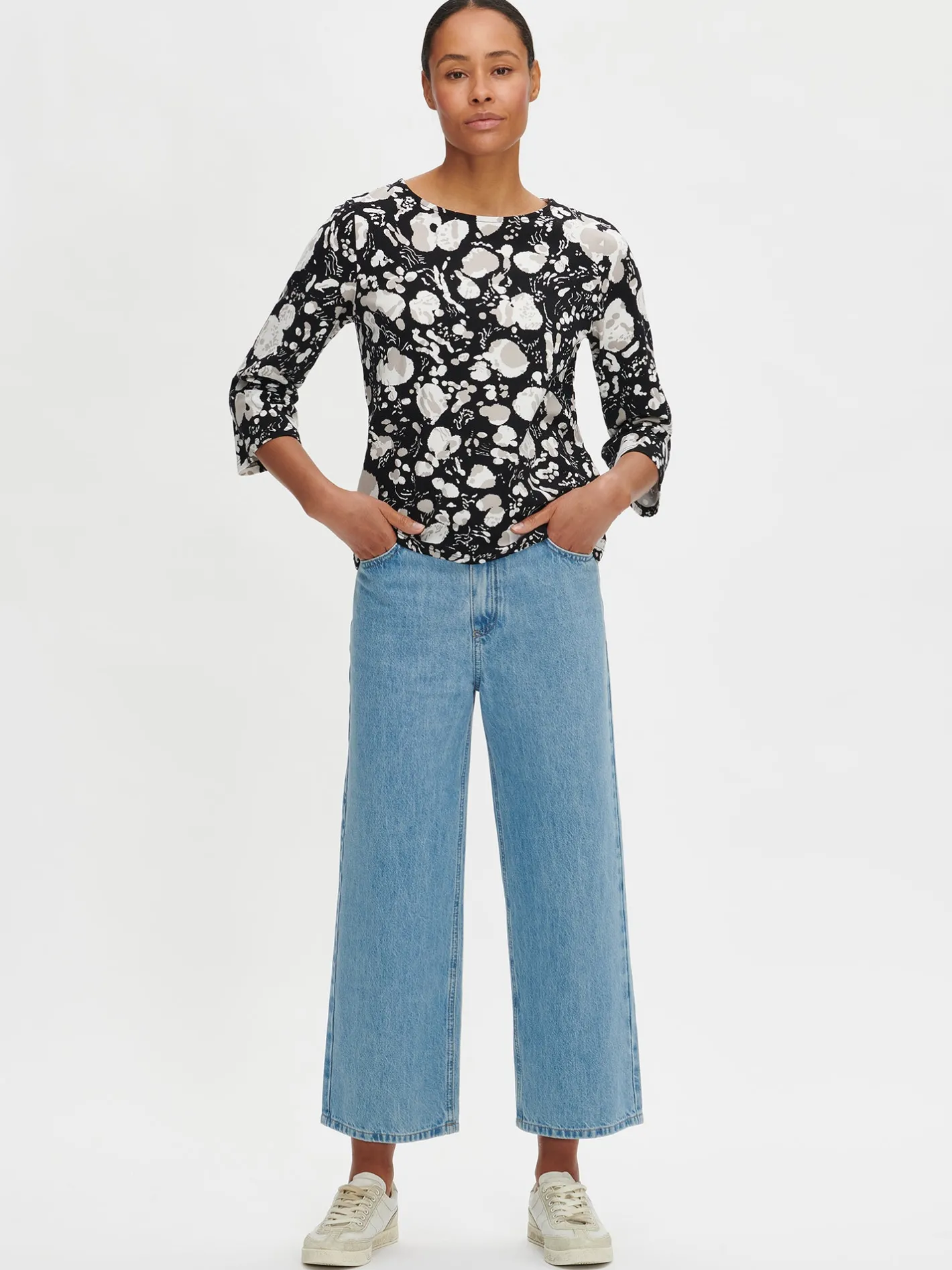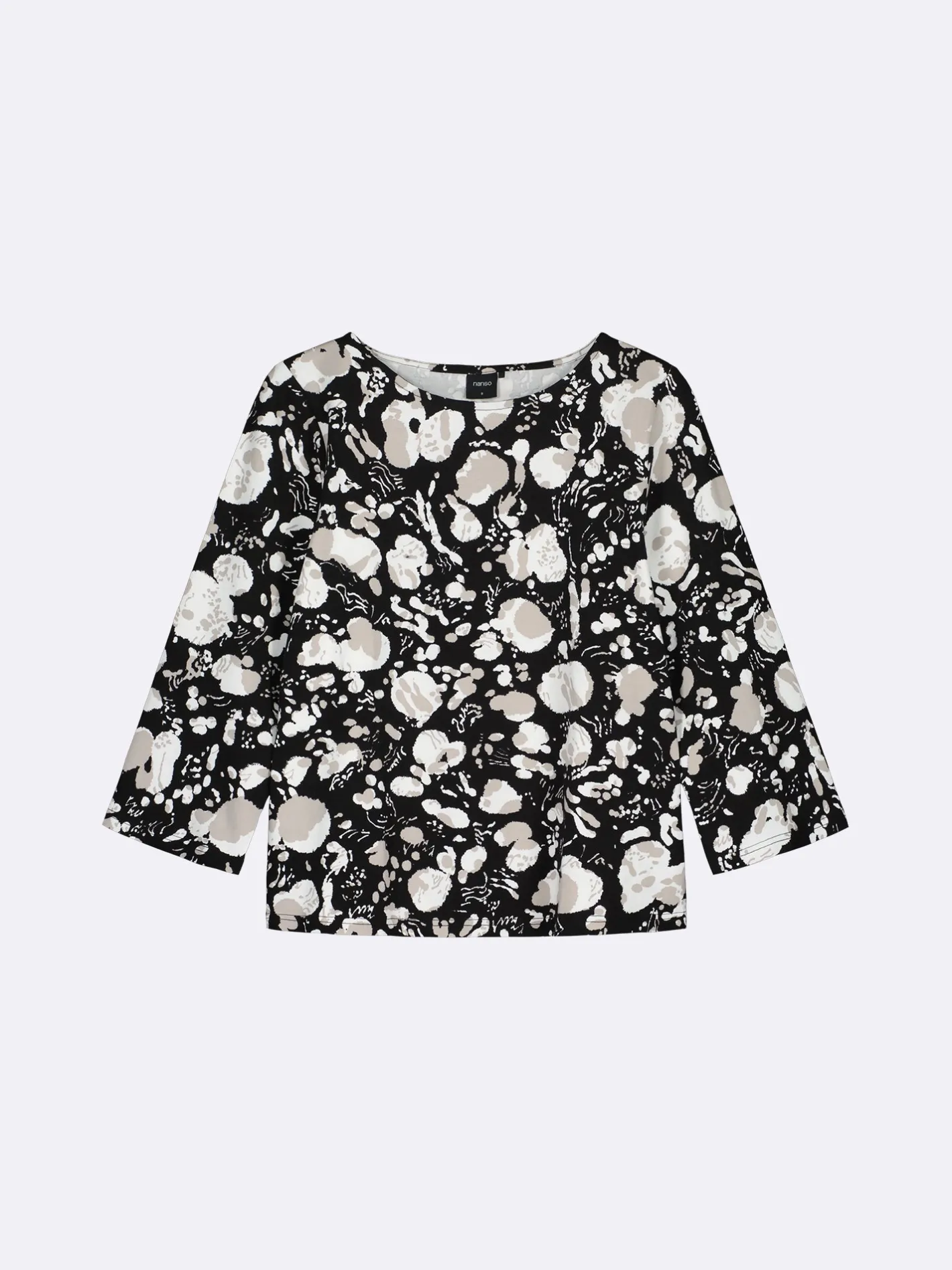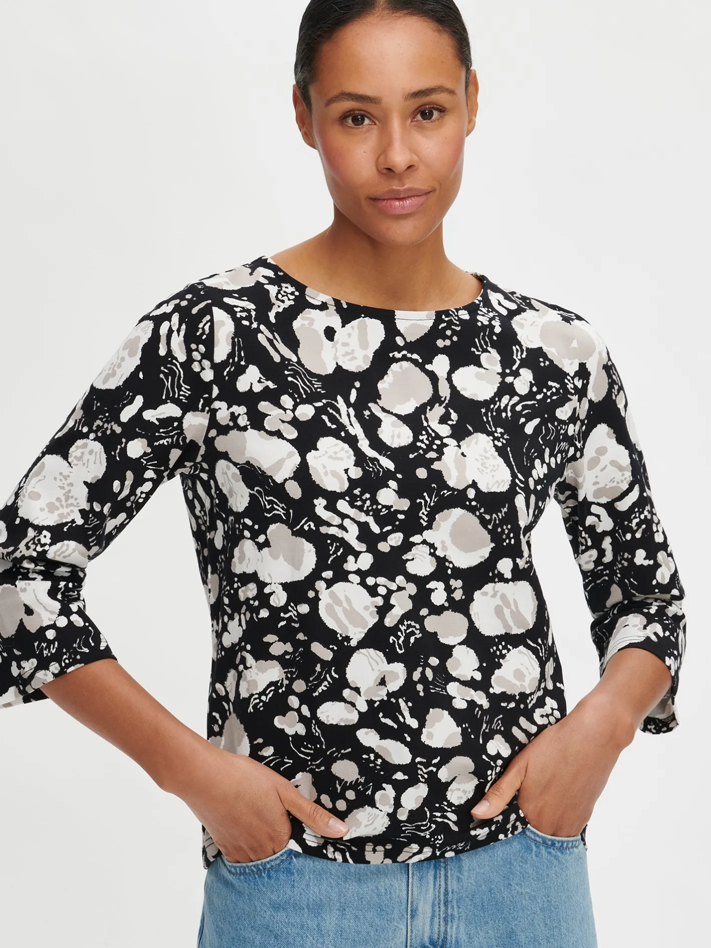 Naisten kuosillinen musta Venla-pusero. Rento ja mukava pusero on ihana vaate arjen pukeutumiseen. Puserossa on kantilla viimeistelty ovaali pääntie ja 3/4 pituiset hihat. Puseron pituus koossa M on noin 62 cm. Materiaali on miellyttävän tuntuista ja helppohoitoista puuvilla-elastaani-neulosta.
