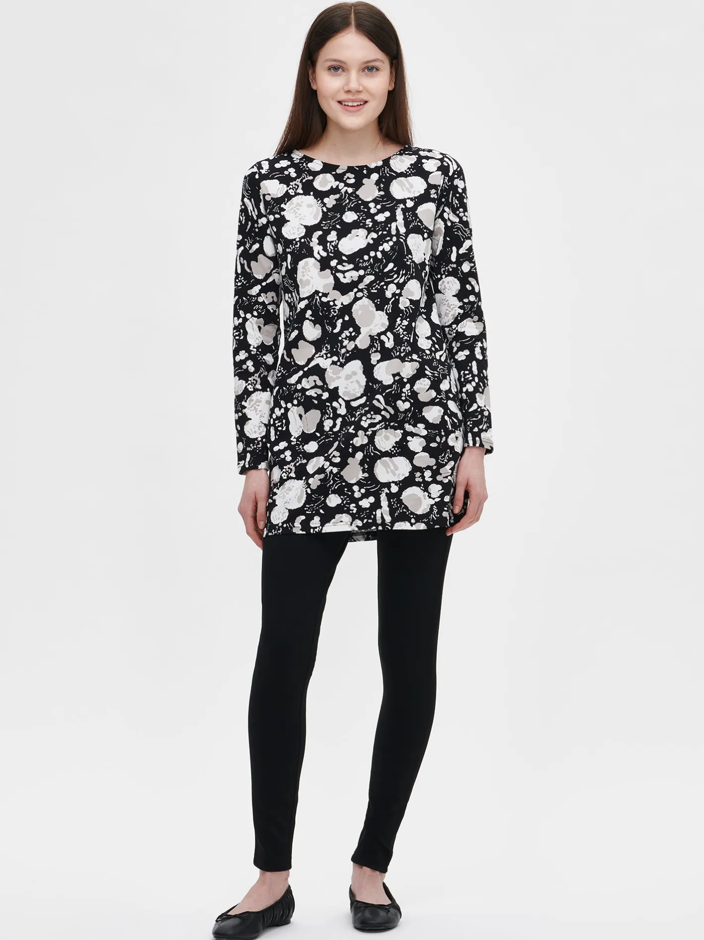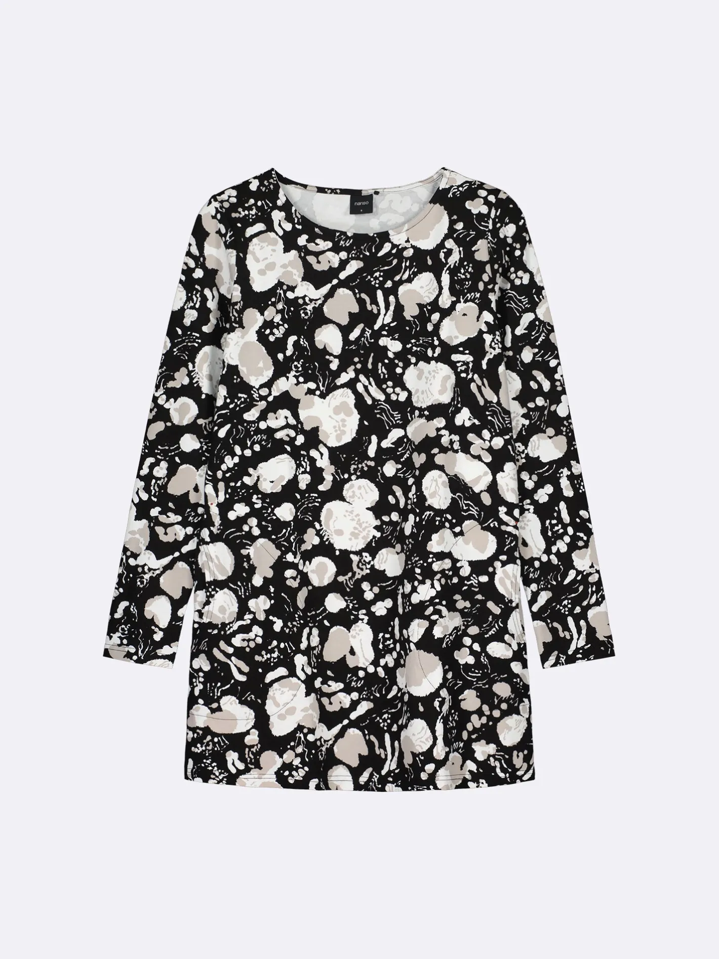 Naisten kuosillinen musta Venla-tunika. Rennossa tunikassa on kantilla viimeistelty ovaali pääntie, taskut sivuissa ja täyspitkät hihat. Tunikan pituus koossa M on noin 80 cm. Materiaali on miellyttävän tuntuista ja helppohoitoista puuvilla-elastaani-neulosta.