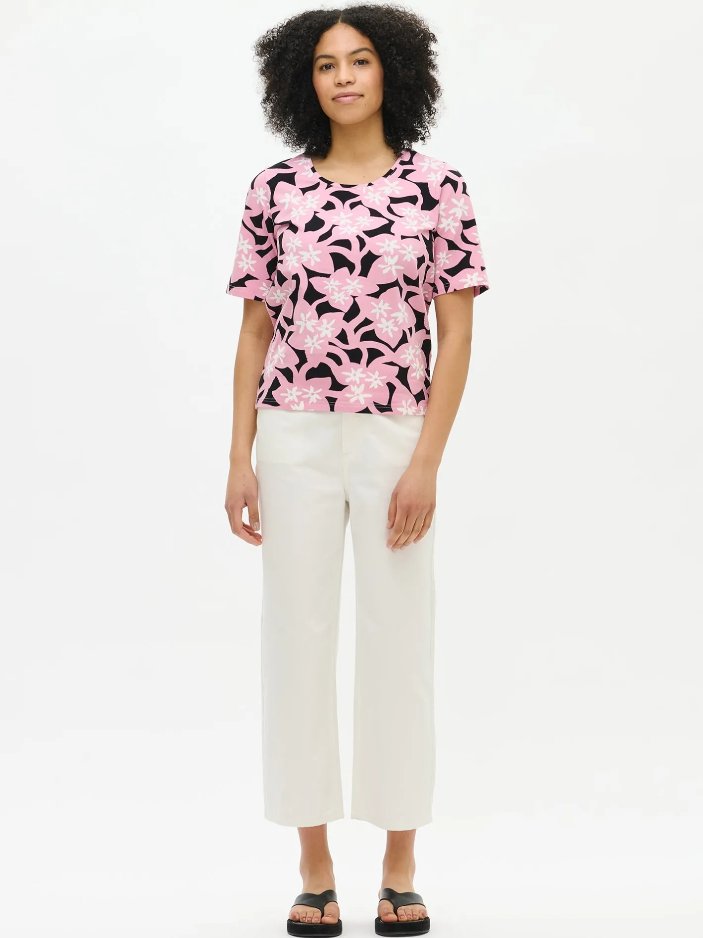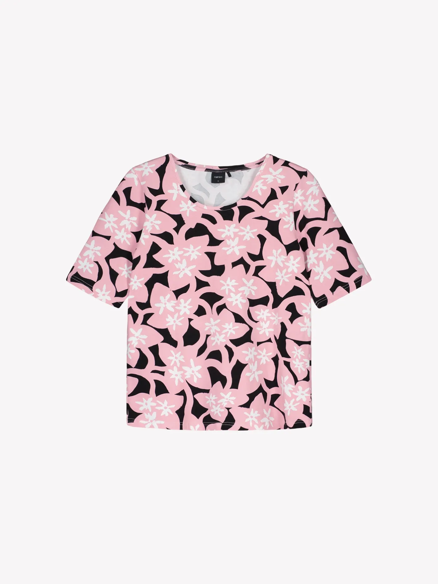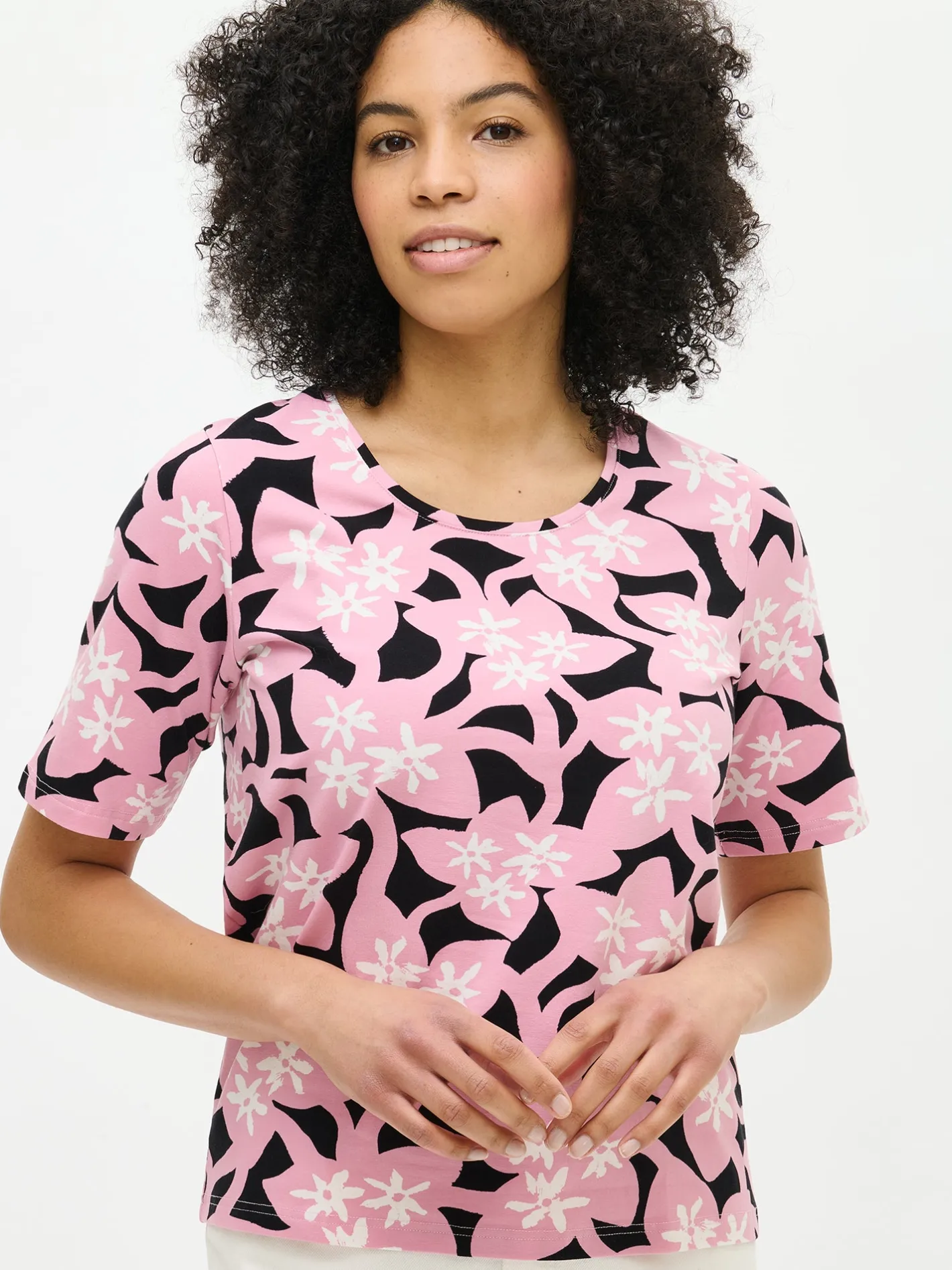 Naisten laadukas kukkakuvioinen vaaleanpunainen Verna-t-paita on ihana kesään. Suoralinjaisessa t-paidassa on avara, pyöreä pääntie ja lyhyet 2/4 pituiset hihat. T-paidan pituus koossa M on noin 64 cm. Materiaali on laadukasta ja helppohoitoista puuvilla-elastaani-neulosta, joka pysyy hyvänä pesusta toiseen.