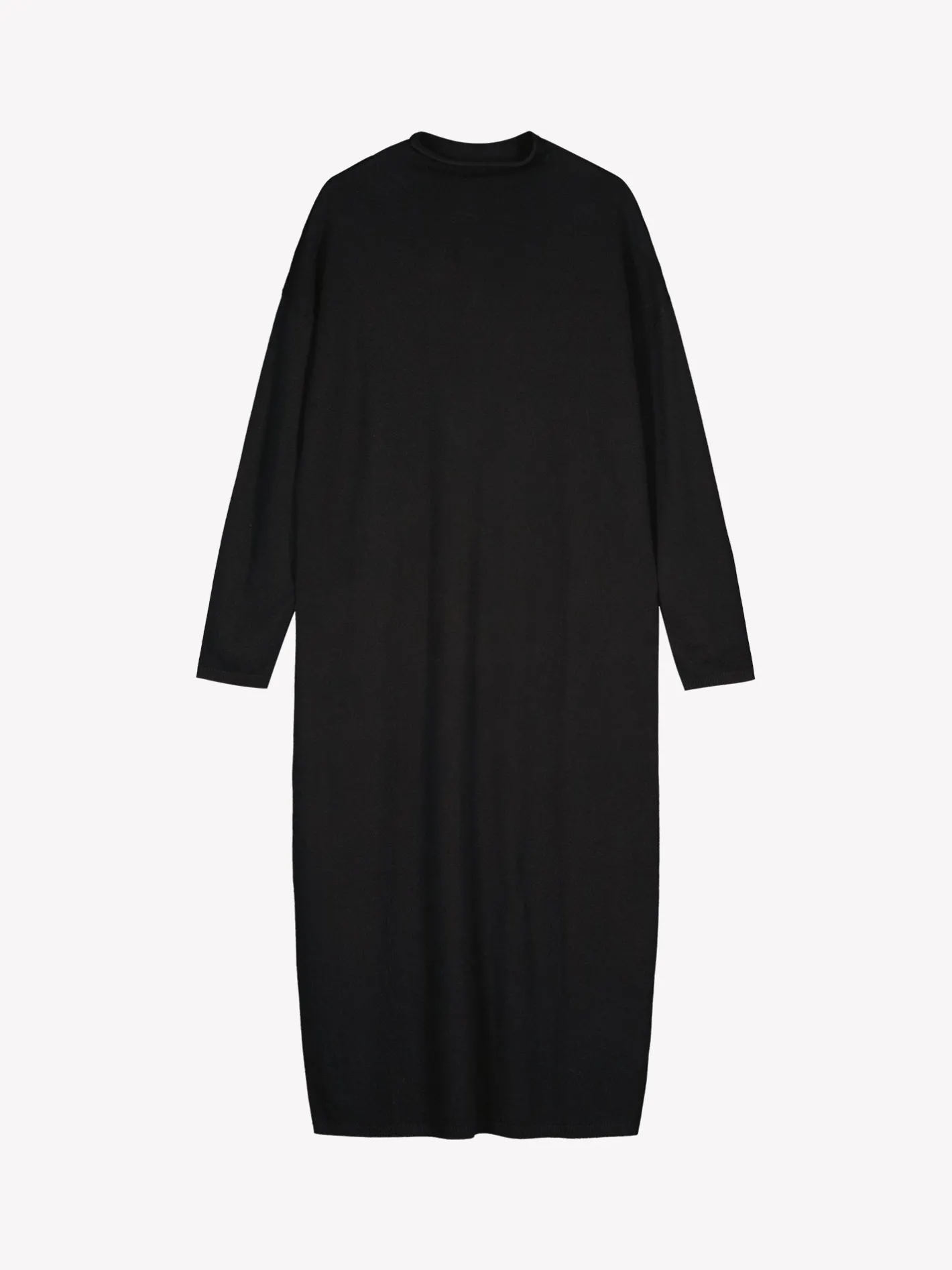 Naisten yksinkertaisen tyylikäs musta Villis-neulemekko. Kauniissa suoralinjaisessa mekossa on leveä kilpikonnakaulus, pudotettu olkalinja ja täyspitkät hihat. Mekon helmassa ja hihansuissa on kapea resori. Mekon pituus koossa M on noin 120 cm. Materiaali on laadukasta merinovillan ja puuvillan sekoitetta. Tuotteen valmistuksessa on käytetty mulesing-vapaata merinovillaa.
