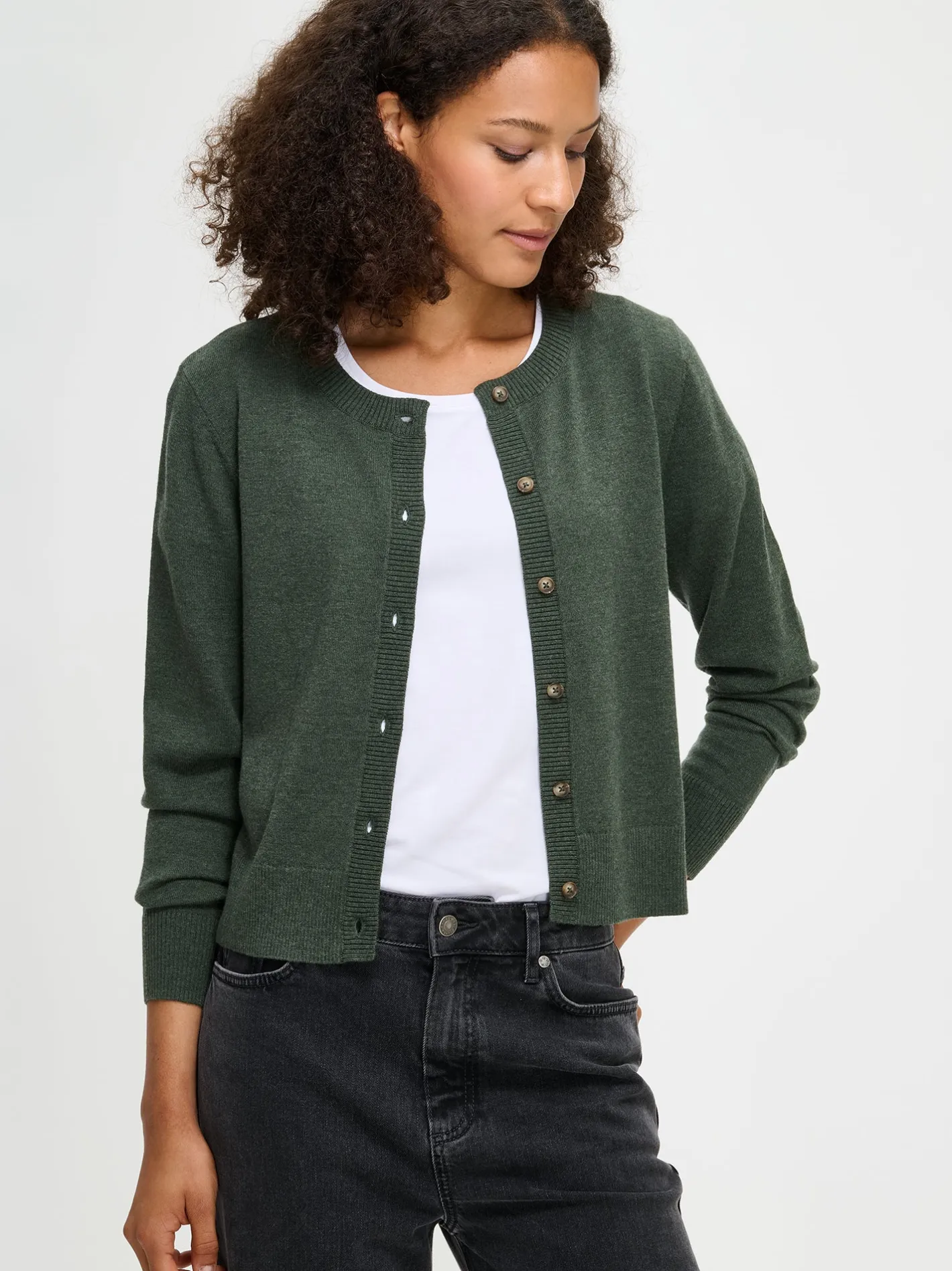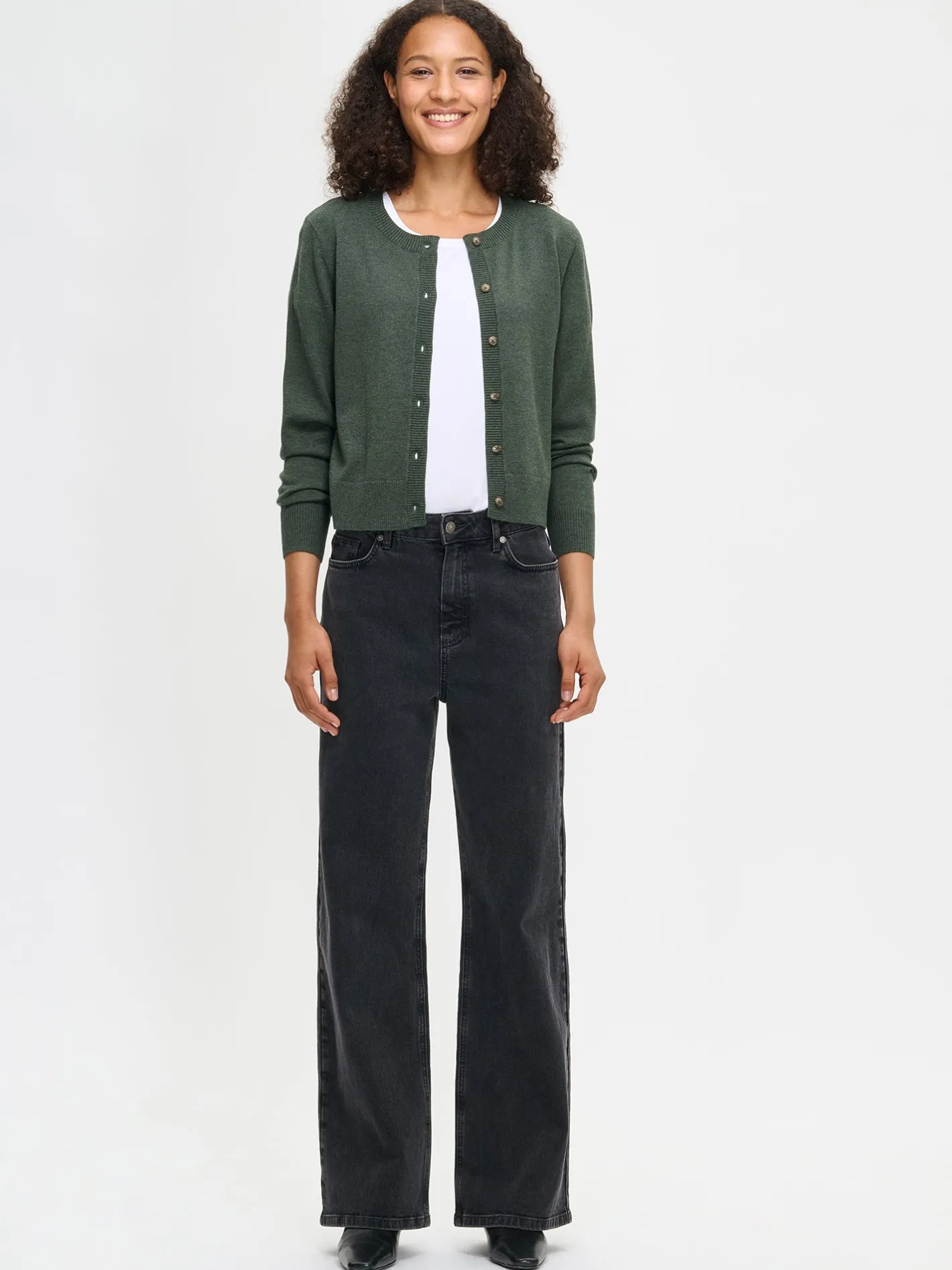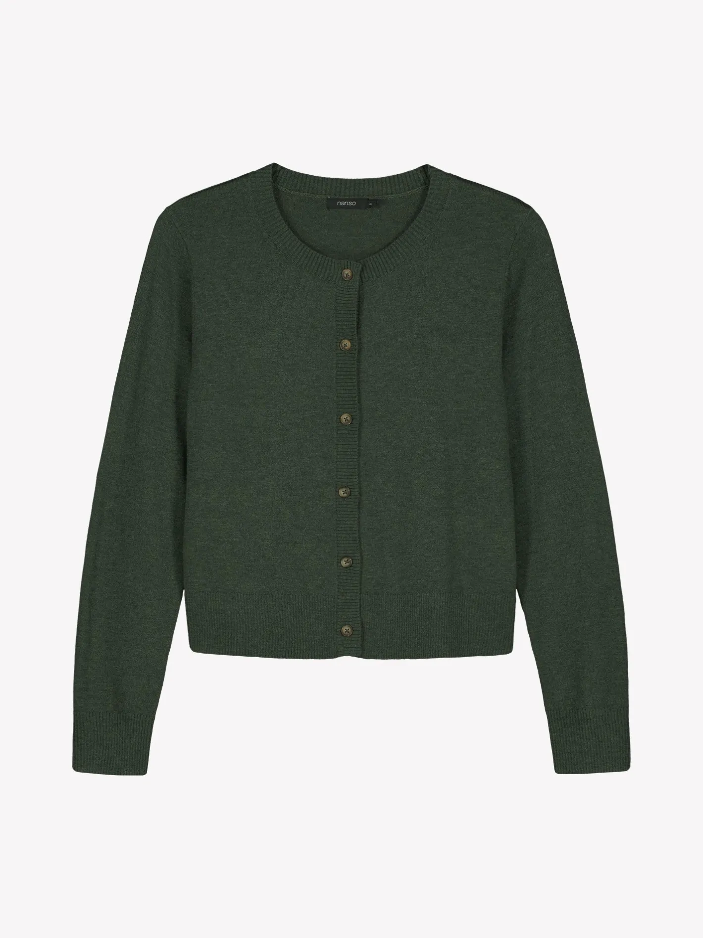 Naisten tumma oliivinvihreä Villis-neuletakki. Mukava neuletakki on neulottu laadukkaasta merinovillan ja puuvillan sekoitteesta. Neuletakissa on edessä napitus sekä resori helmassa ja hihansuissa. Neuleen suorat hihat ovat täyspitkät. Neuletakin pituus koossa M on noin 55 cm. Tuotteen valmistuksessa on käytetty sertifioitua mulesing-vapaata merinovillaa. Neuleen hoito-ohjeet löydät