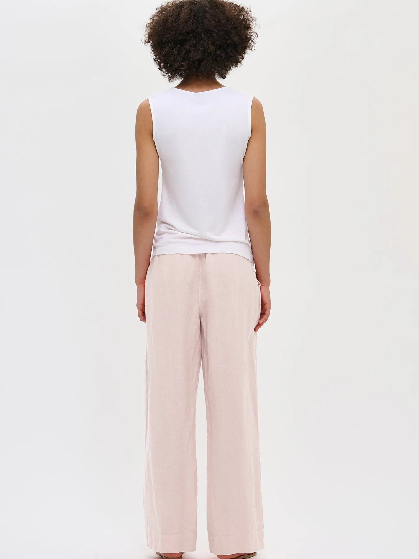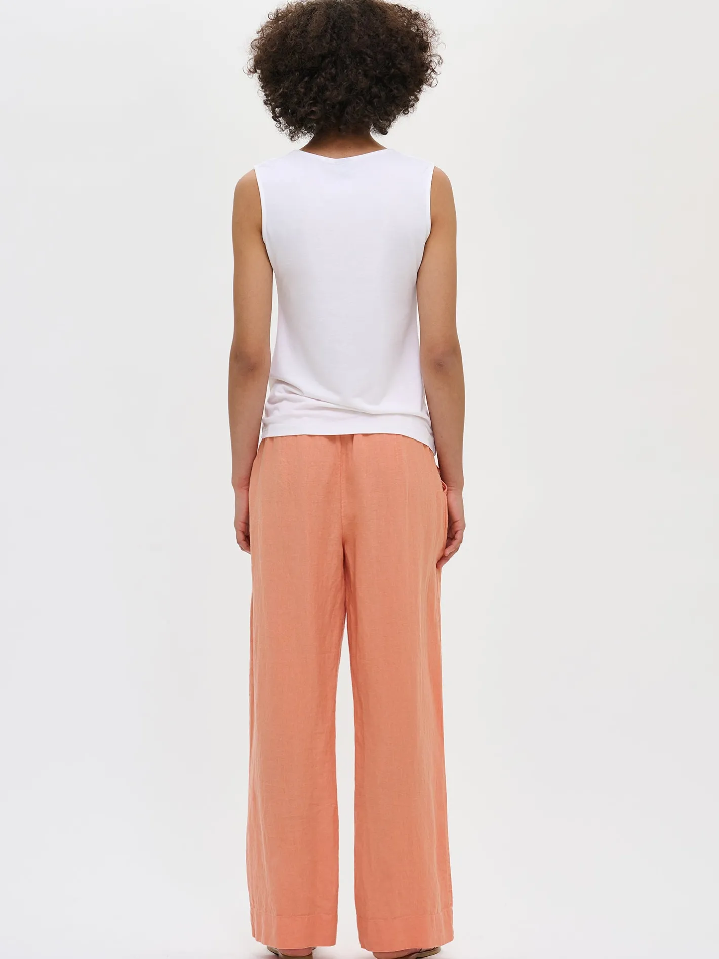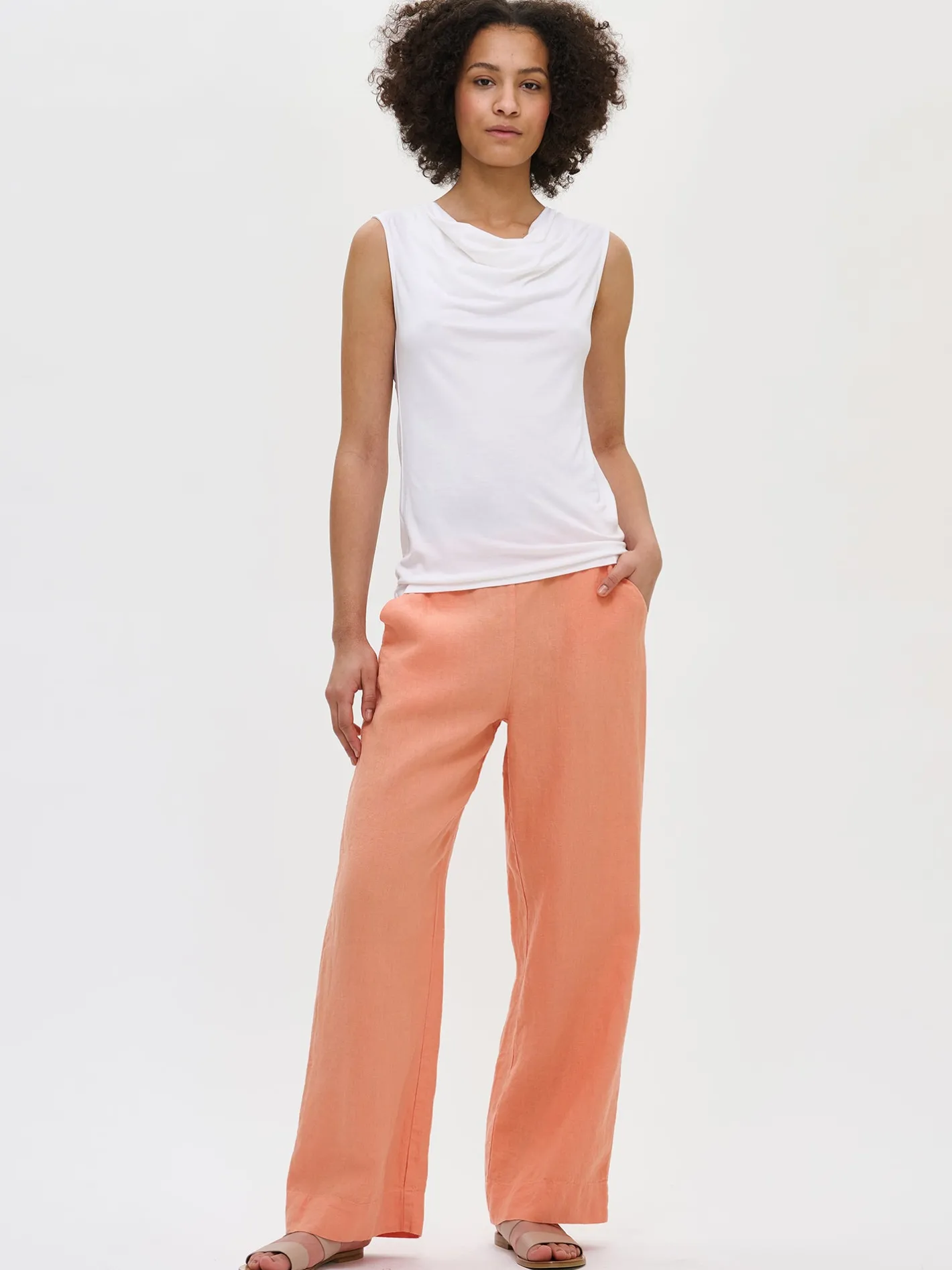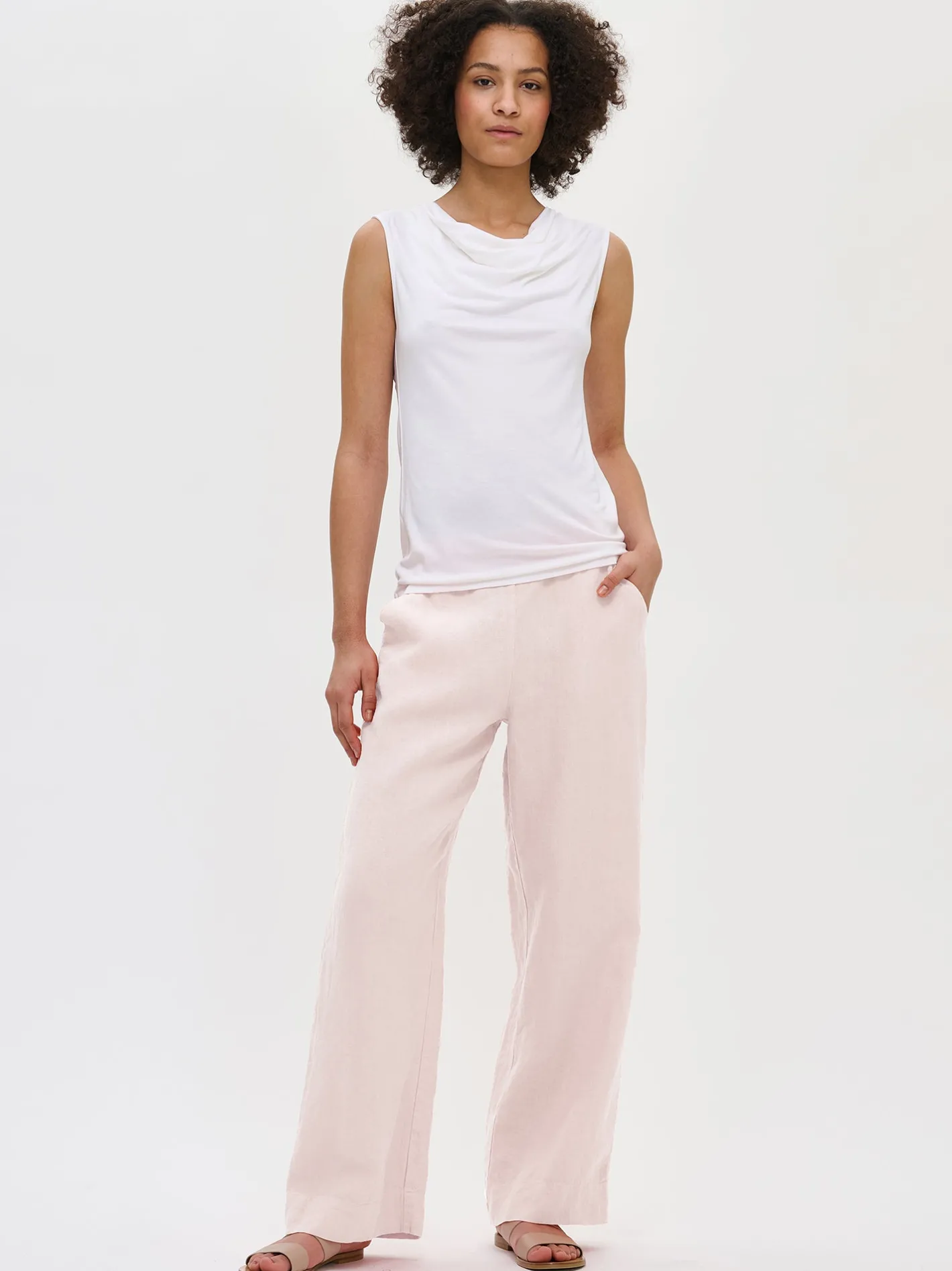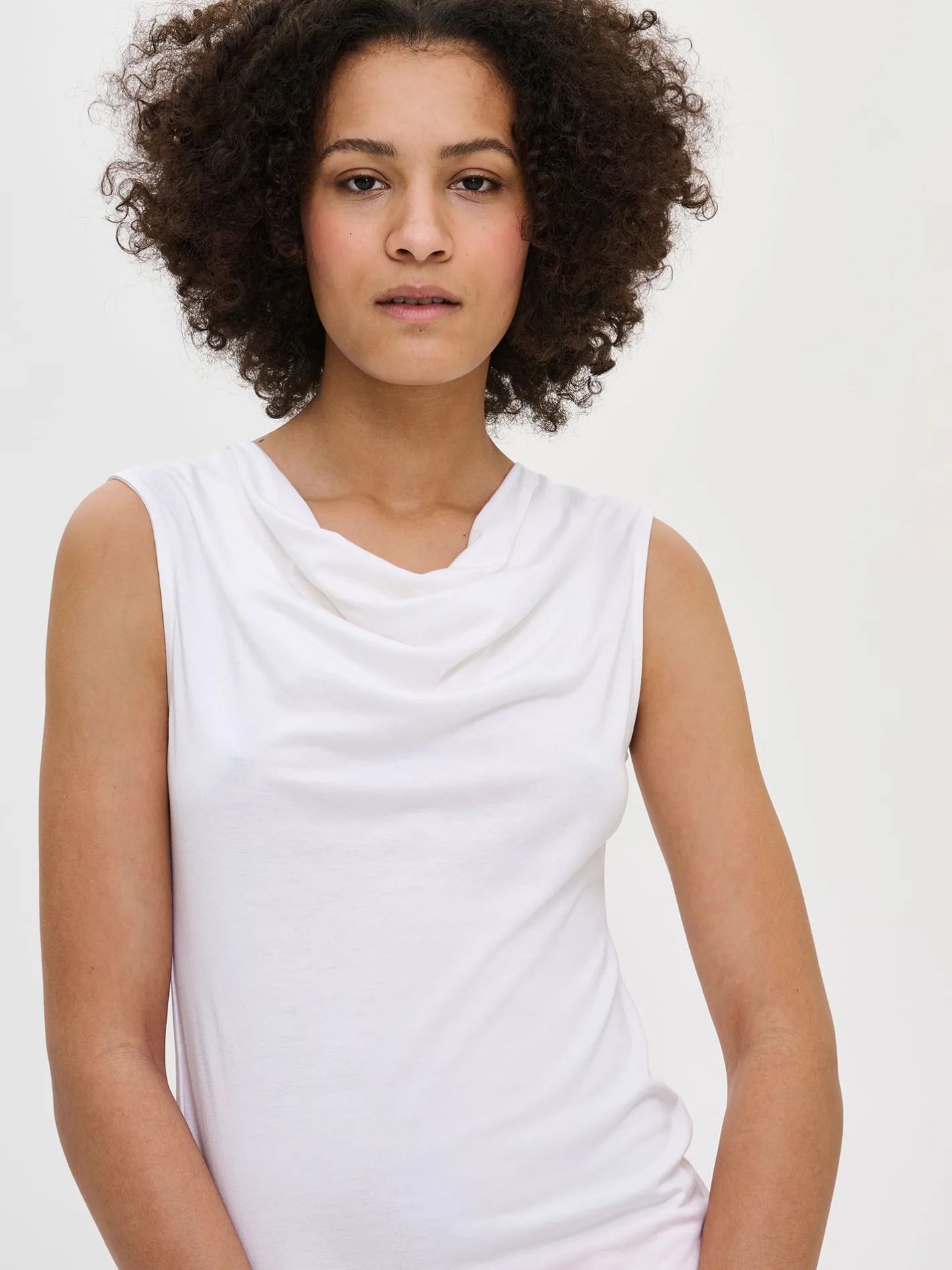 Naisten tyylikäs valkoinen Vivian-toppi. Hihattomassa topissa on kauniisti laskeutuva putouspääntie. Topin pituus koossa M on noin 65 cm. Materiaali on laadukasta ja miellyttävän tuntuista, ohutta viskoosi-elastaani-neulosta. Viskoosineulos on sähköistymätöntä ja helppohoitoista. Tuote on valmistettu LENZING™ ECOVERO™ -viskoosista. Materiaalille on ominaista 3-5% kutistuminen ensimmäisessä pesussa.