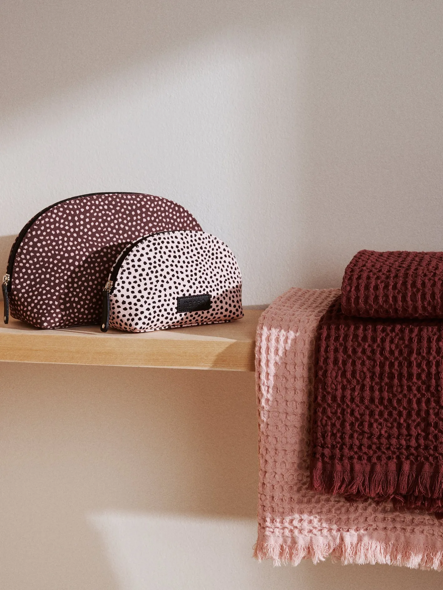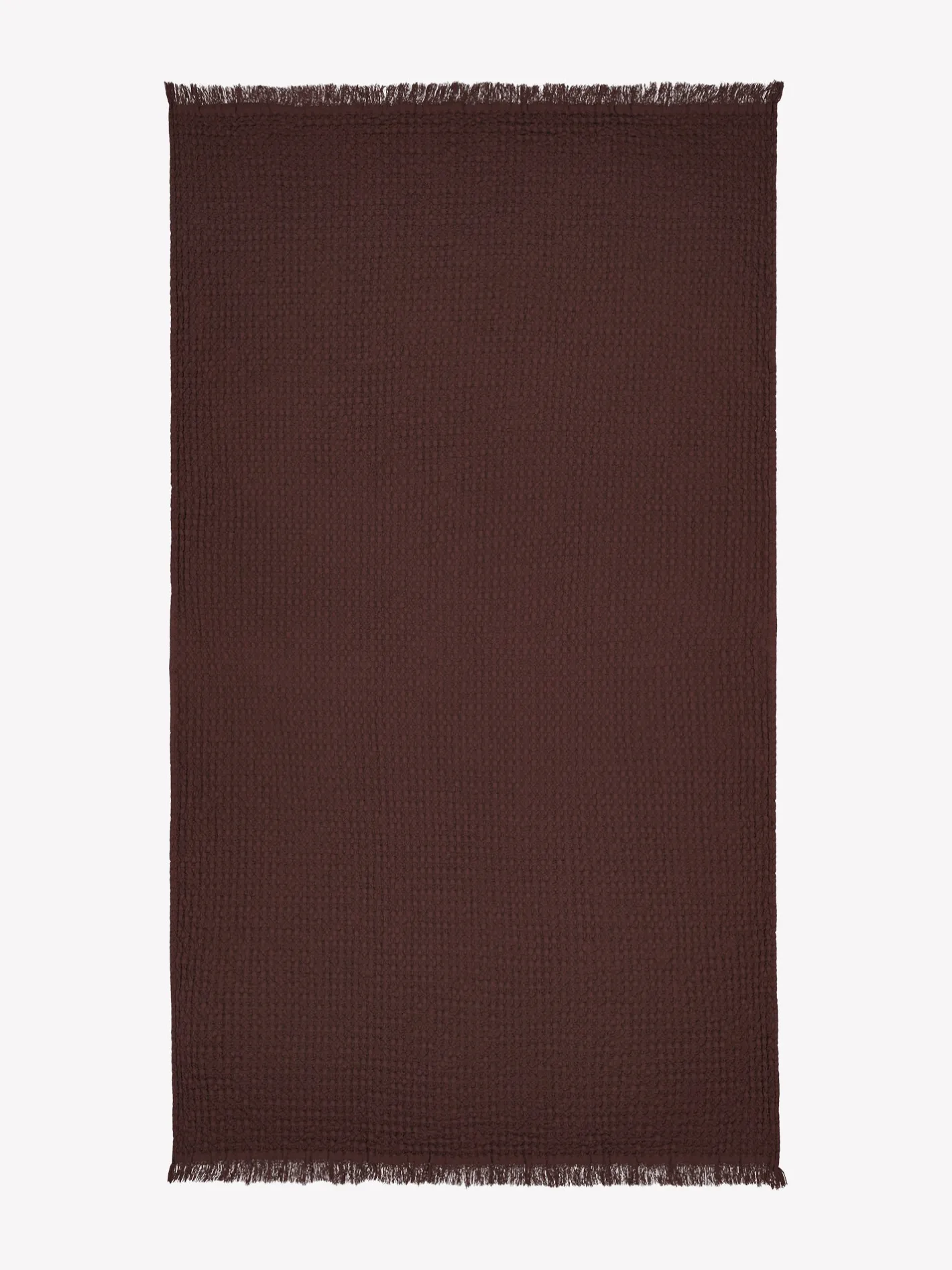 Nanson laadukas tummanruskea Vohveli-kylpypyyhe. Vohveli-pyyhkeessä yhdistyvät nostalgisen vohvelikankaan hyvät ominaisuudet ja moderni ulkonäkö. Vohvelikangas imee hyvin kosteutta ja kuivuu nopeasti keveytensä ansiosta. Pyyhe menee pieneen tilaan ja on helppo pakata rannalle tai salille mukaan. Laadukas pyyhe tuntuu miellyttävältä iholla ja hoito-ohjeita noudattamalla se pysyy pitkään upeana. Kangas on värjätty Öko-Tex 100 -standardin mukaisilla värjäysaineilla. Kylpypyyhkeen koko on 70 cm x 140 cm ja ripustuslenkki on pitkällä sivulla. Pyyhkeen reunassa on koristeelliset hapsut.