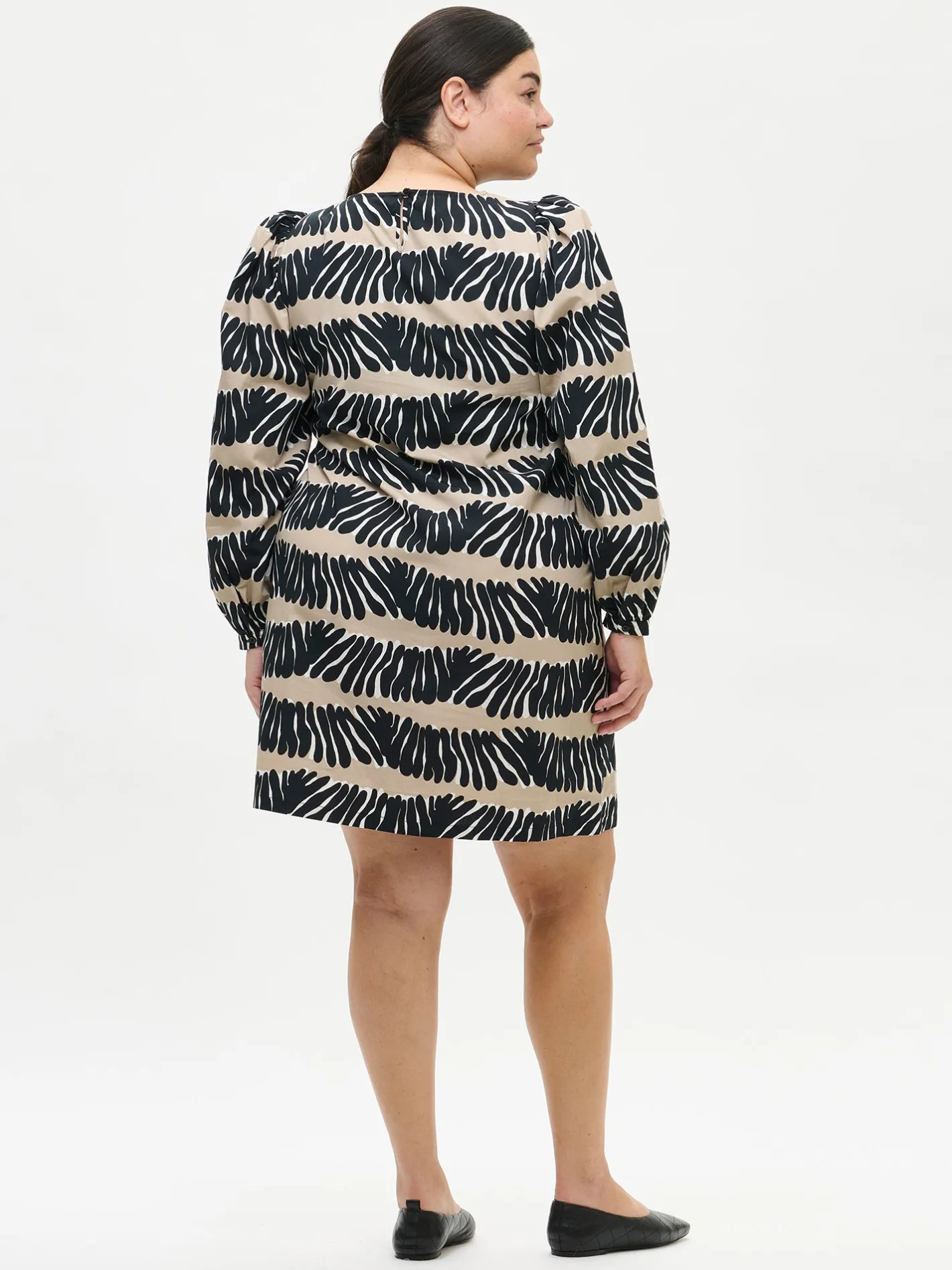 Naisten kuosillinen beige Vuono-mekko. Mekossa pyöreä pääntie, jossa takana halkio ja nappikiinnitys. Täyspitkät hihat poimuttuvat olalla ja hihansuun kaitaleen yläpuolella. Mekon sivuissa on taskut. Mekon pituus koossa 38 on noin 98 cm. Materiaali on kevyttä, mutta ryhdikästä puuvilla-popliinia. Materiaalille on ominaista 3-5% kutistuminen ensimmäisessä pesussa.