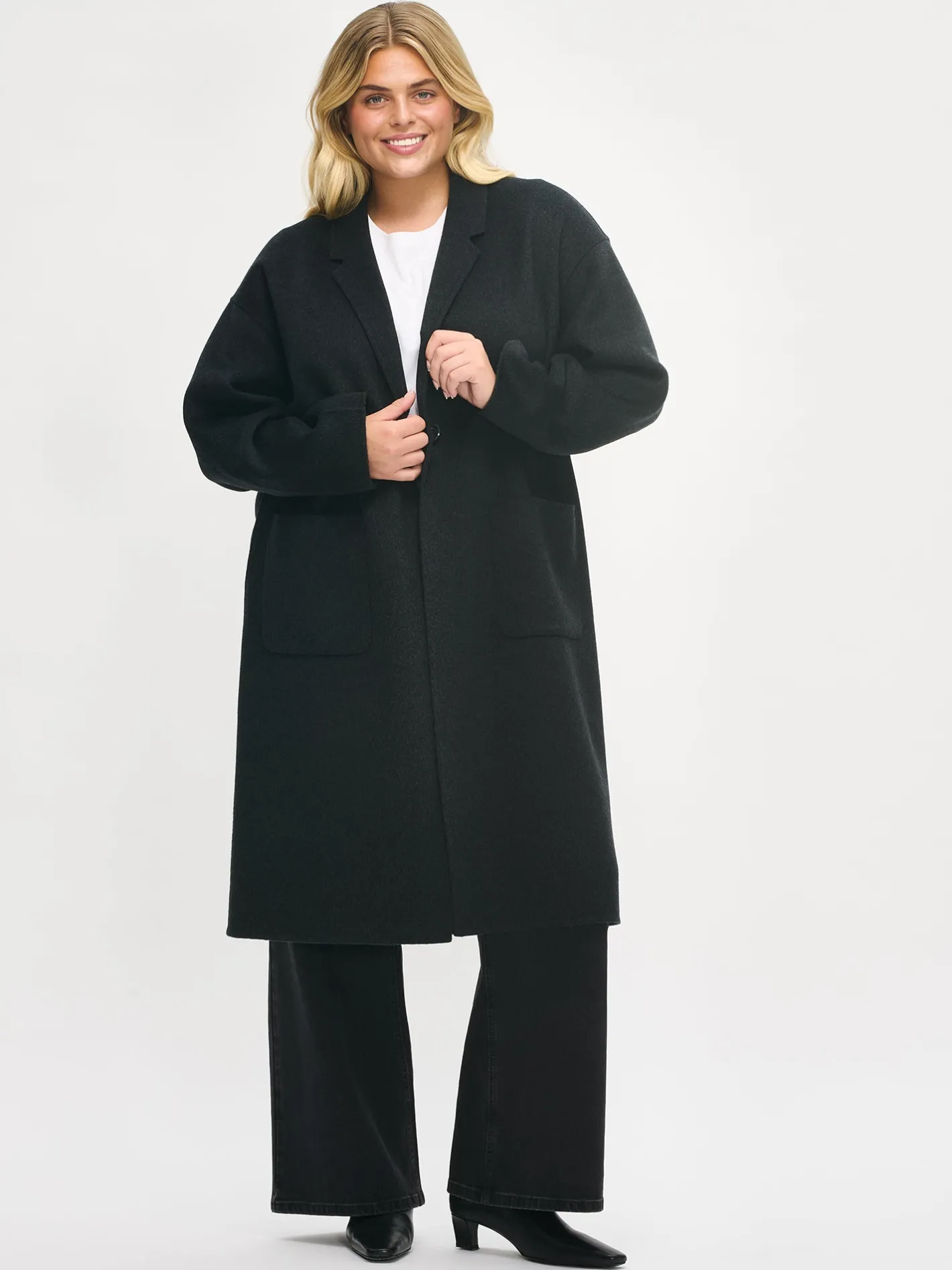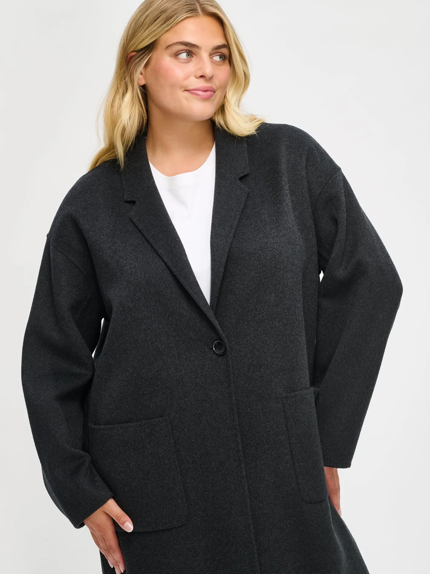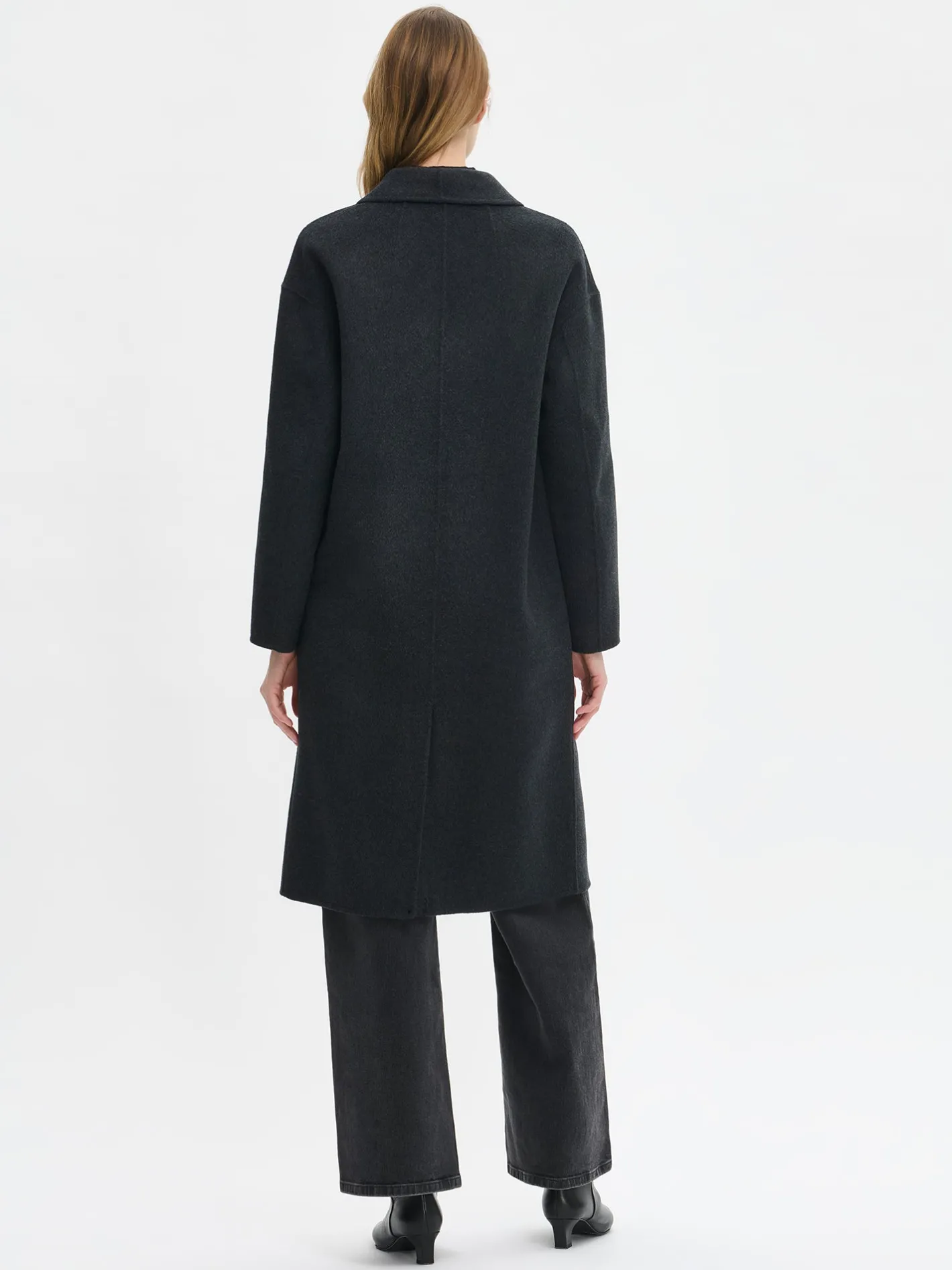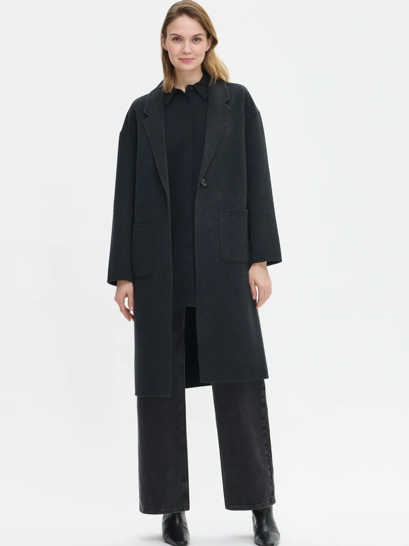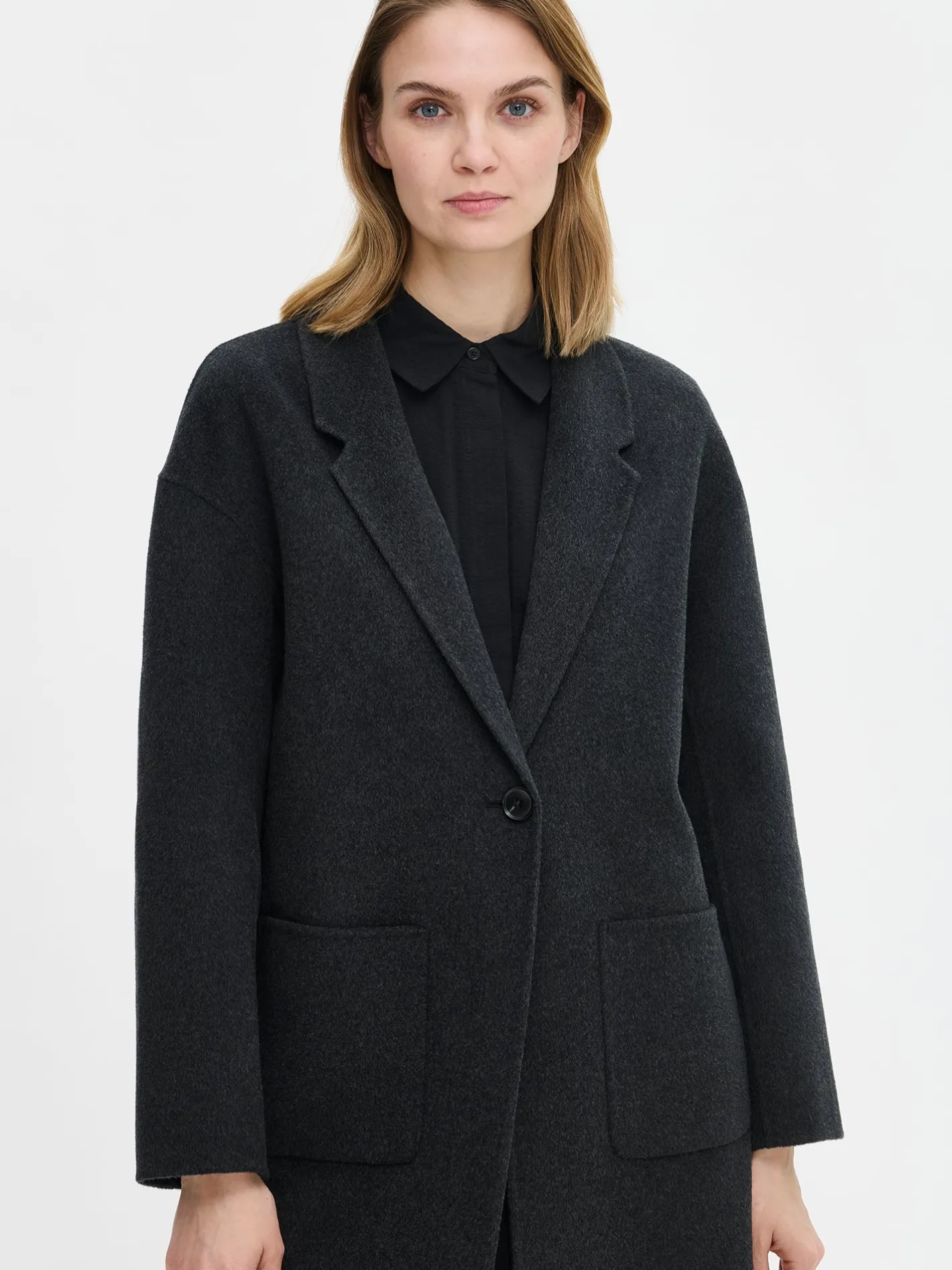 Tyylikäs ja klassinen tummanharmaa Ylle-villakangastakki on täydellinen valinta, kun haluat pukeutua sekä mukavasti että elegantisti. Laadukkaasta villa-polyesterisekoitteesta valmistettu takki tuntuu miellyttävältä yllä ja kestää käyttöä vuodesta toiseen. Vuorittoman villakangastakin saumat ovat kauniisti sisältä ja ulkoa huolitellut. Takissa on edessä nappikiinnitys ja käytännölliset päällitaskut. Suoralinjainen leikkaus ja takahalkio takaavat hyvän istuvuuden ja liikkumavapauden. Takin pituus koossa M on noin 110 cm, joka tekee siitä täydellisen yhdistettävän niin housujen kuin mekkojen kanssa – kerrospukeutumista unohtamatta.